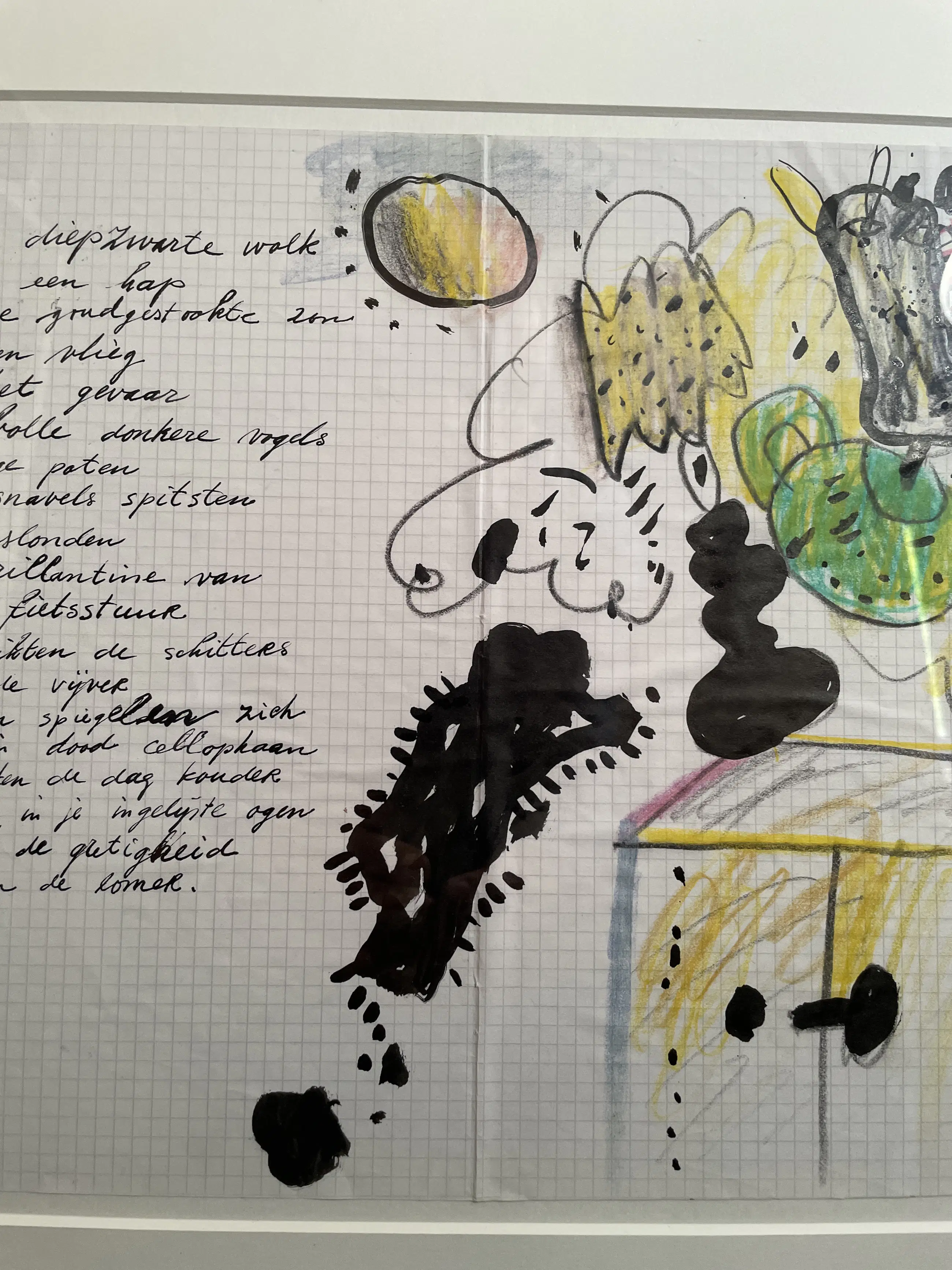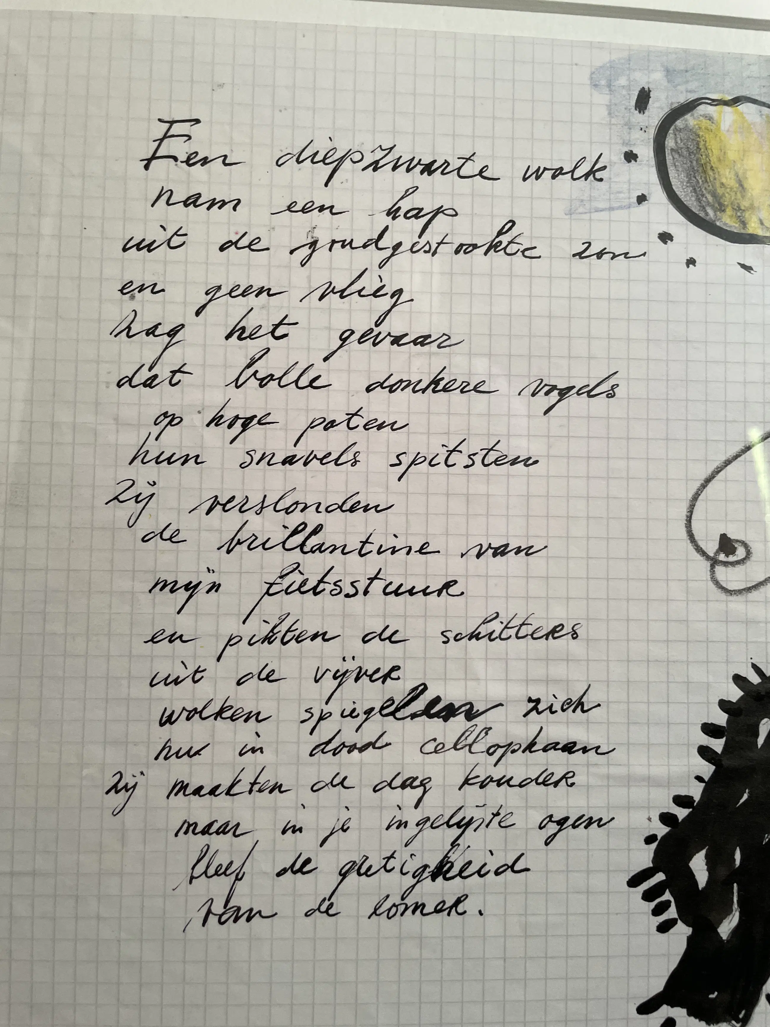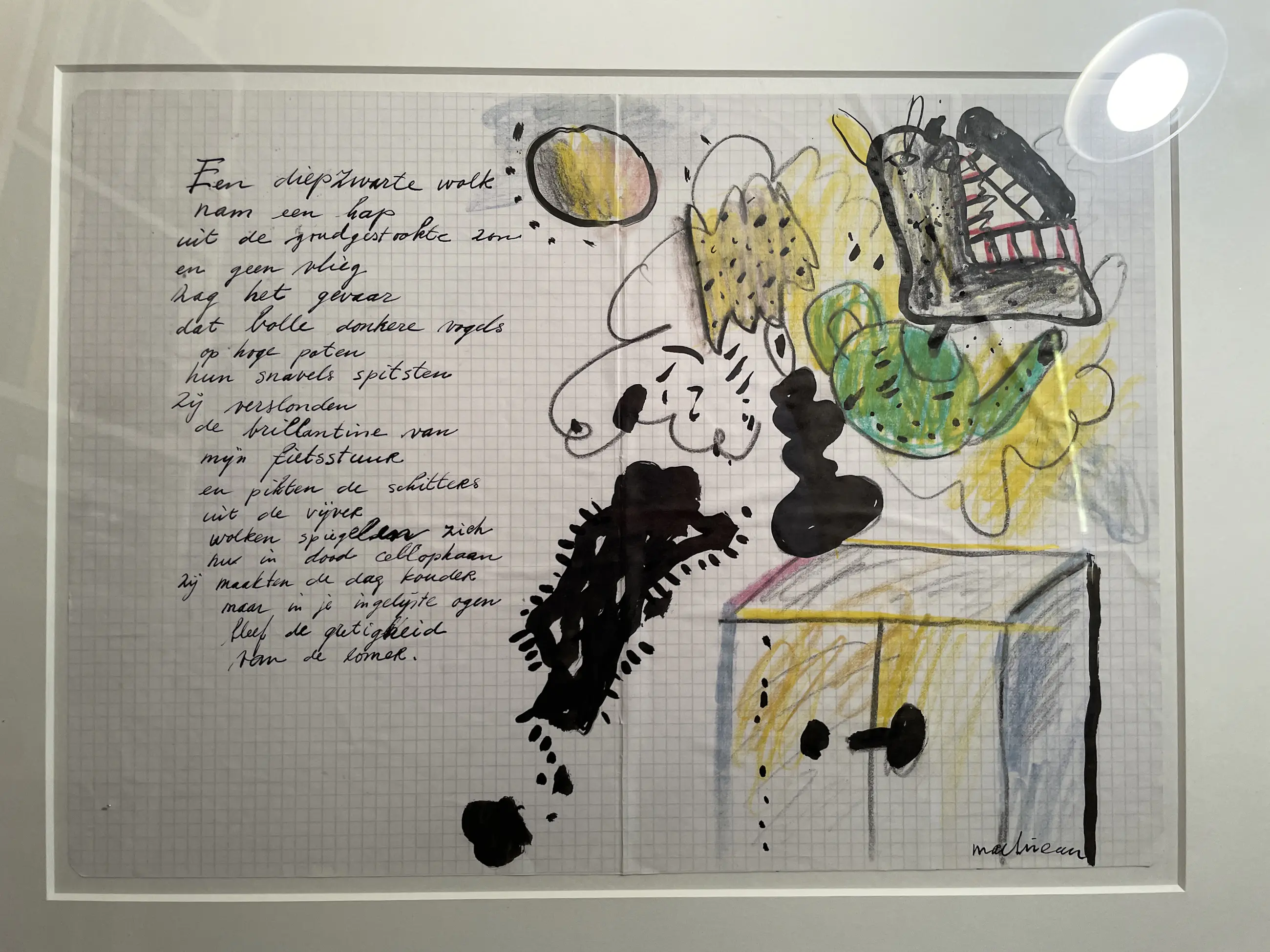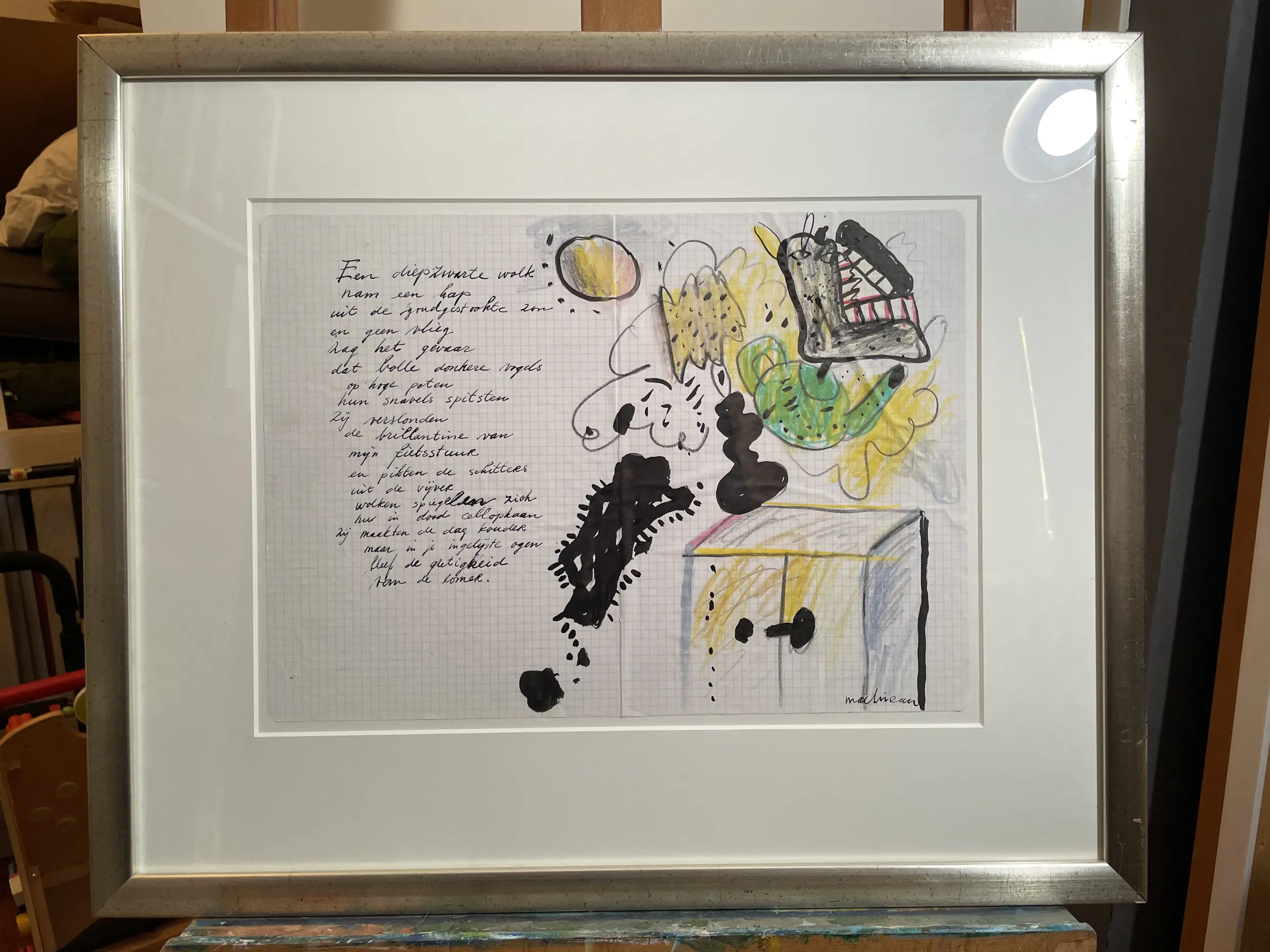 Tekening op papier met gedicht van Anton Martineau. Ingelijst achter glas met een houten lijst met een metaalachtige uitstraling. De lijst is netjes maar niet meer perfect.