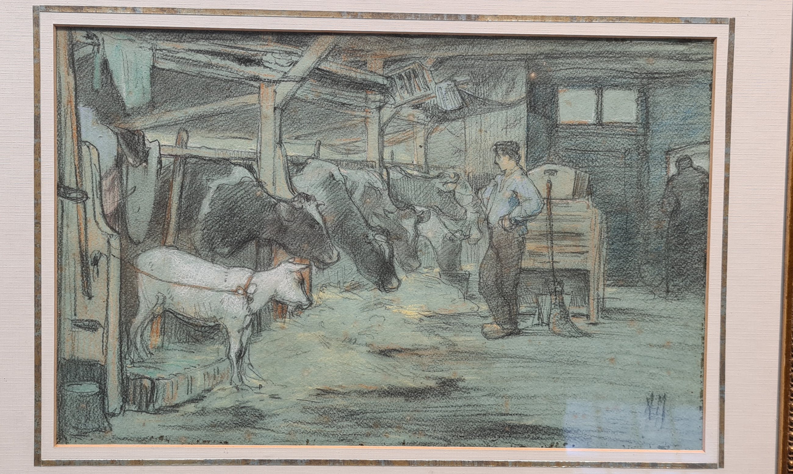 Tekening, de boer kijkt hoe het vee eet. Monogram ro