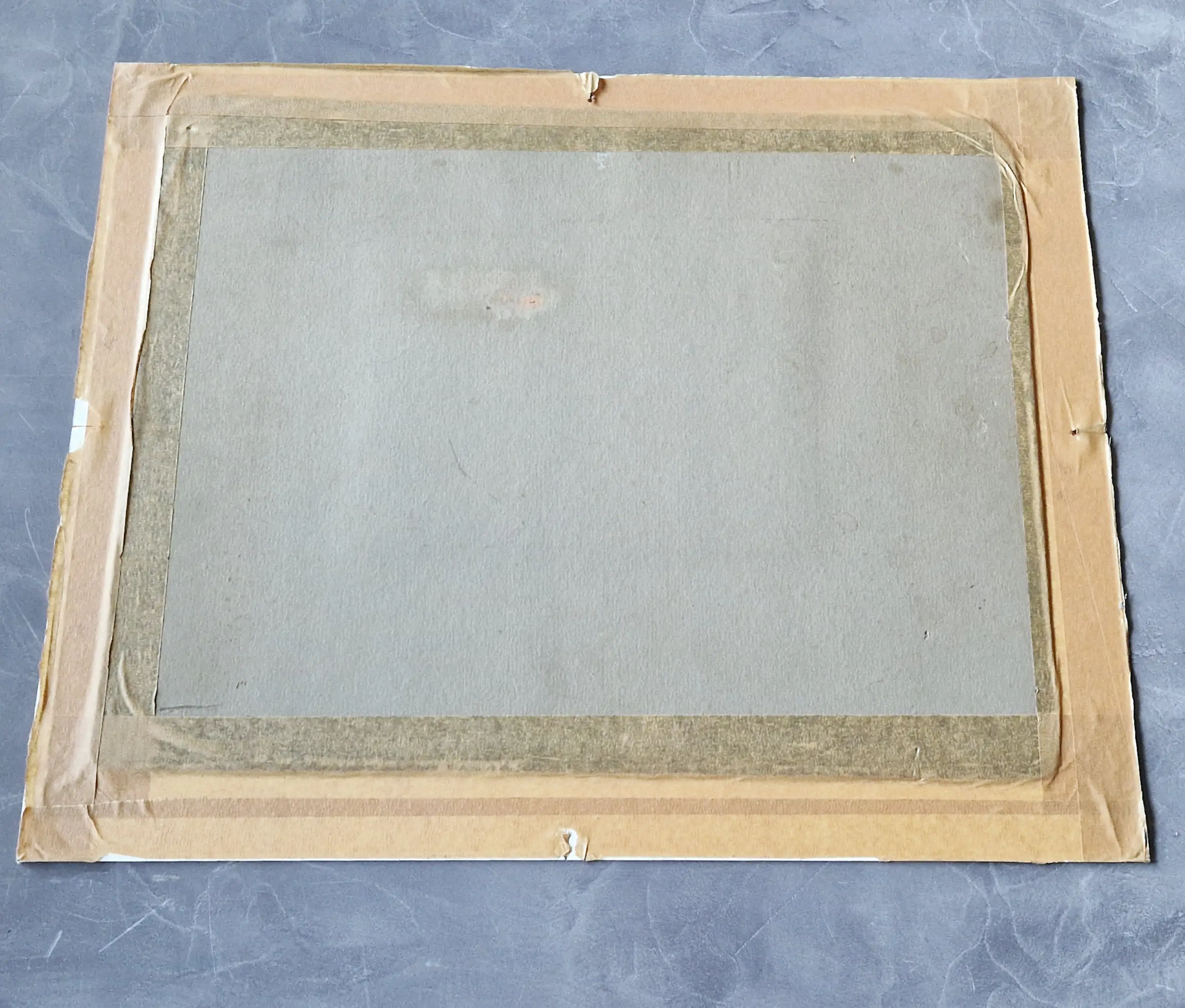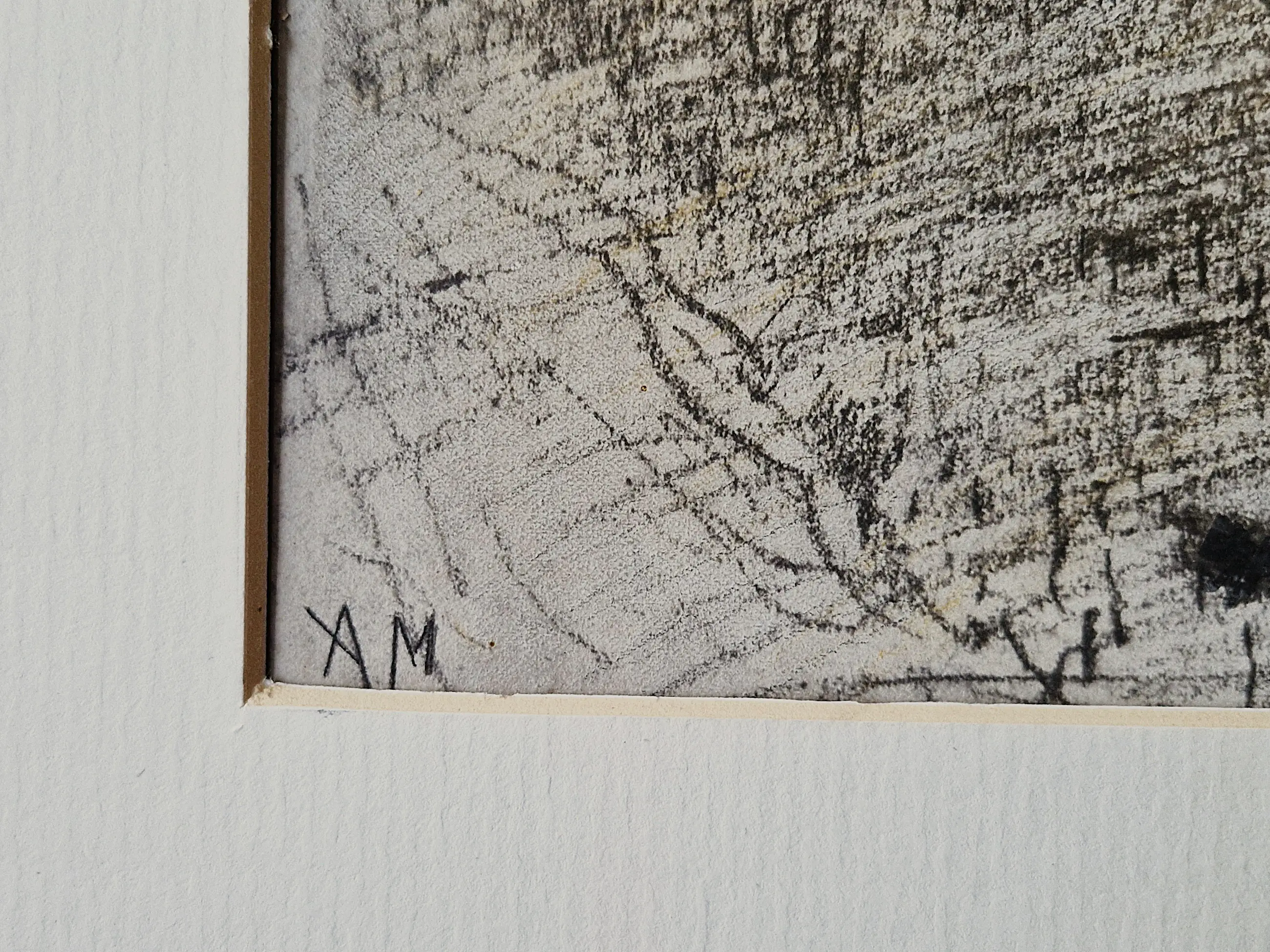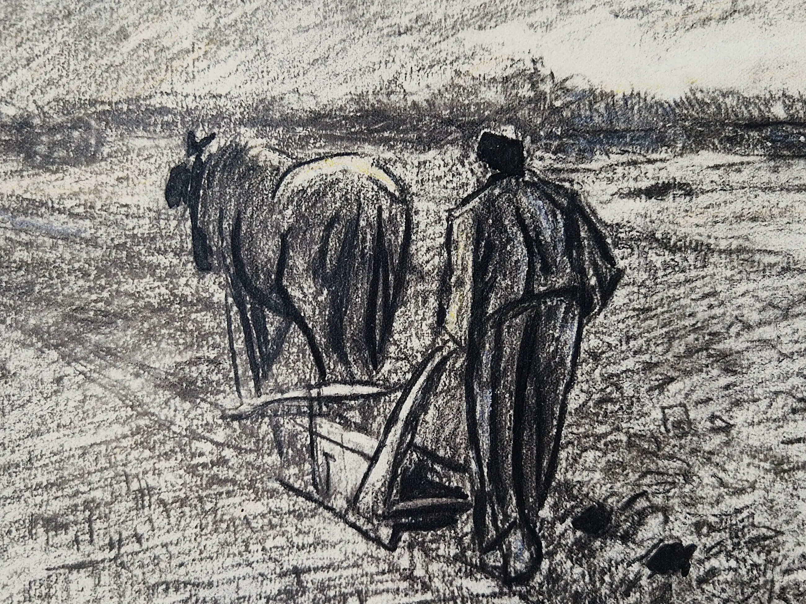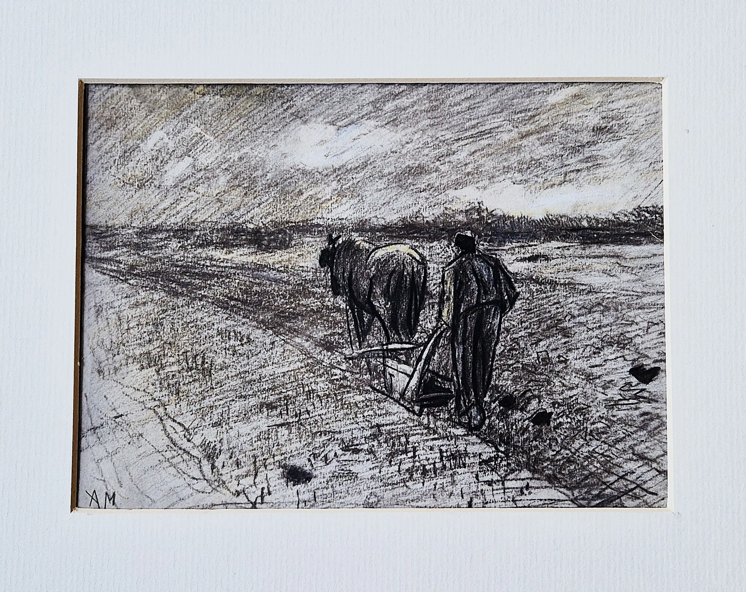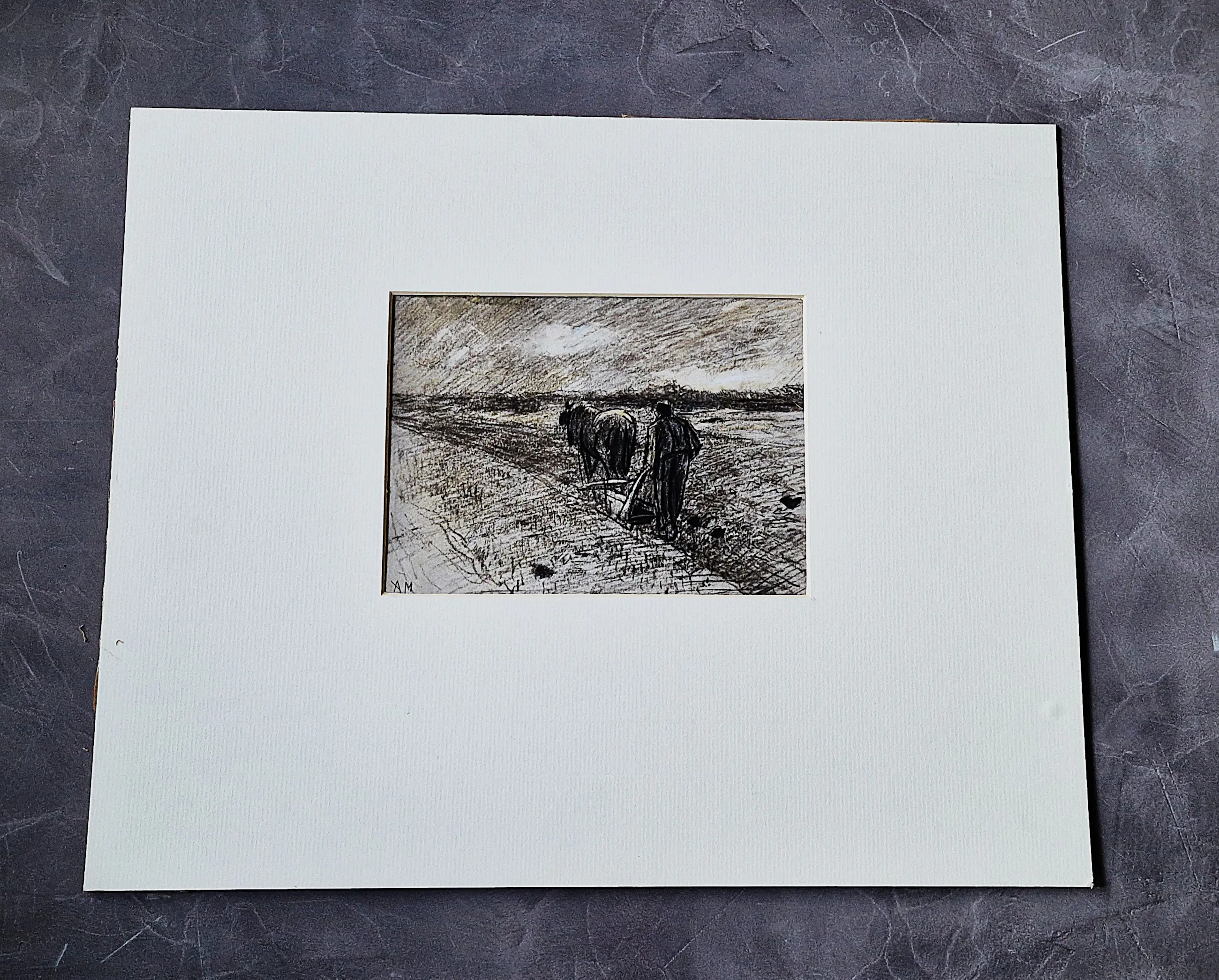 - Originele omstreeks 1870 te dateren houtskool op japans papier tekening van een ploegende boer achter een paard. Linksonder met houtskool gemonogrammeerd en in passe partout geplaatst. Verkeert in goede conditie.
