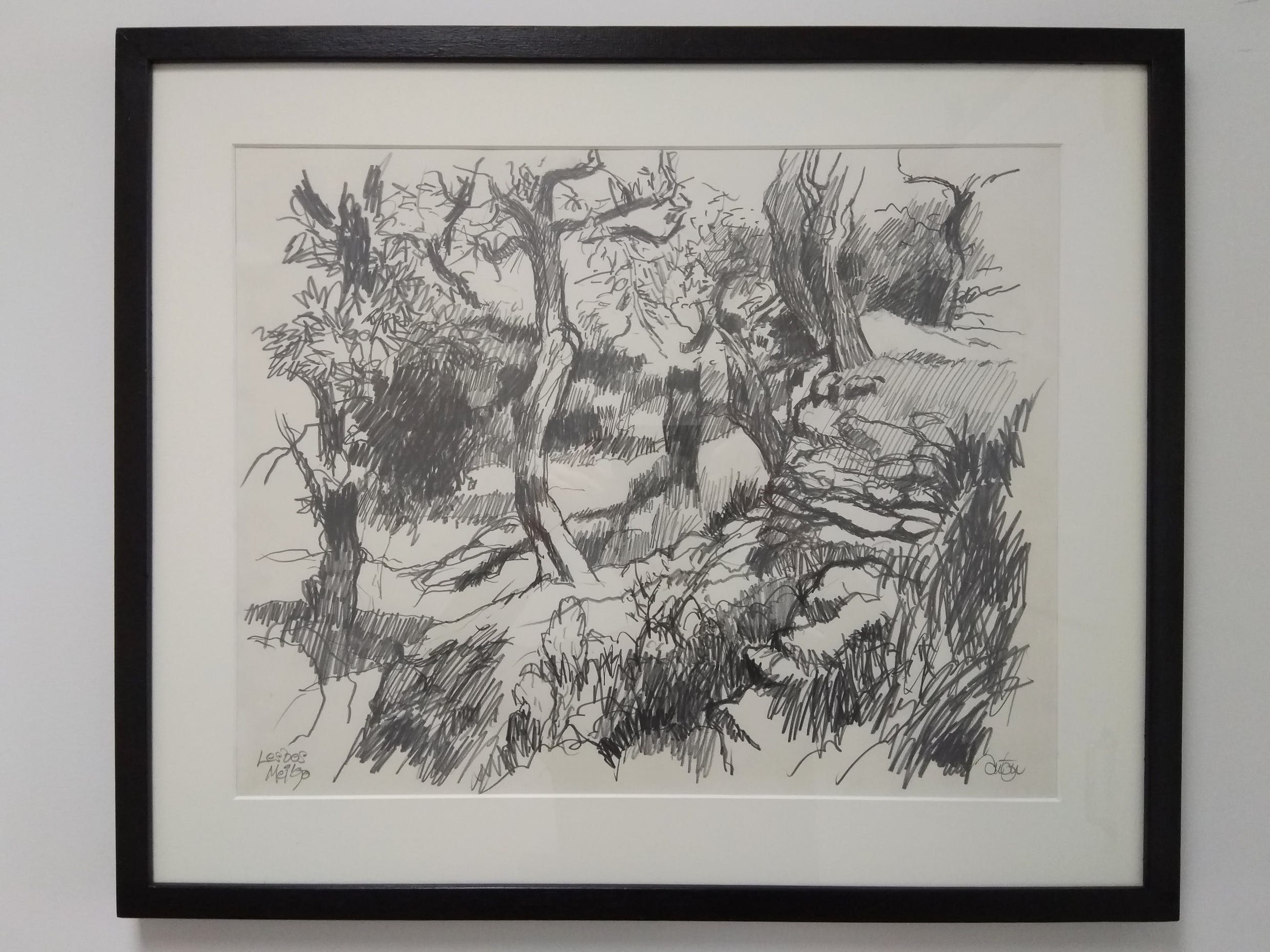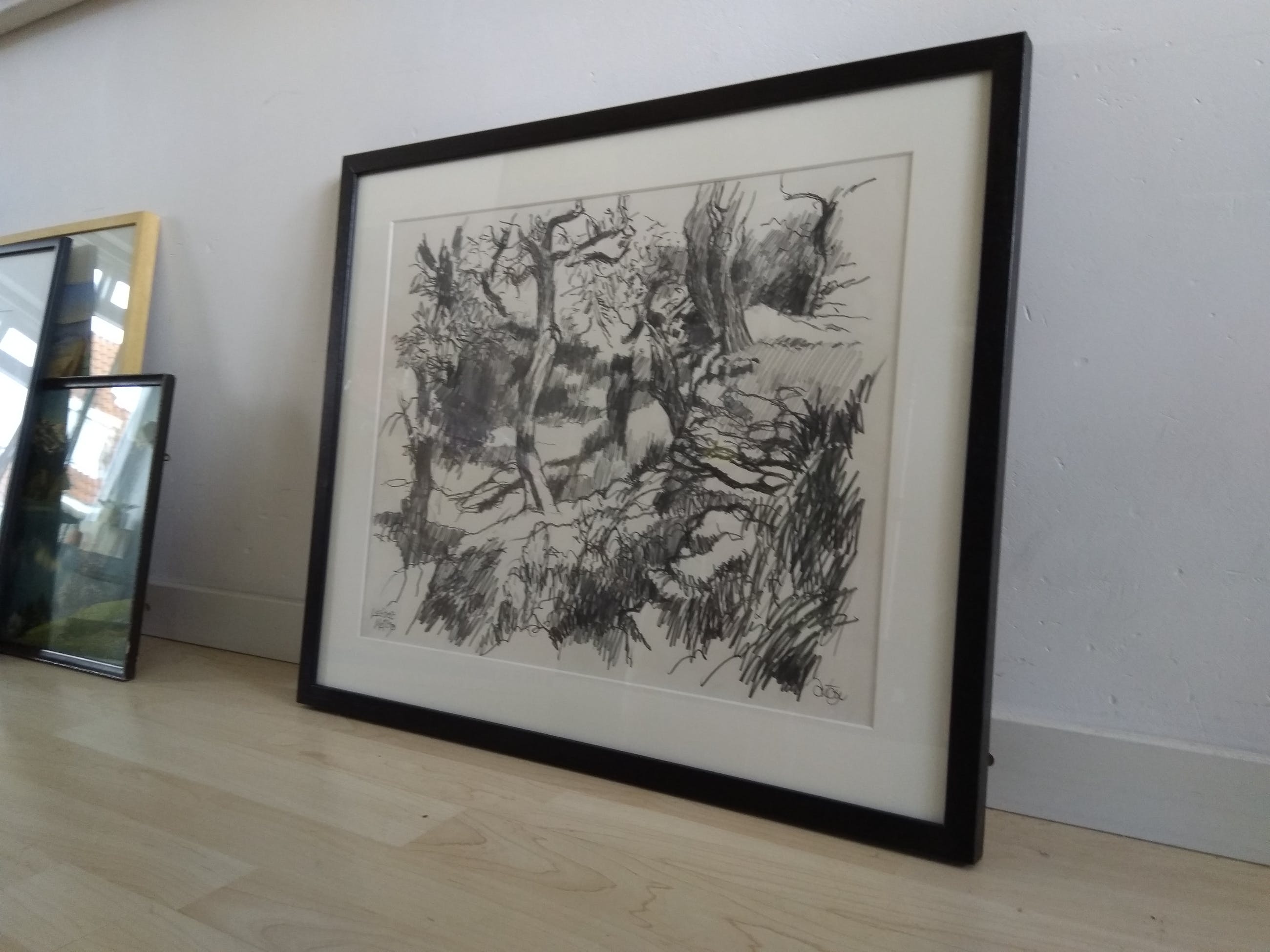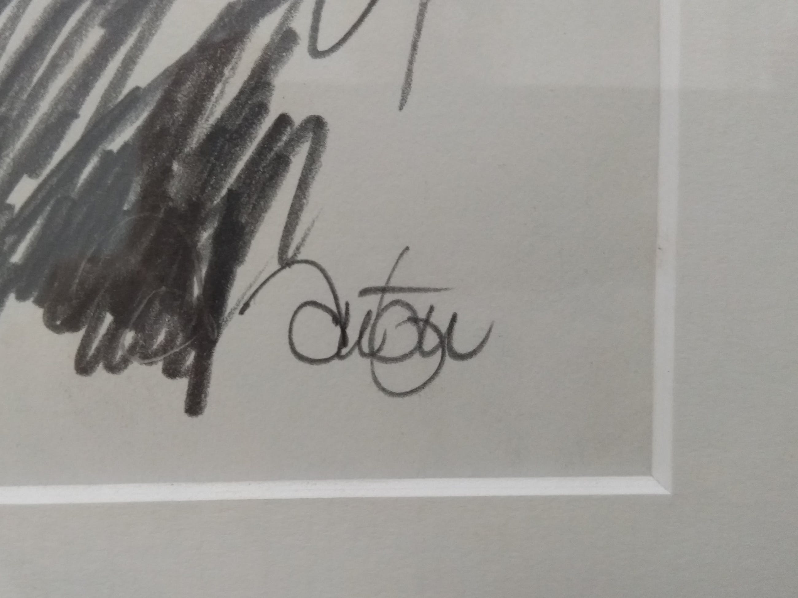 Vlotte potlood-tekening van alleskunner Anton Misset, ingelijst in mat zwart houten wissellijst.