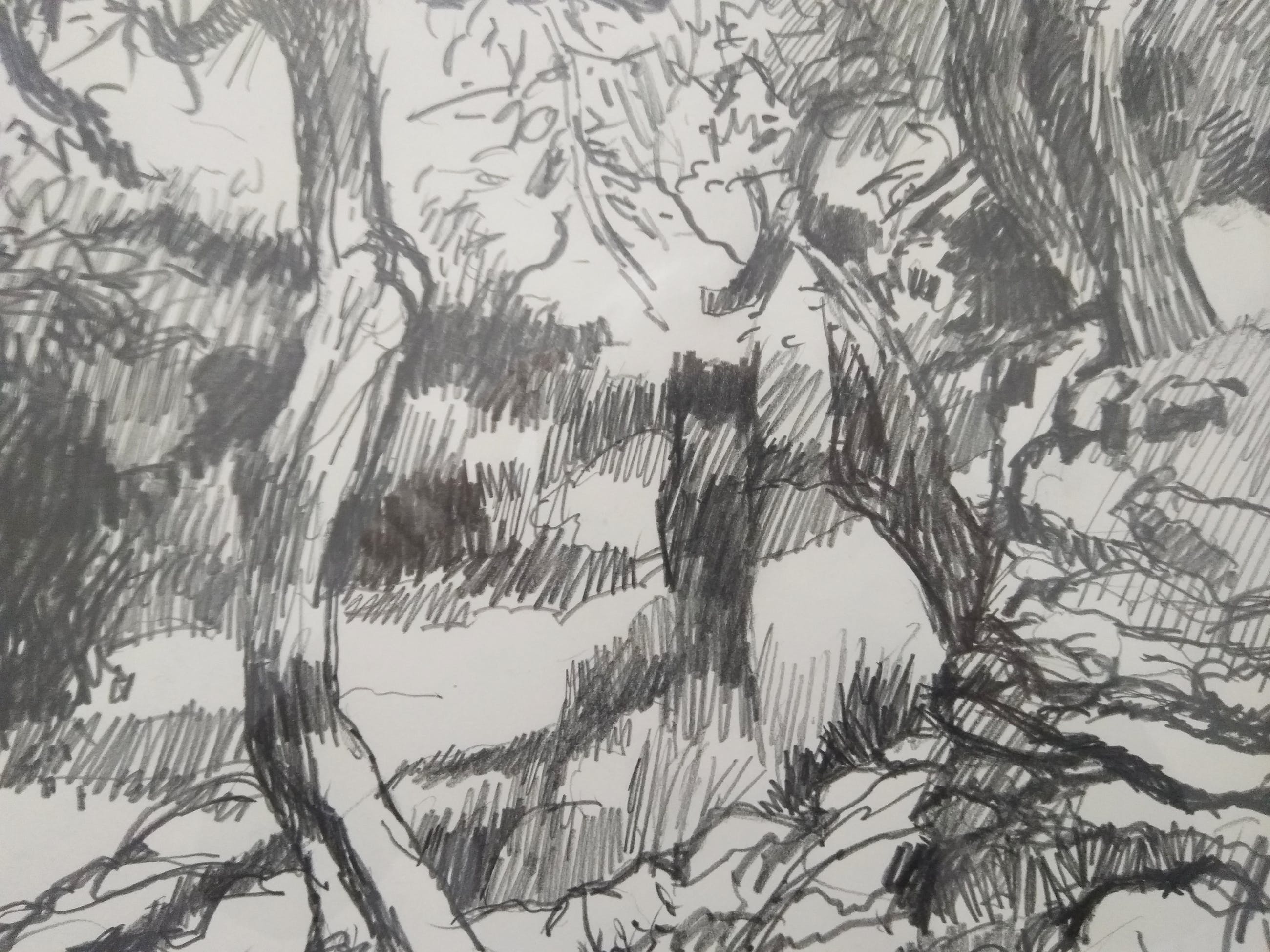Voorstellend een olijfboomgaard met grillige stammen, begrensd door een stenen muurtje.