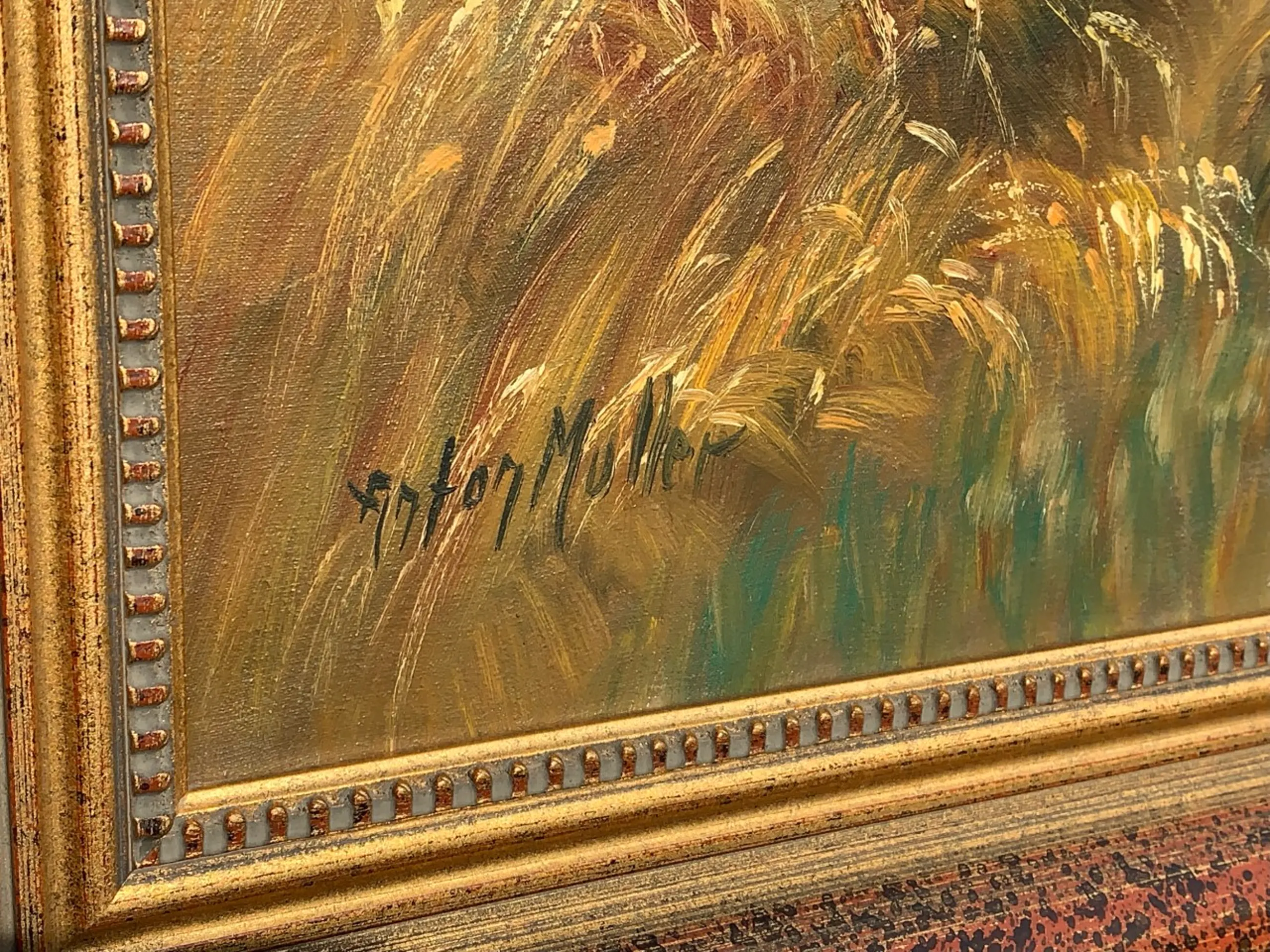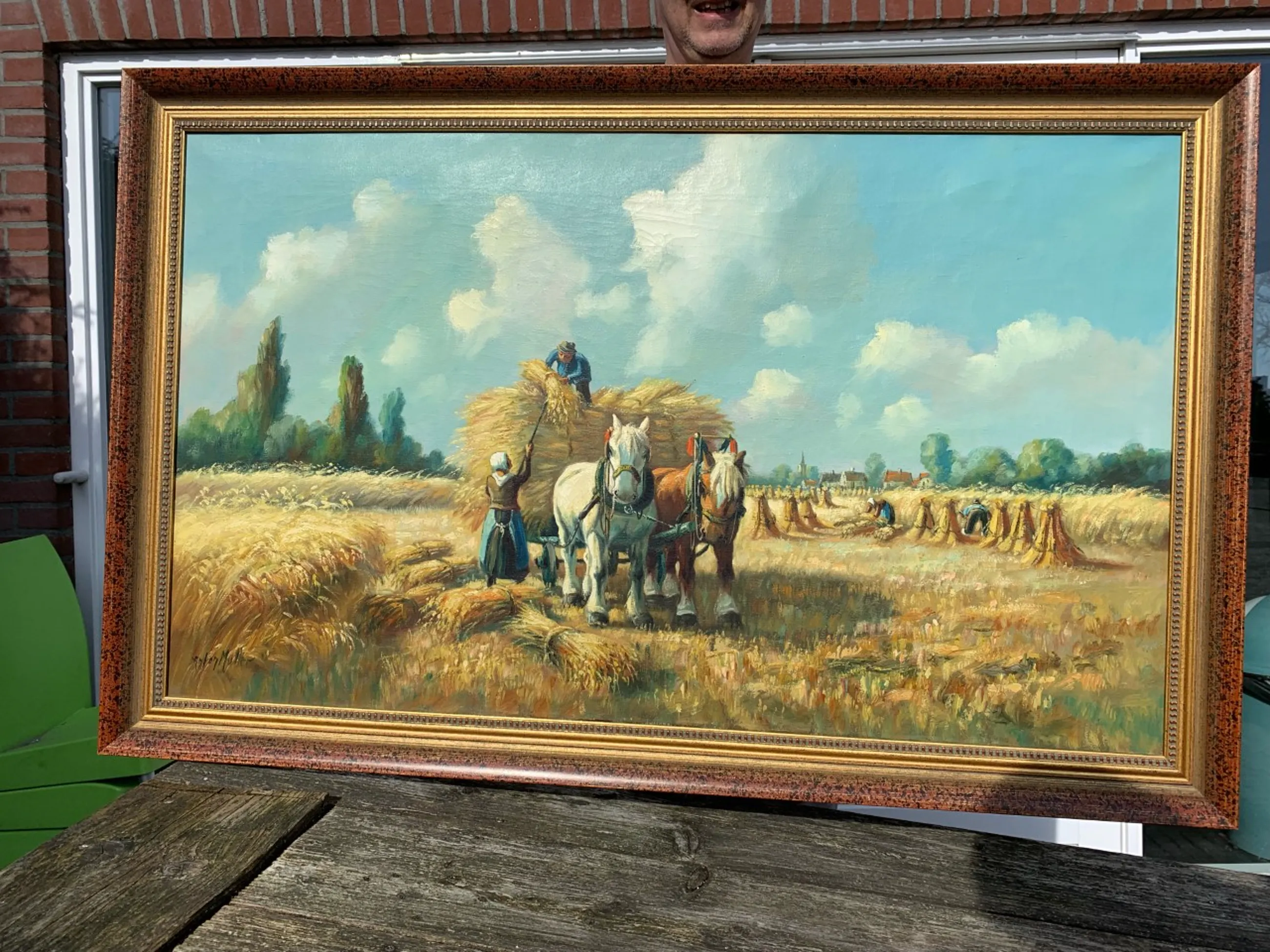 Ouderwets tafreel van het binnenhalen van het hooi met werkpaarden en hooiwagen. Werk ingelijst door lijstenmakerij de Angstel in Baambrugge.