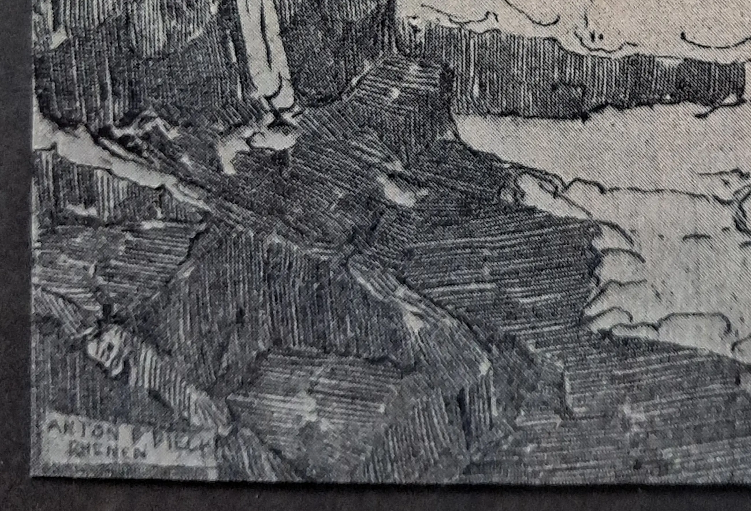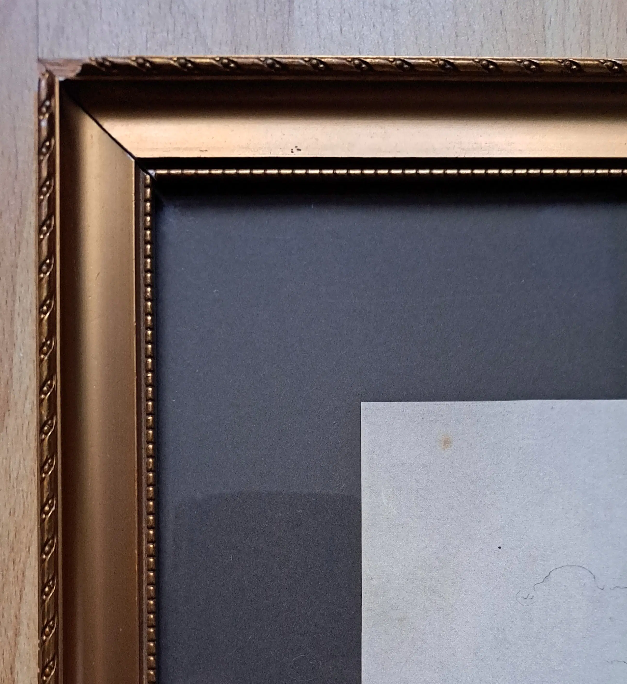 Hier een daar bruine "foxing" vlekken en de lijst is op 2 hoeken beschadigd.