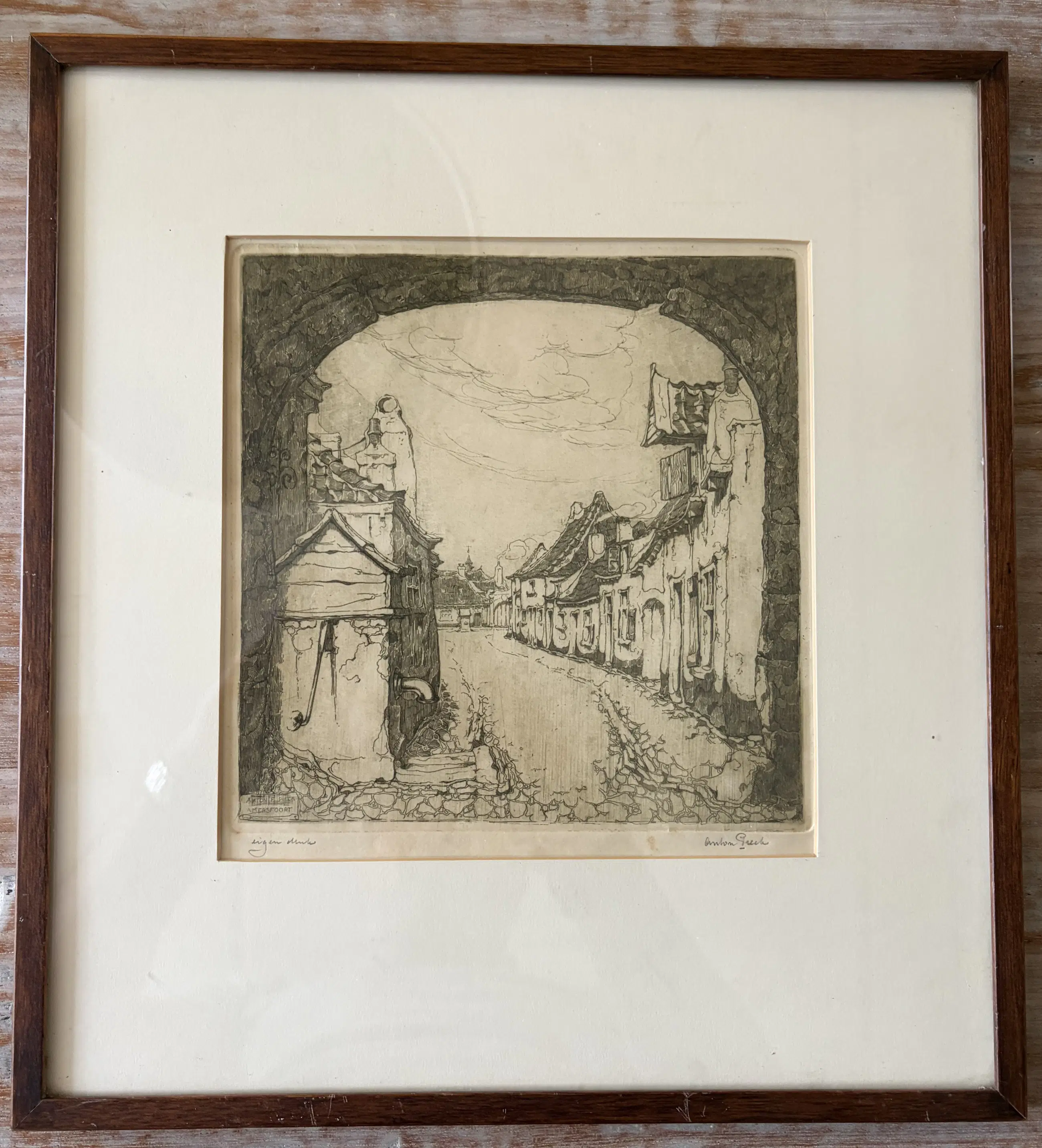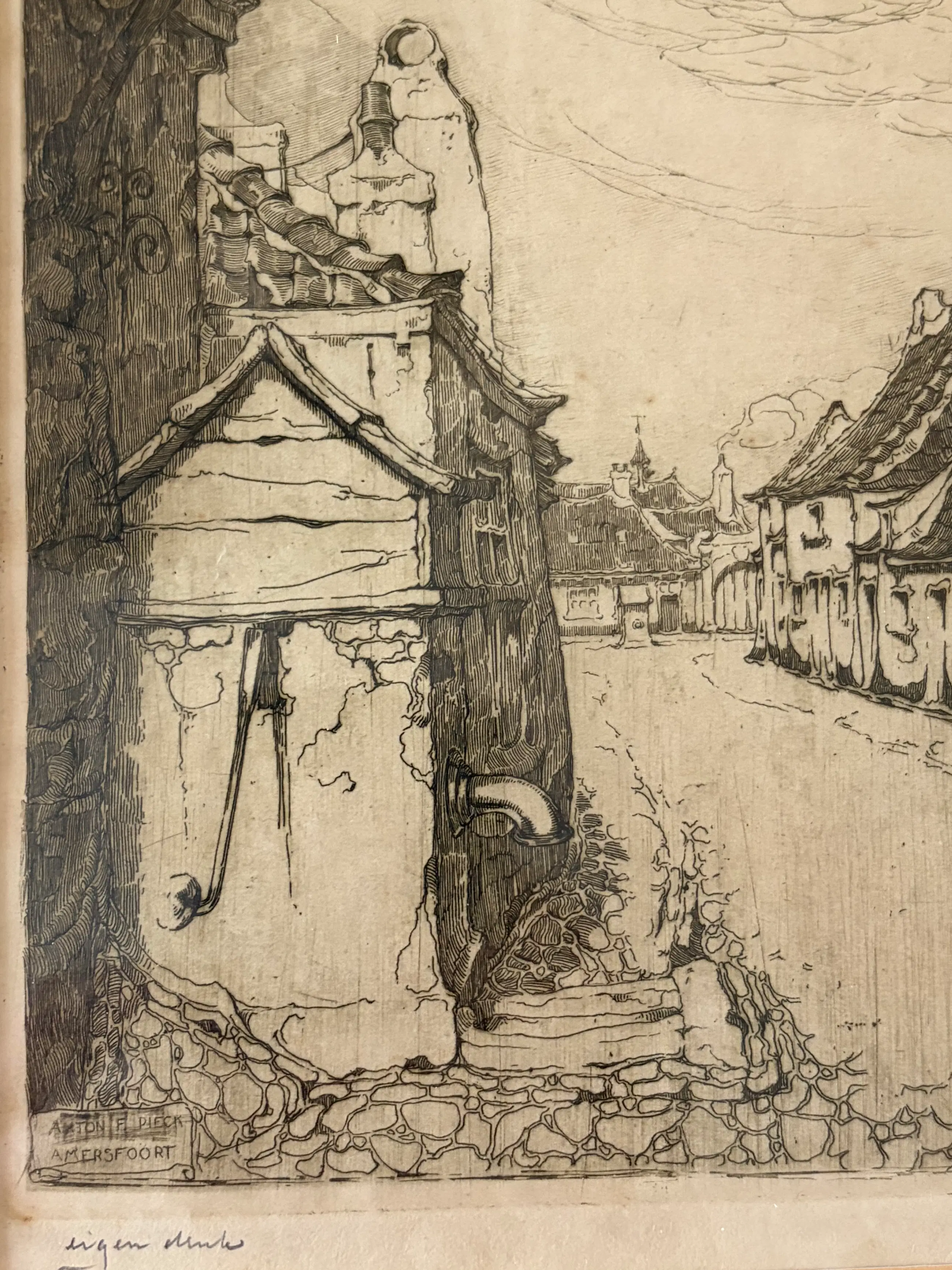 Prachtige originele ets van Anton Pieck (1895–1987), meester van nostalgische stadsgezichten en sfeervolle architecturale doorkijkjes. Deze ets toont een karakteristiek oud‑Hollands straatje, rijk aan detail en uitgevoerd in Piecks kenmerkende warme, verhalende stijl.