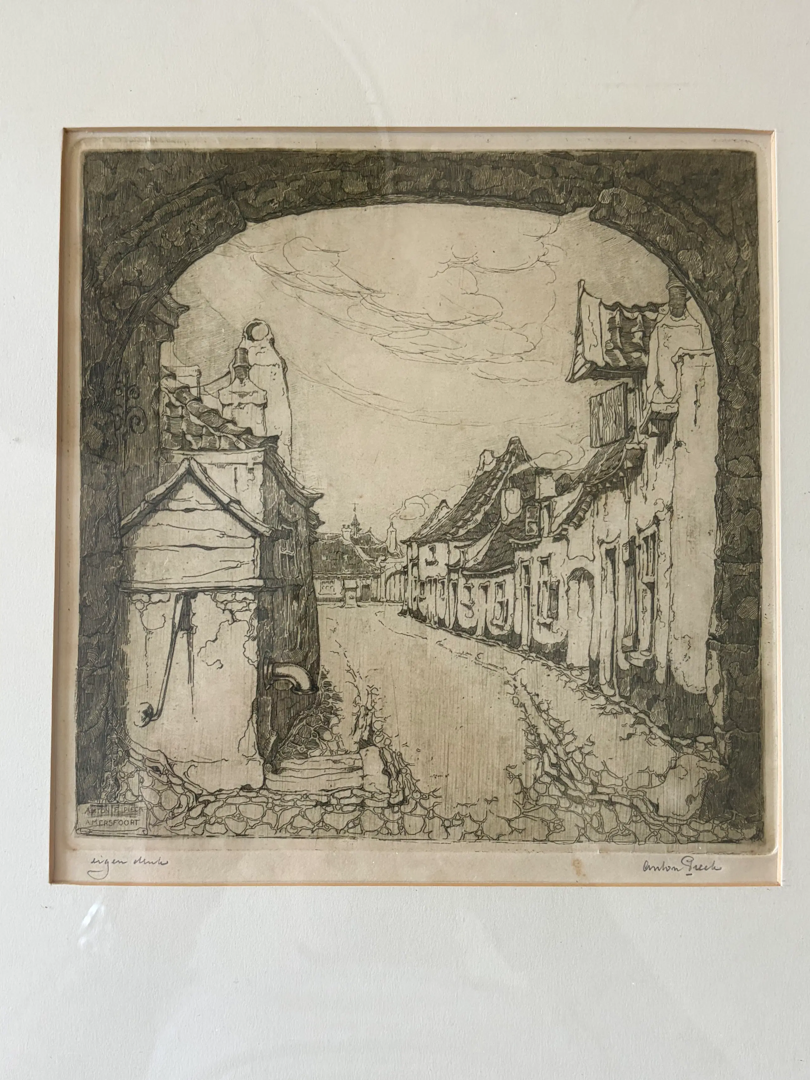Het werk is gesigneerd in potlood rechtsonder en "eigen druk" in potlood linksonder. Het is gedrukt in fijne, heldere lijnen die de diepte en sfeer van het historische straatbeeld prachtig tot leven brengen. De ets is professioneel ingelijst en verkeert in goede conditie, de leeftijd is zichtbaar.