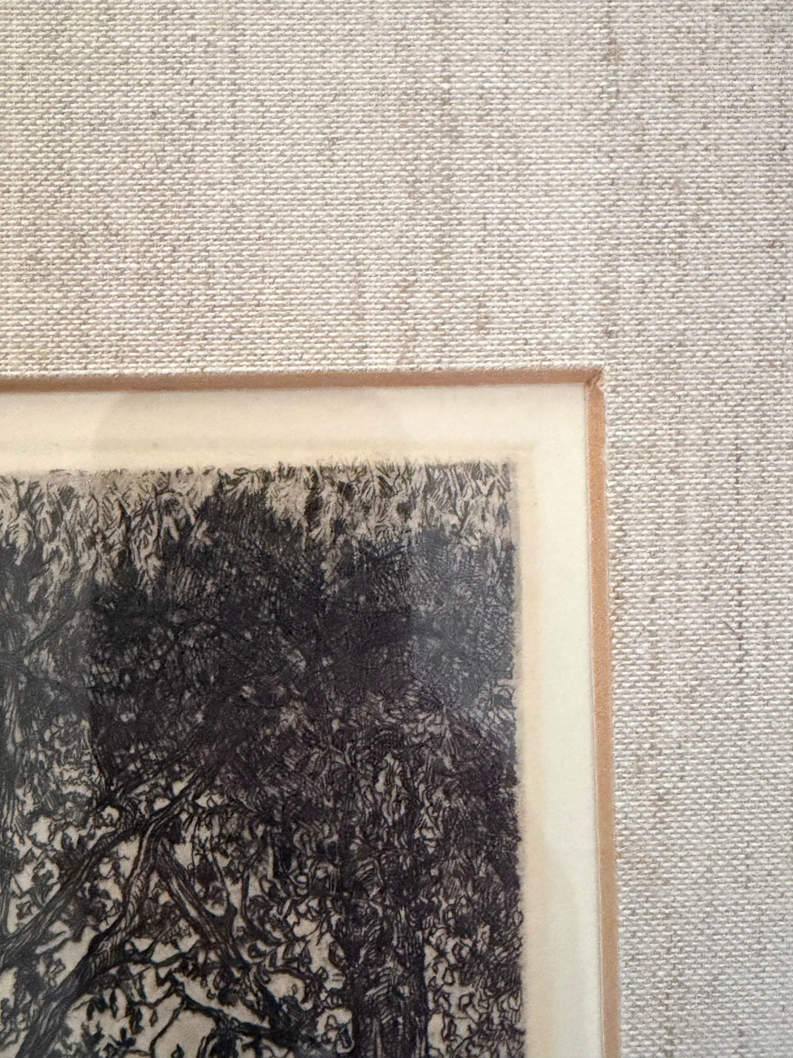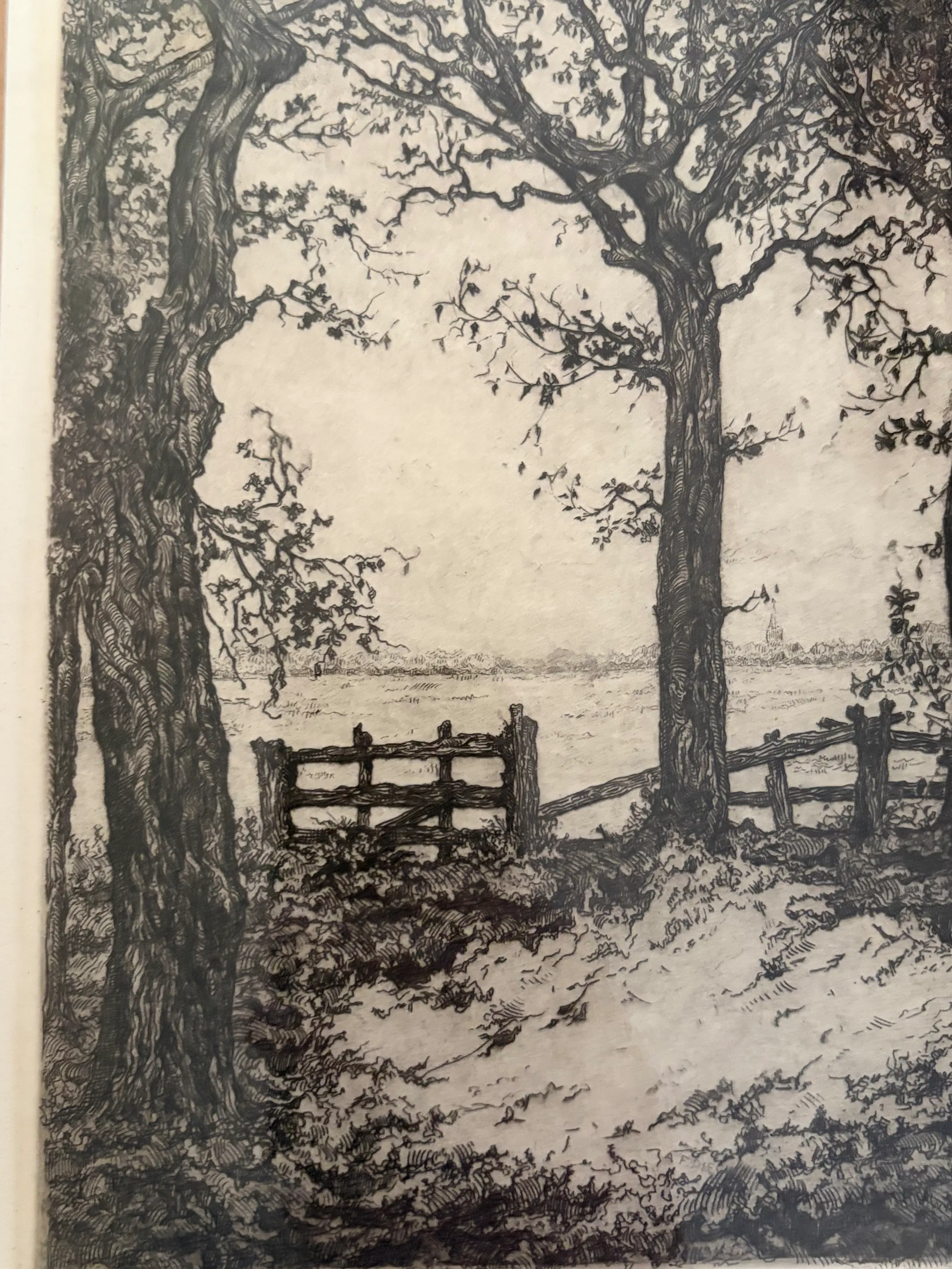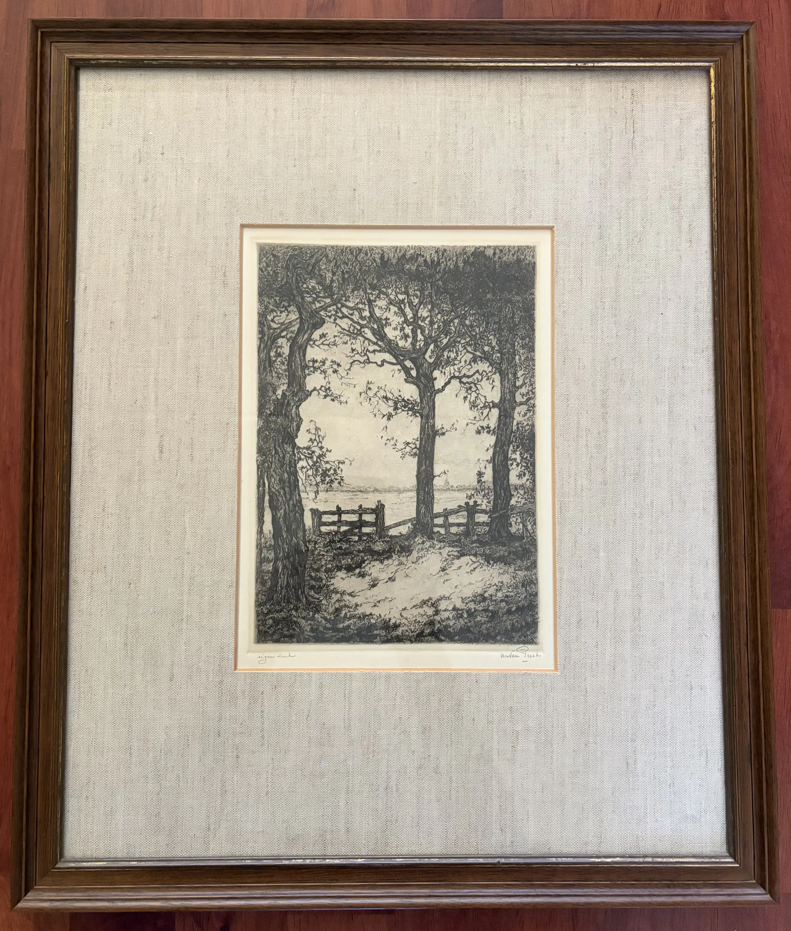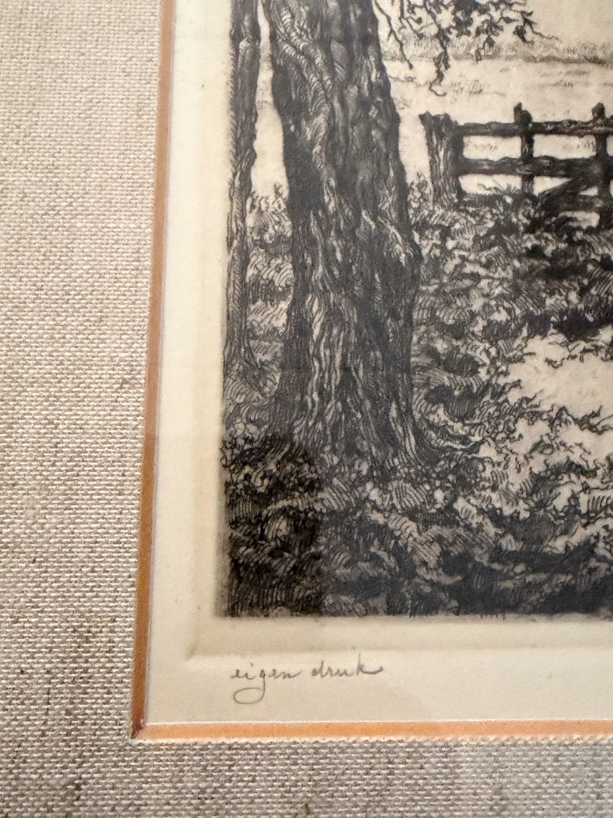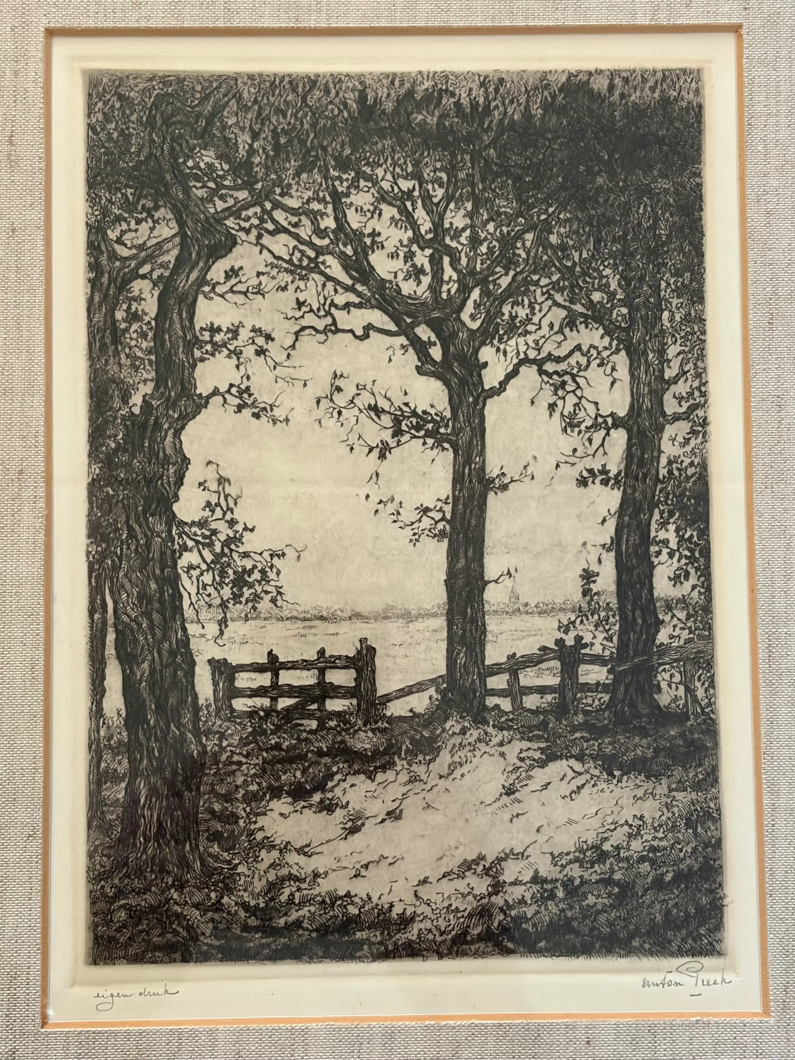 De ets toont een sfeervol, gedetailleerd landschap met monumentale bomen en een rustiek hekwerk — een typisch Pieck‑tafereel uit zijn vroege periode, waarin zijn meesterlijke lijnvoering en gevoel voor sfeer al duidelijk zichtbaar zijn. Een bijzonder fraai voorbeeld van zijn grafische vakmanschap. Details • Techniek: ets / eigen druk • Signatuur: handgesigneerd in potlood • Conditie: uitstekend, professioneel ingelijst , wel wat ouder; • Herkomst: particuliere collectie en erkend veilinghuis