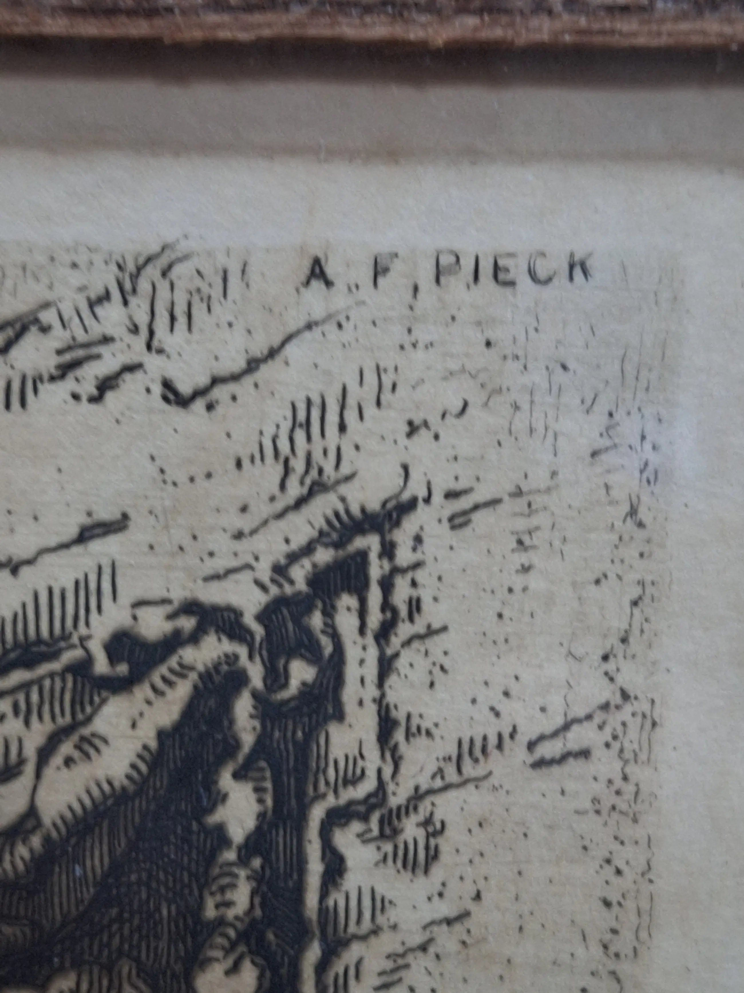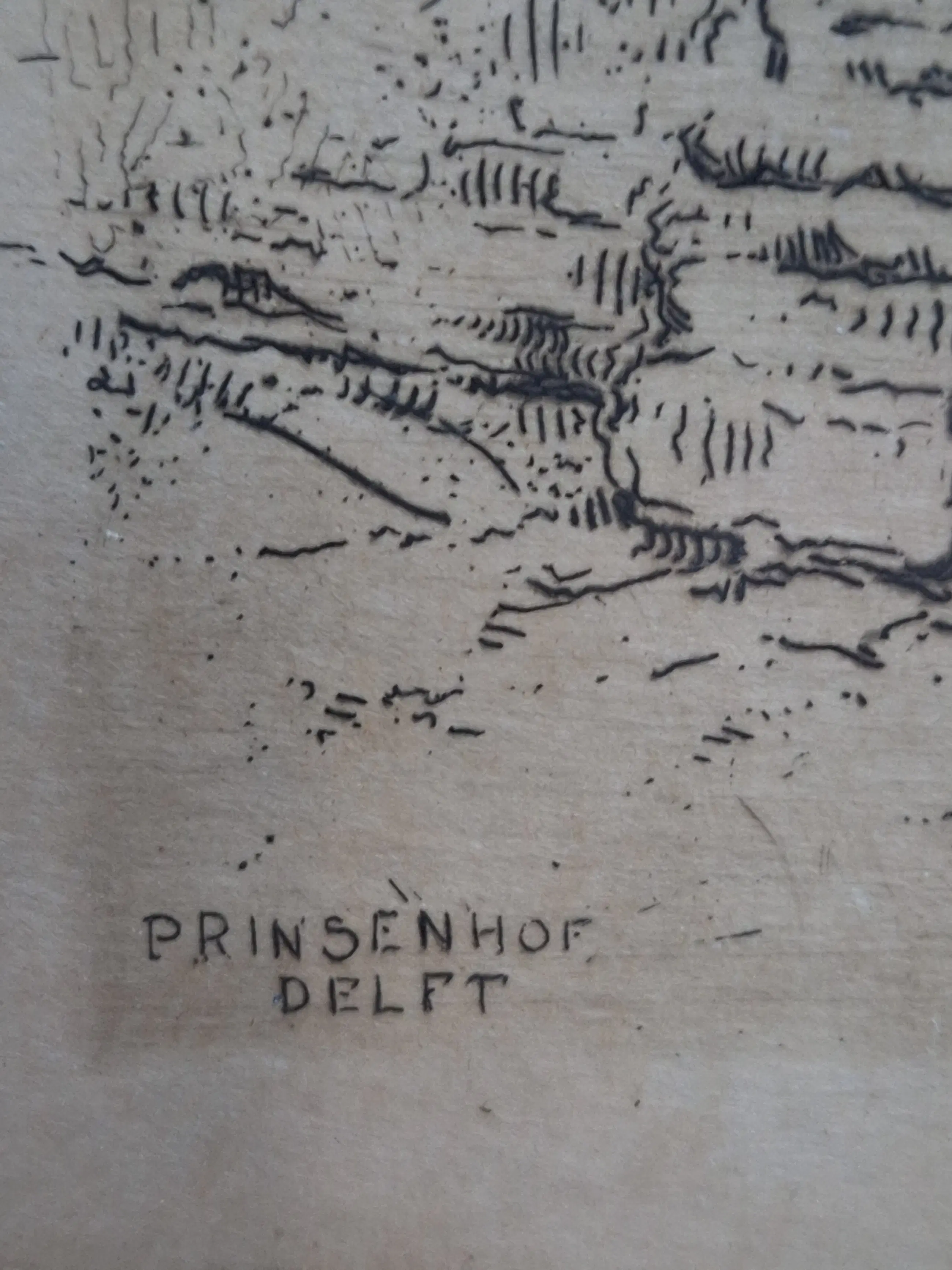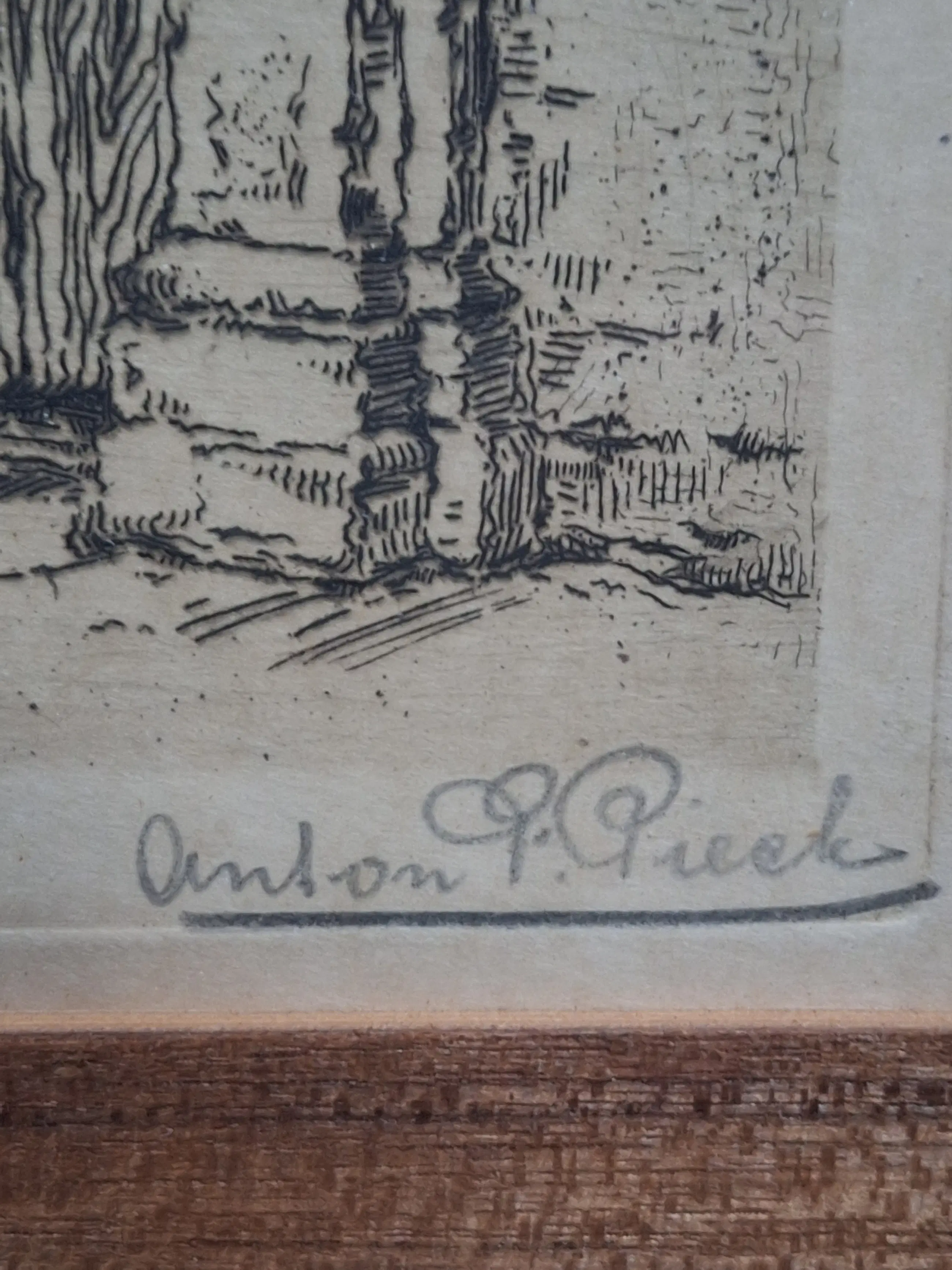 Ets van Prinsenhof Delft door Anton F. Pieck Ingelijst met houten passe-partout Rechtsboven en linksonder naam en titel. Rechtsonder gesigneerd