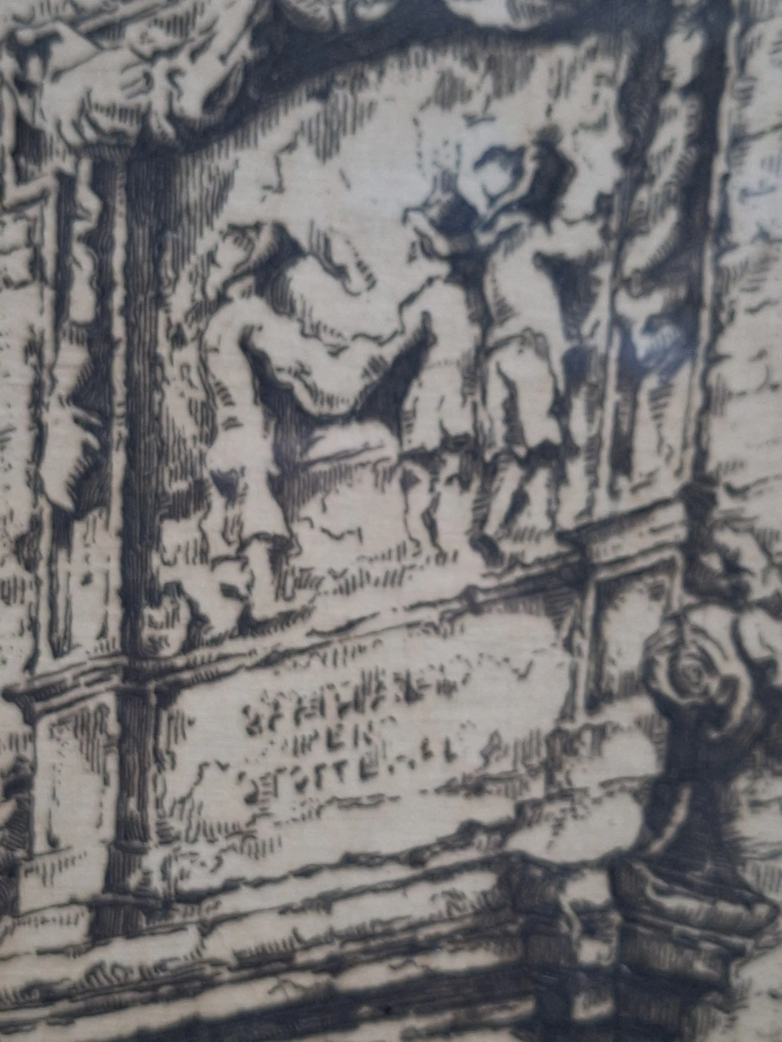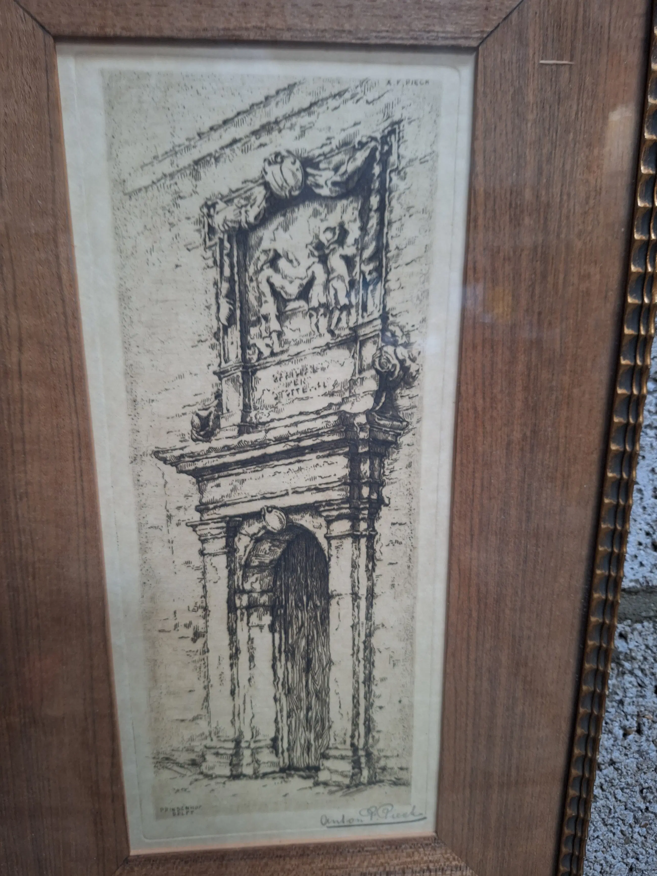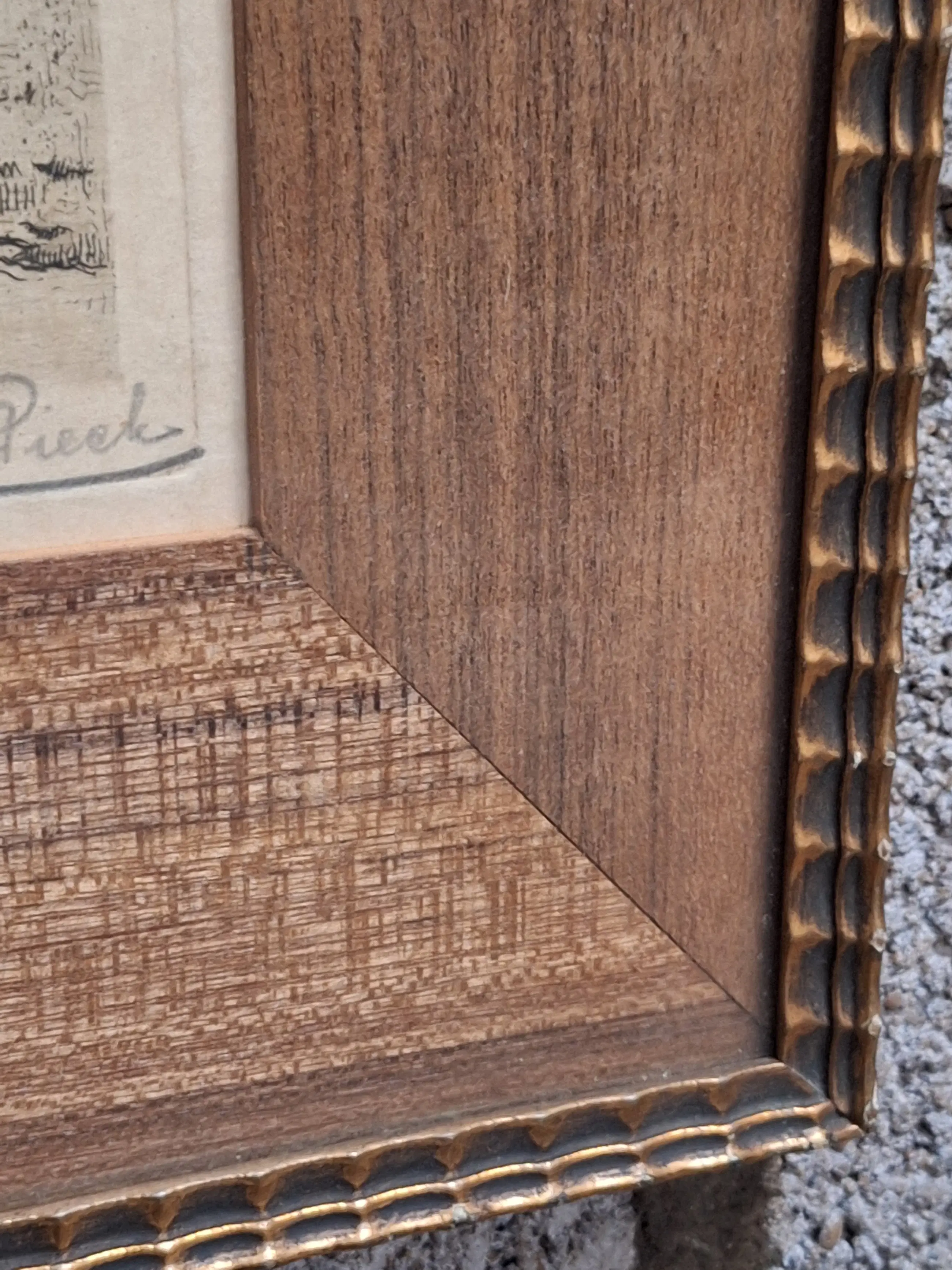 Ets van Prinsenhof Delft door Anton F. Pieck Ingelijst met houten passe-partout Rechtsboven en linksonder naam en titel. Rechtsonder gesigneerd