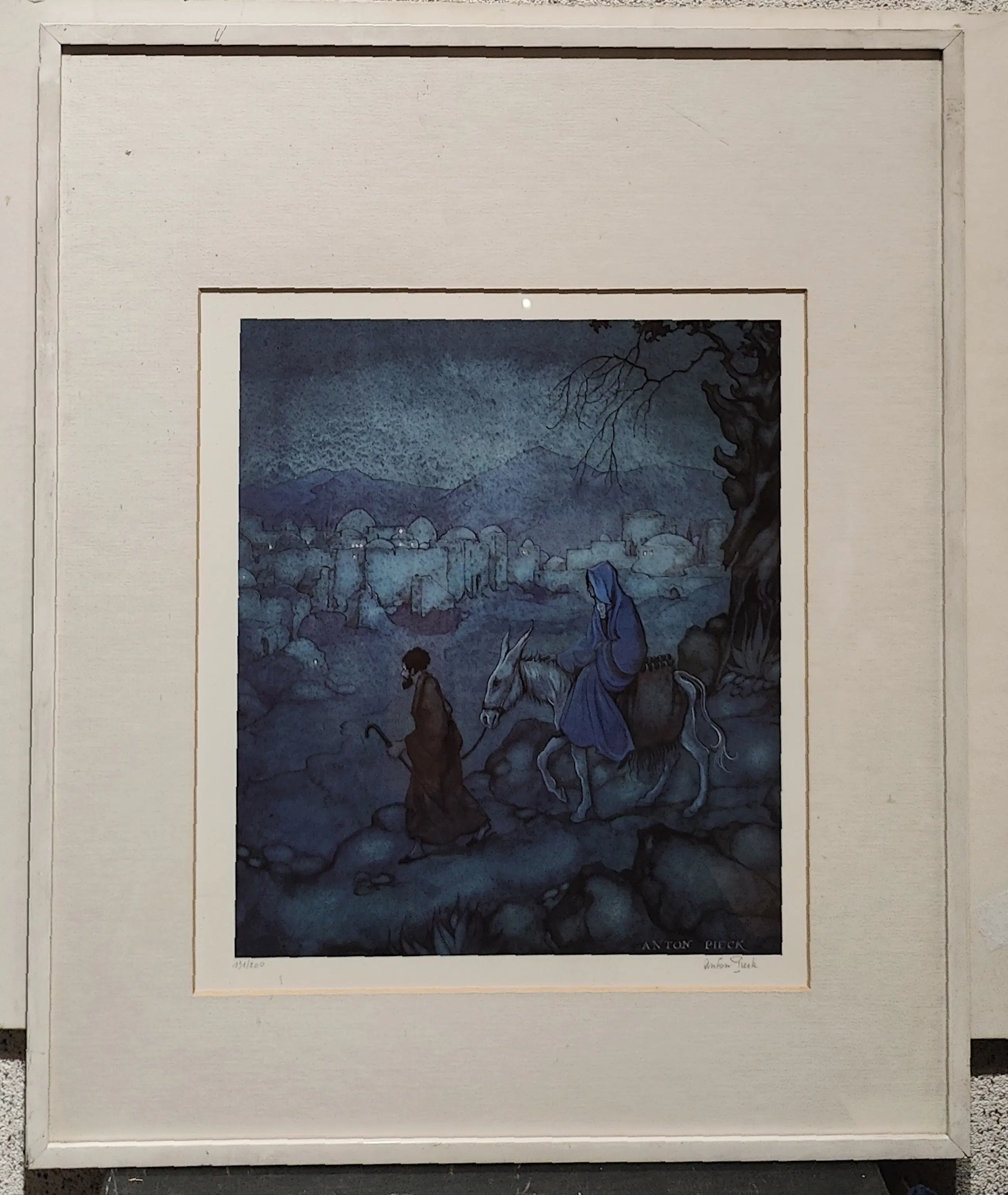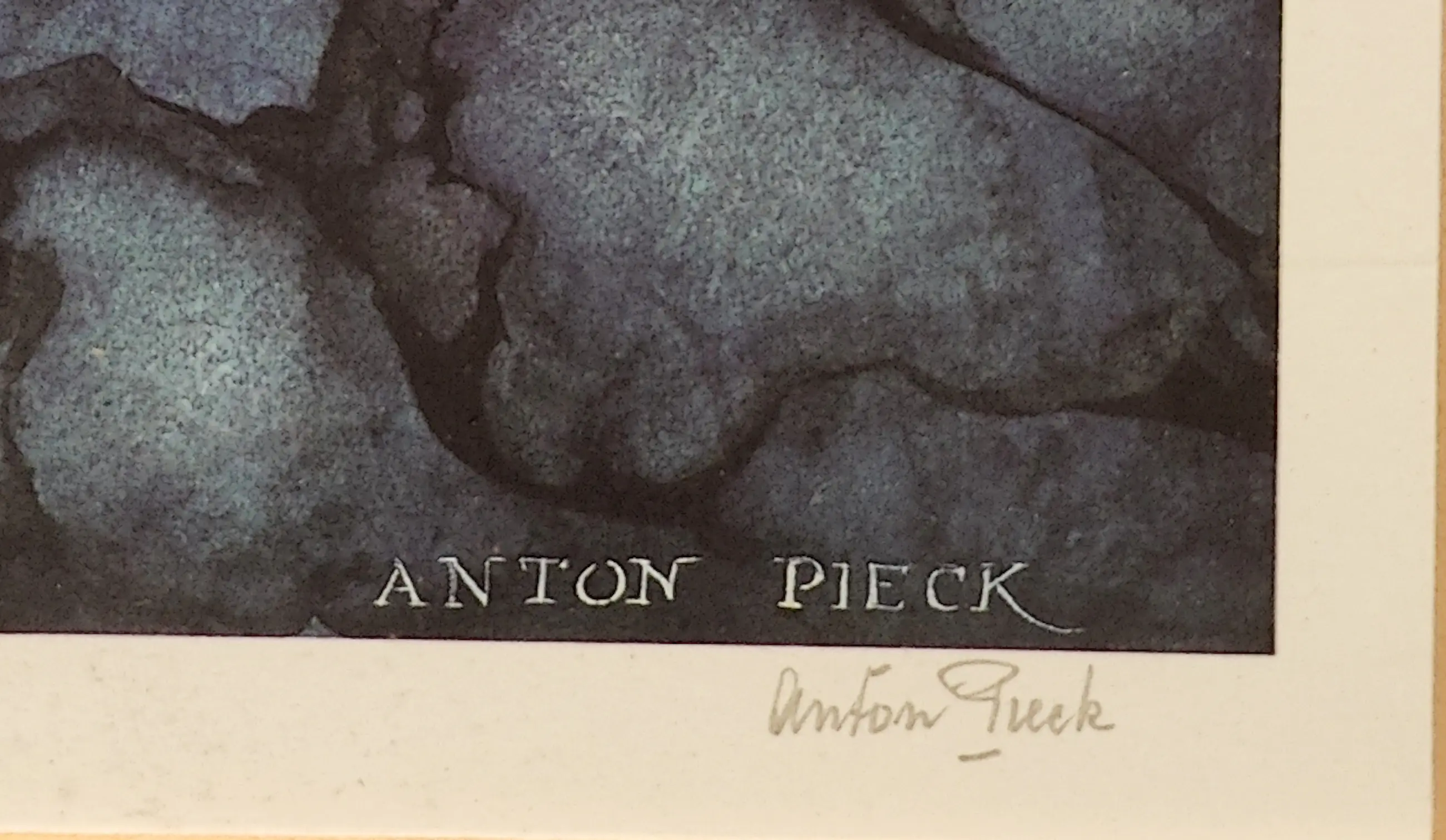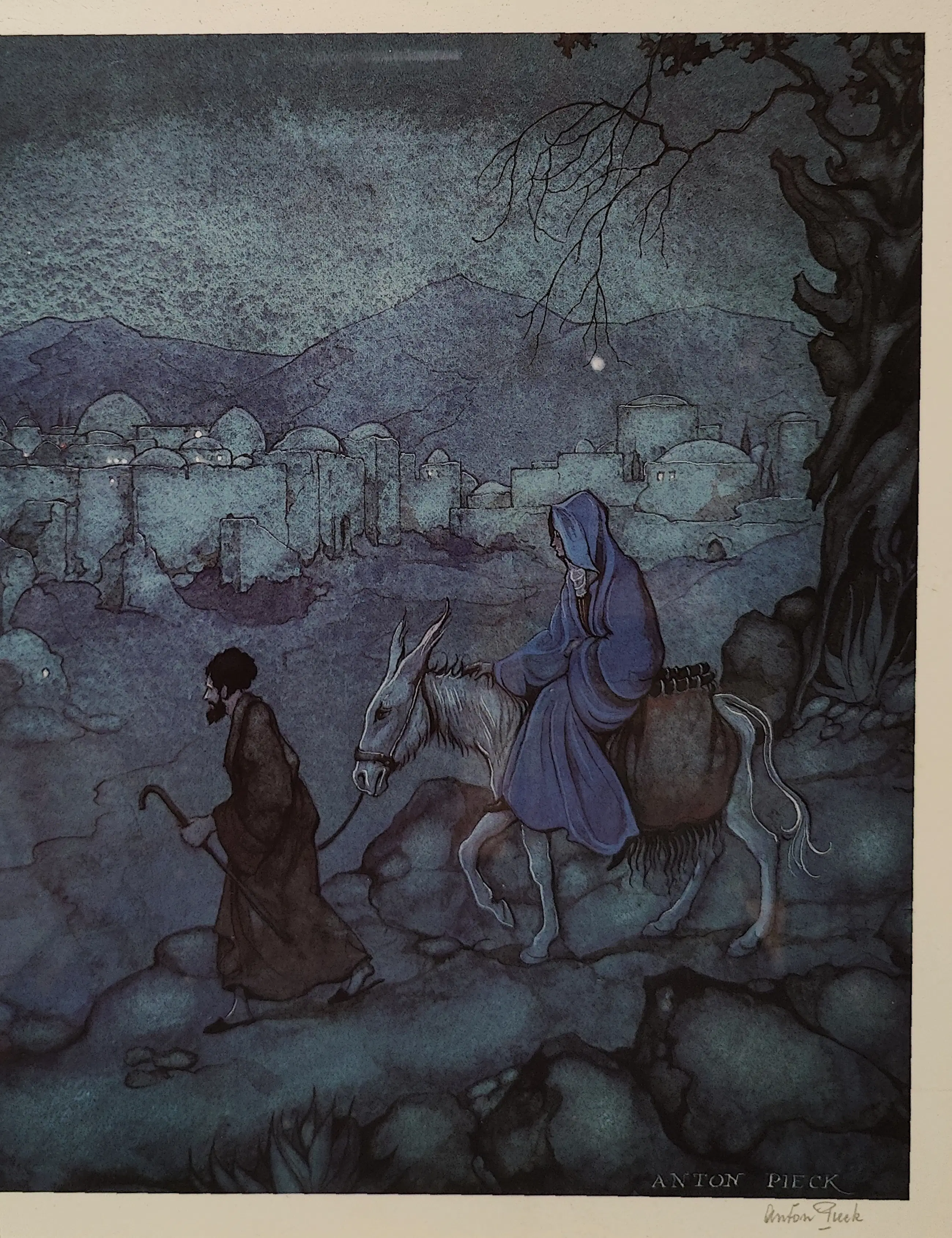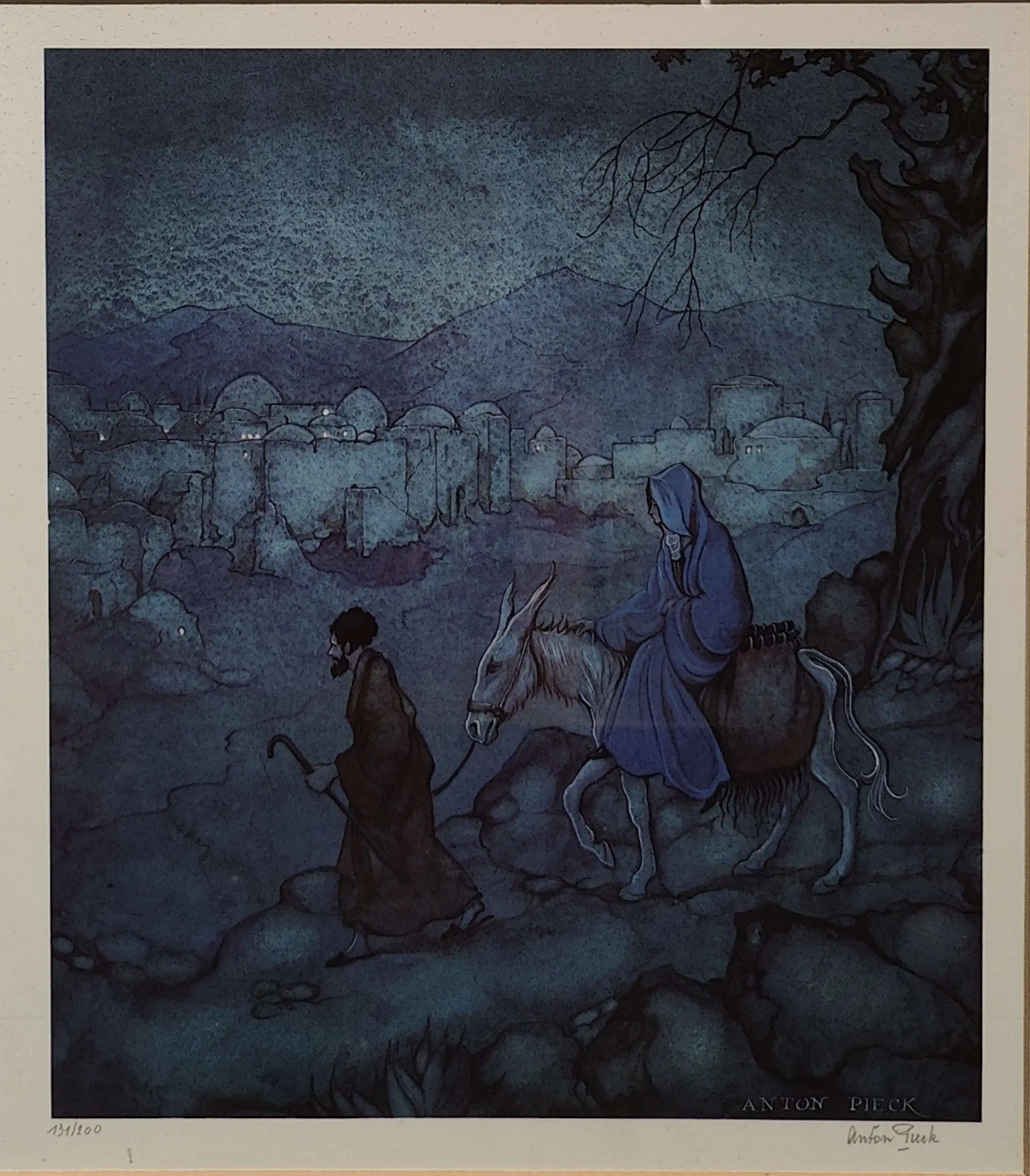 Prachtige zeefdruk van de bekende Nederlandse kunstenaar Anton Pieck. Dit sfeervolle werk toont een nachtelijke scène met subtiele blauwtonen, karakteristiek voor Piecks romantische en nostalgische stijl. De compositie en fijne details maken dit een bijzonder verzamelstuk.