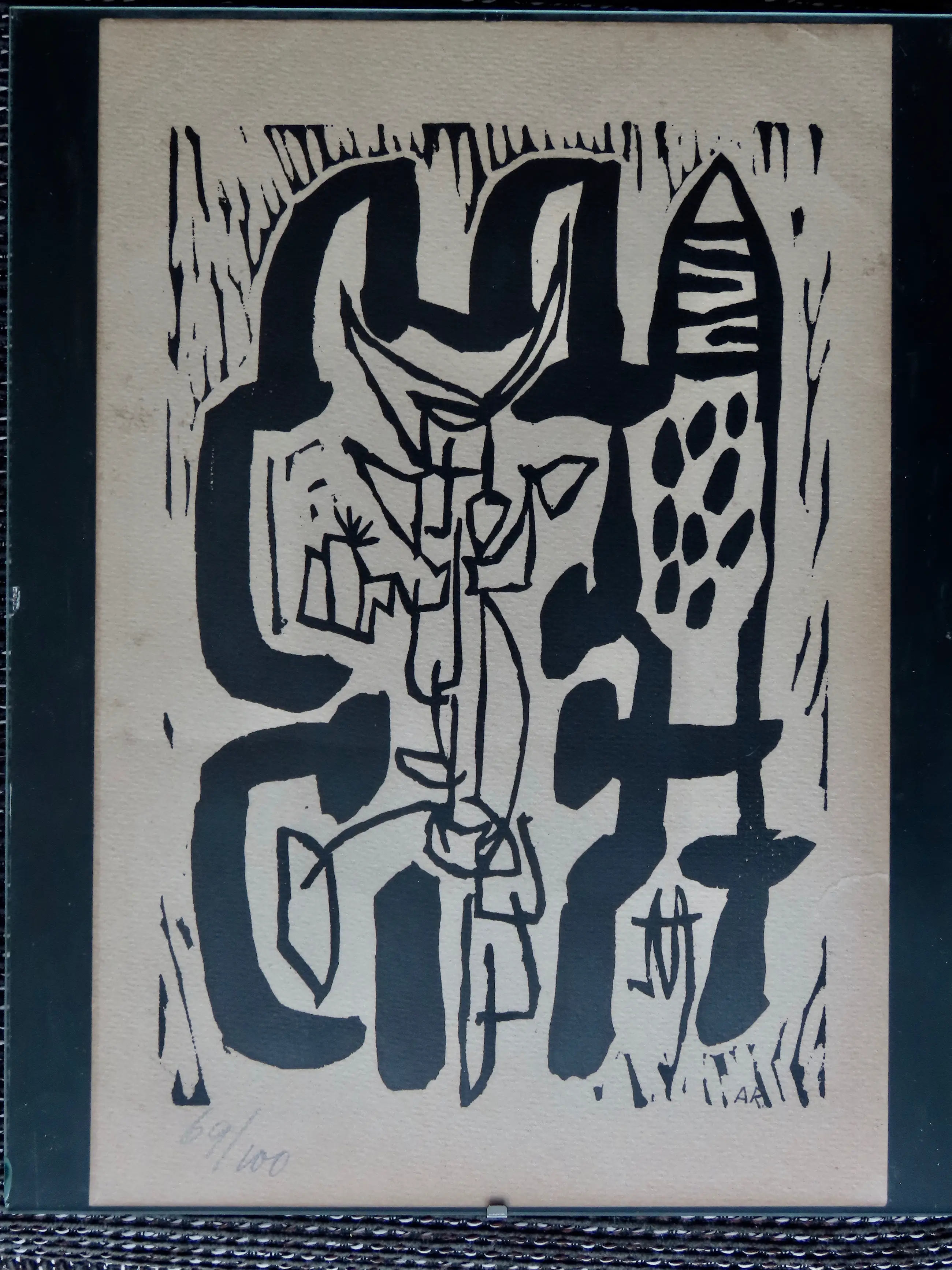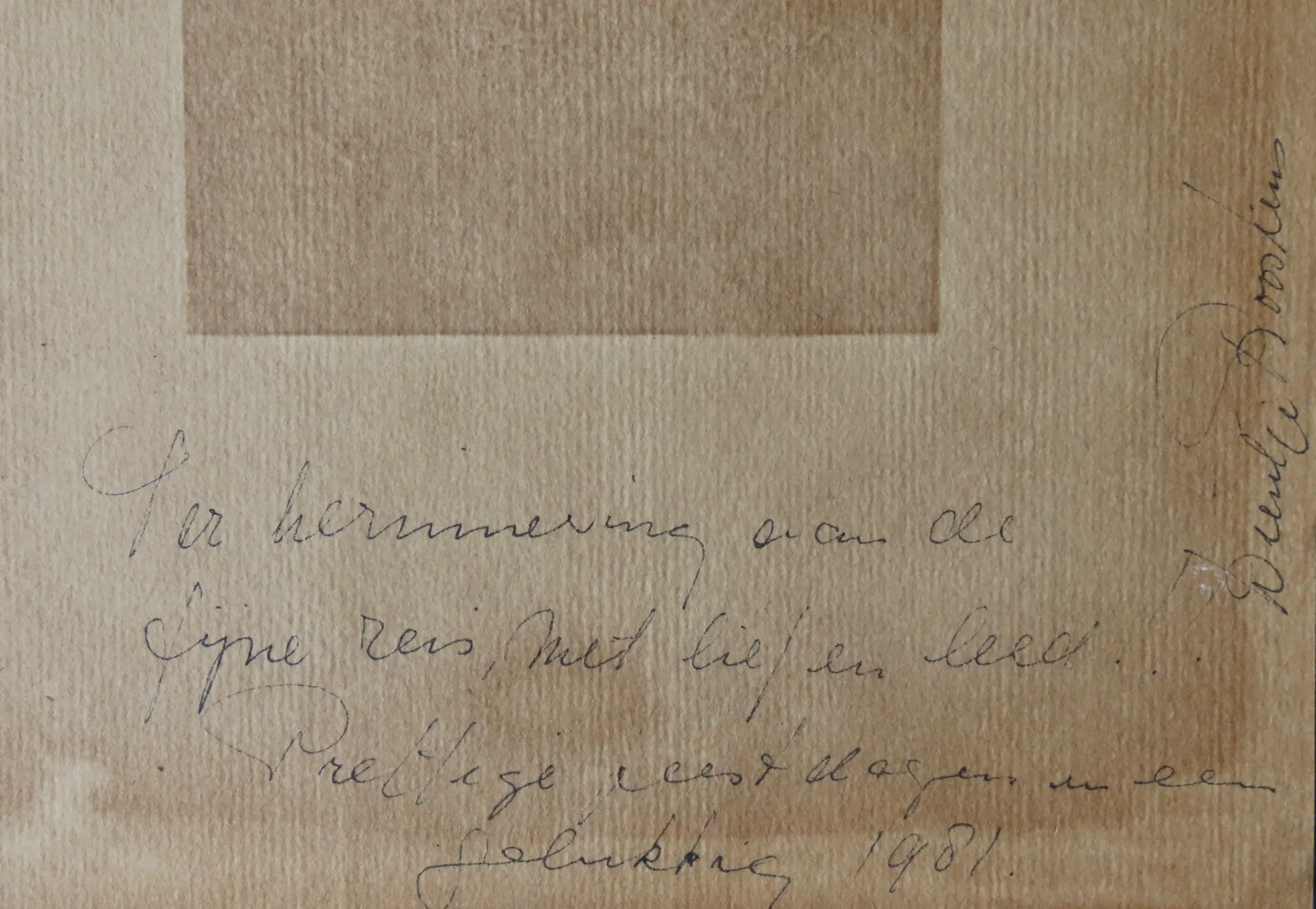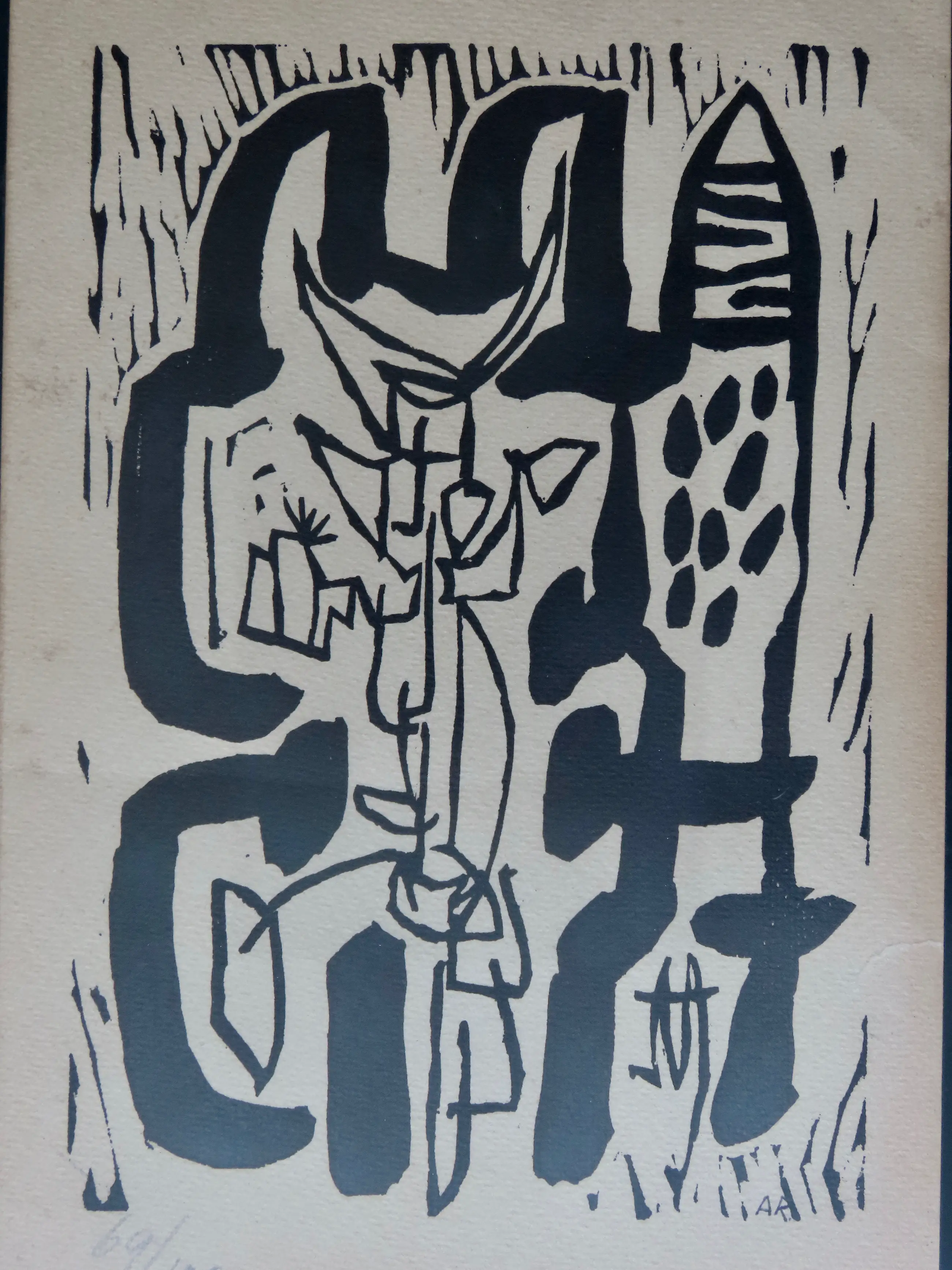 Aan de achterzijde ook te zien is een persoonlijke wens van de vrouw van Rooskens, Dientje, die deze lino eind 1981 cadeau gaf als nieuwjaarswens aan vrienden. Een mooi extra detail.