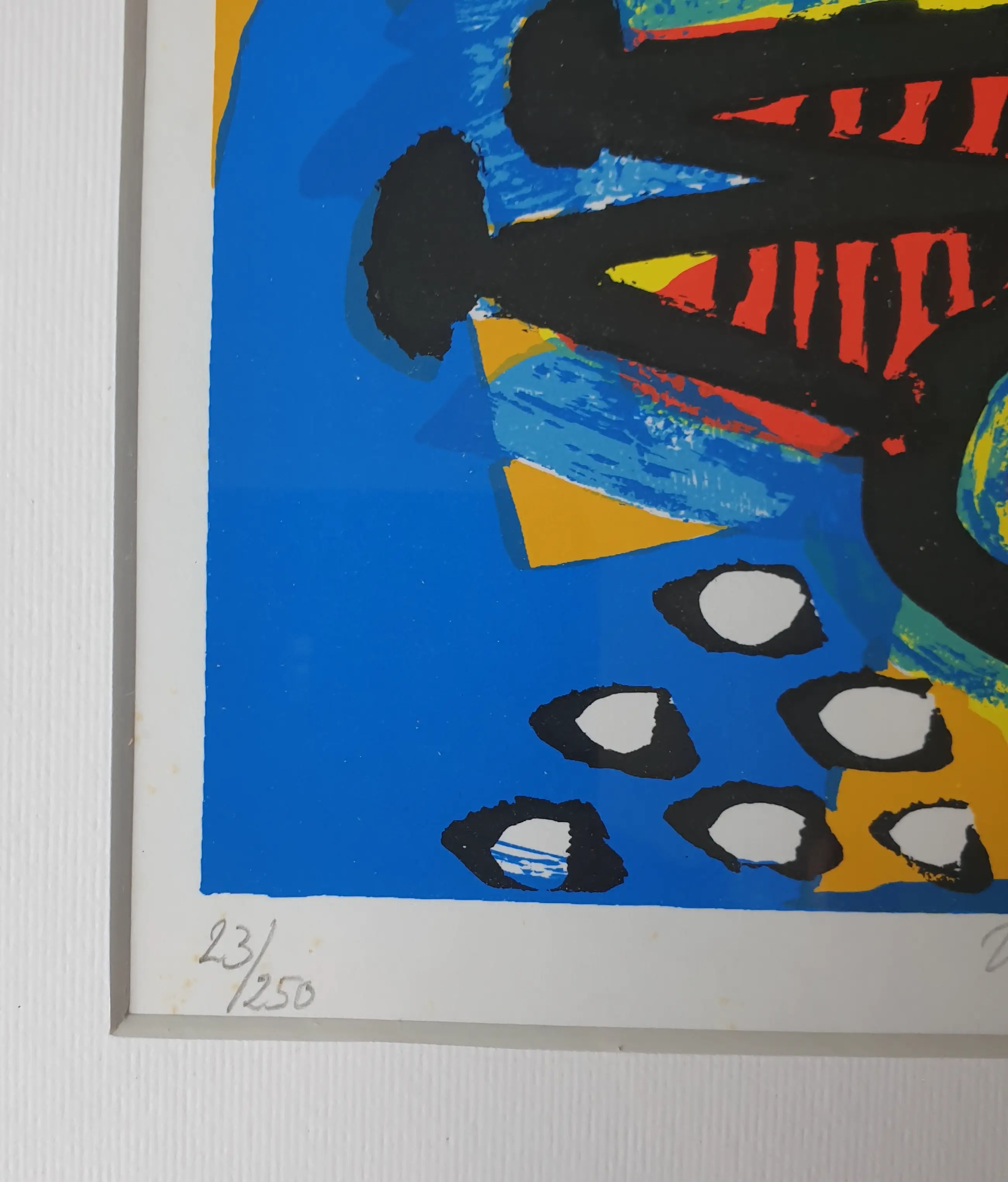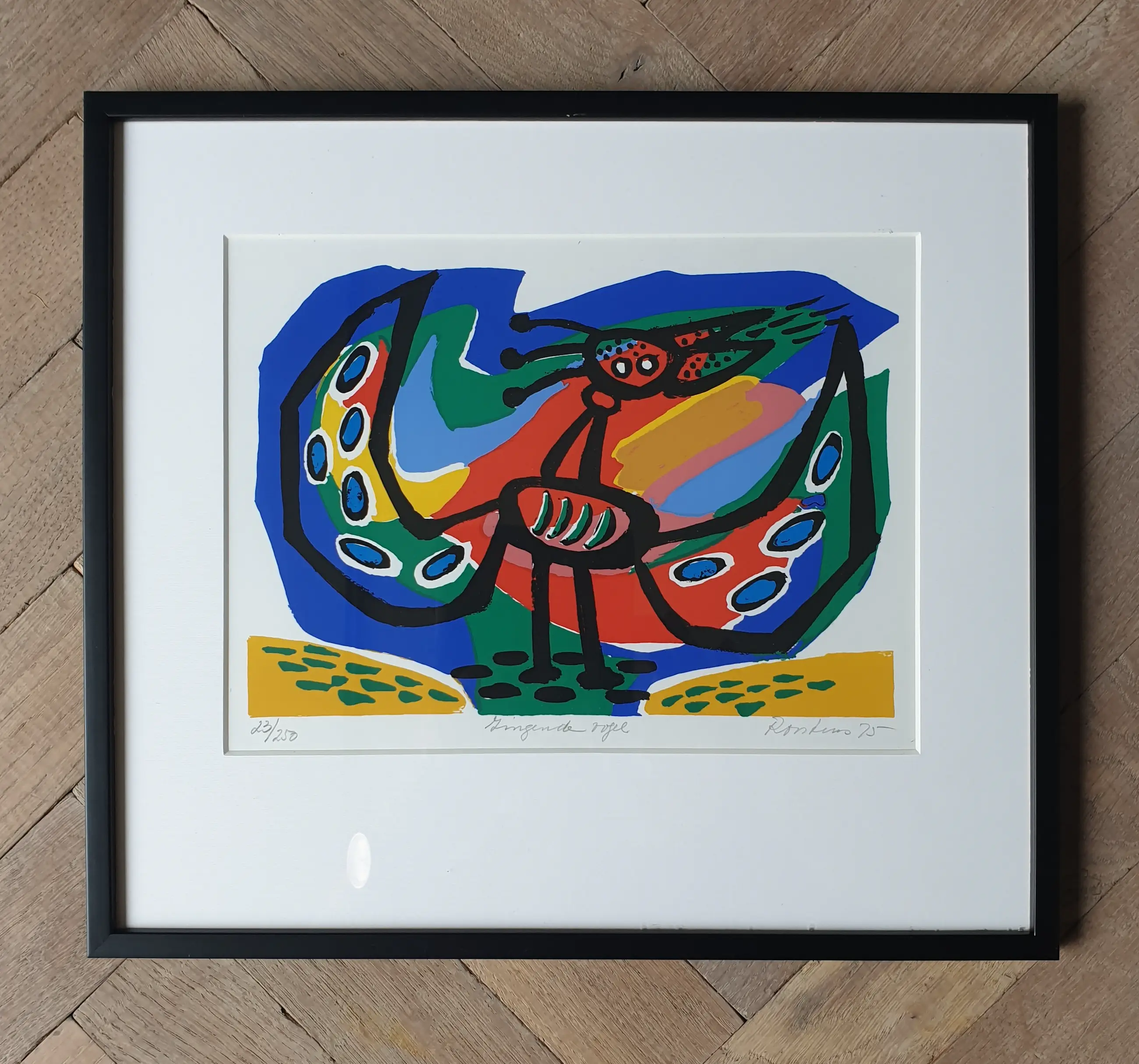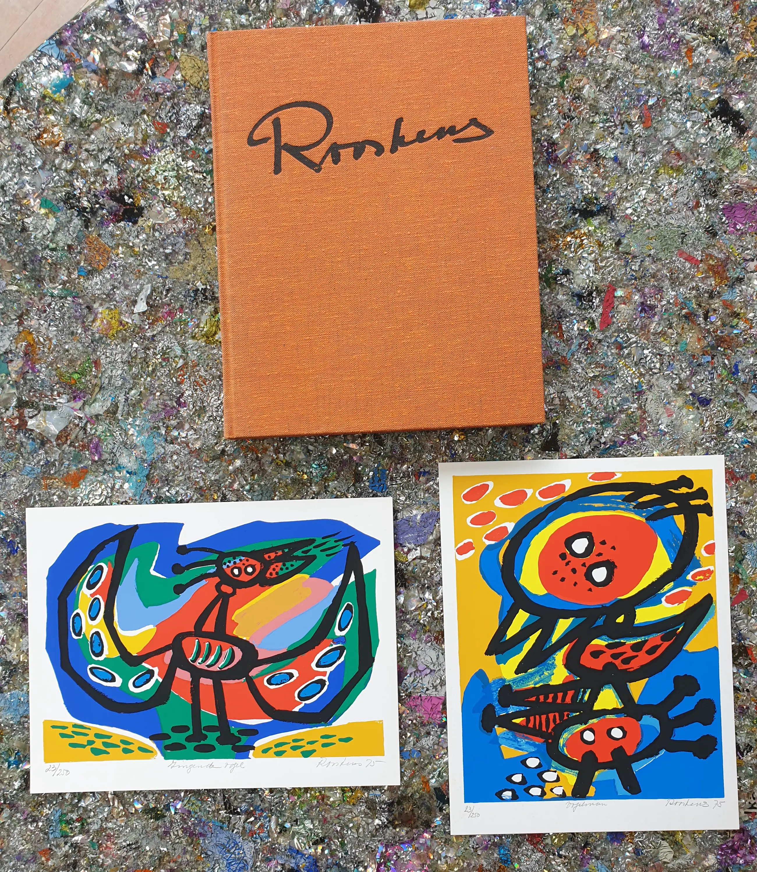 Van Cobra Kunstenaar Anton Rooskens (1906- 1976) , twee zeefdrukken met boek. De gesigneerde en genummerde zeefdrukken hebben als titel: "Zingende Vogel" & "Vogelman". Het werk komt uit 1975 en is verschenen als luxe editie er ere van zijn 70 ste verjaardag. De twee zeefdrukken en het boek hebben het nummer 23/250. Formaat van de ingelijste werken is 32 x 35 cm en 37 x 30 cm. Alles in nieuwstaat!