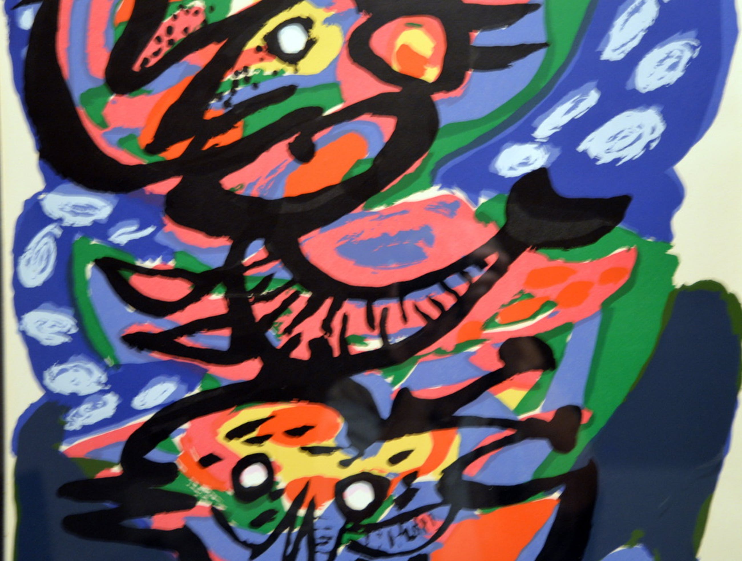 Prachtige, originele kleurenlitho van de bekende Nederlandse CoBrA-kunstenaar Anton Rooskens uit 1973. Mooi, groot formaat. Het werk is ingelijst in een hele fraaie lijst. Geverfd hout. Basiskleur gemeleerd aluminium met zwart kleurige passe-partout. Heel apart is de afwerking van het passe-partout. Langs de binnenrand, grenzend aan de afbeelding, is nog een smalle aluminium omlijsting aangebracht.