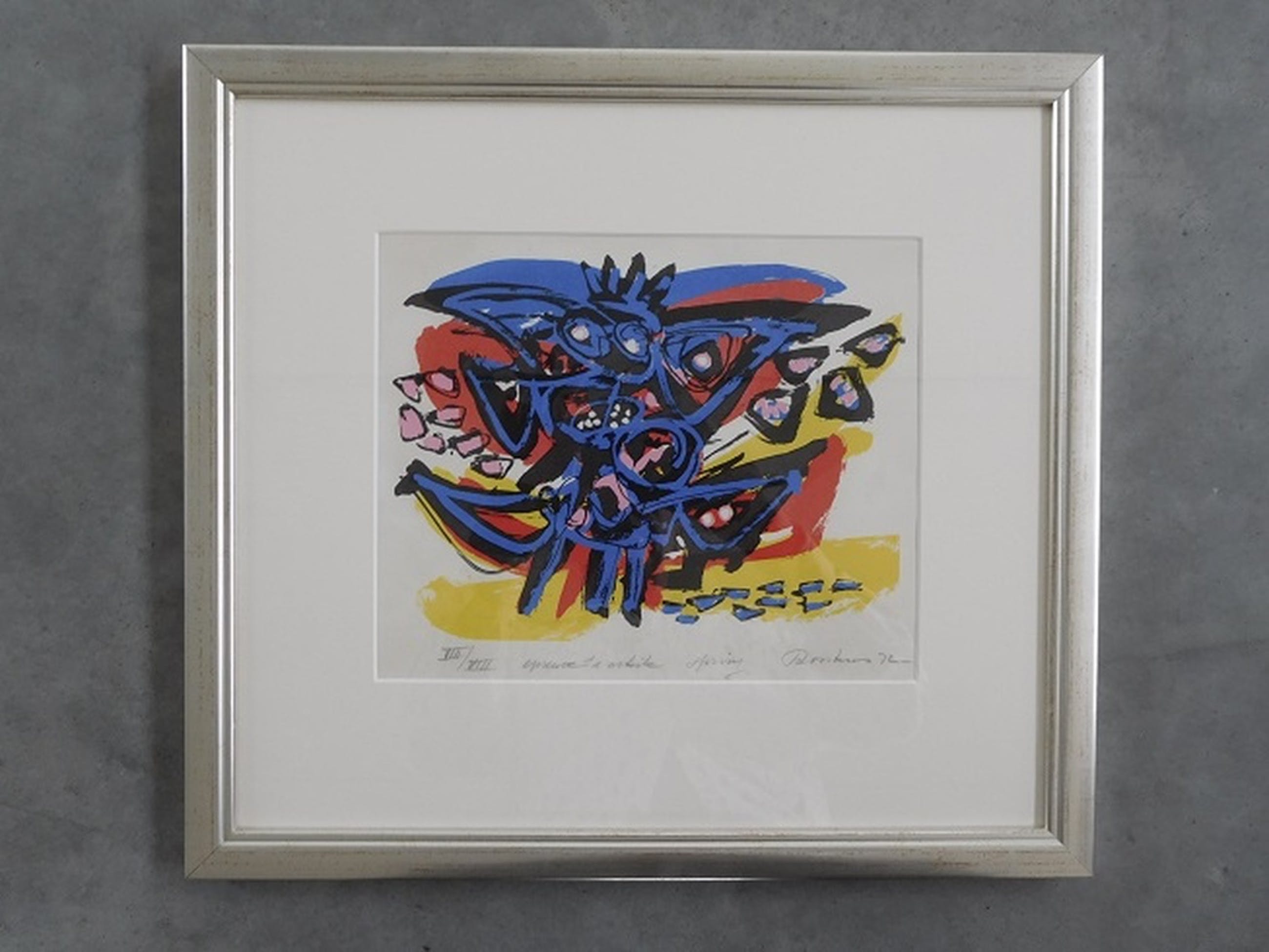 Typerende litho van Cobra kunstenaar Anton Rooskens uit 1972. Het werk meet inclusief zilveren houten lijst 44 x 40,5 cm. Het werk is getiteld "Spring", gesigneerd, gedateerd en genummerd "Epreuve d' Artiste VIII/VIII". Wordt aangetekend verstuurd.