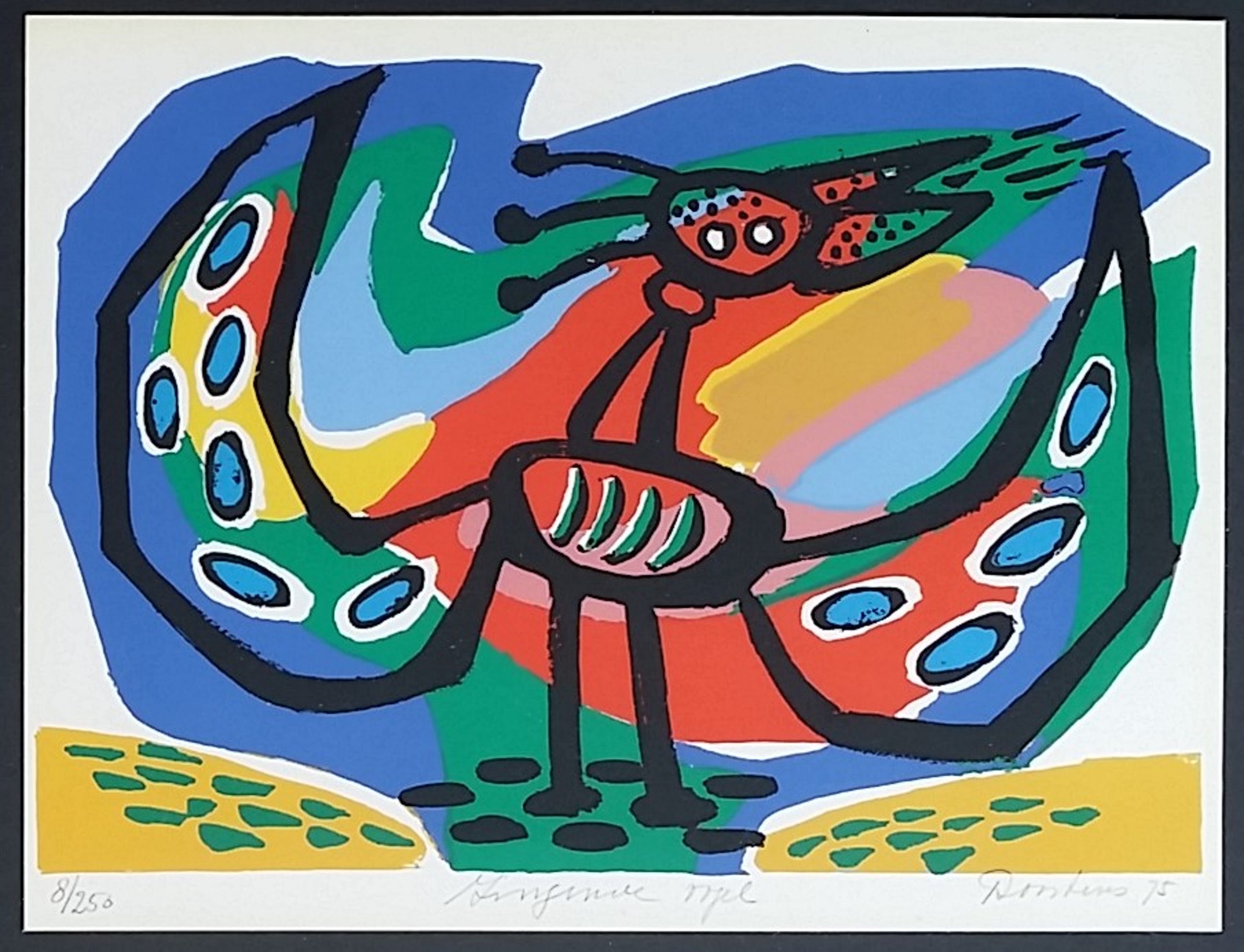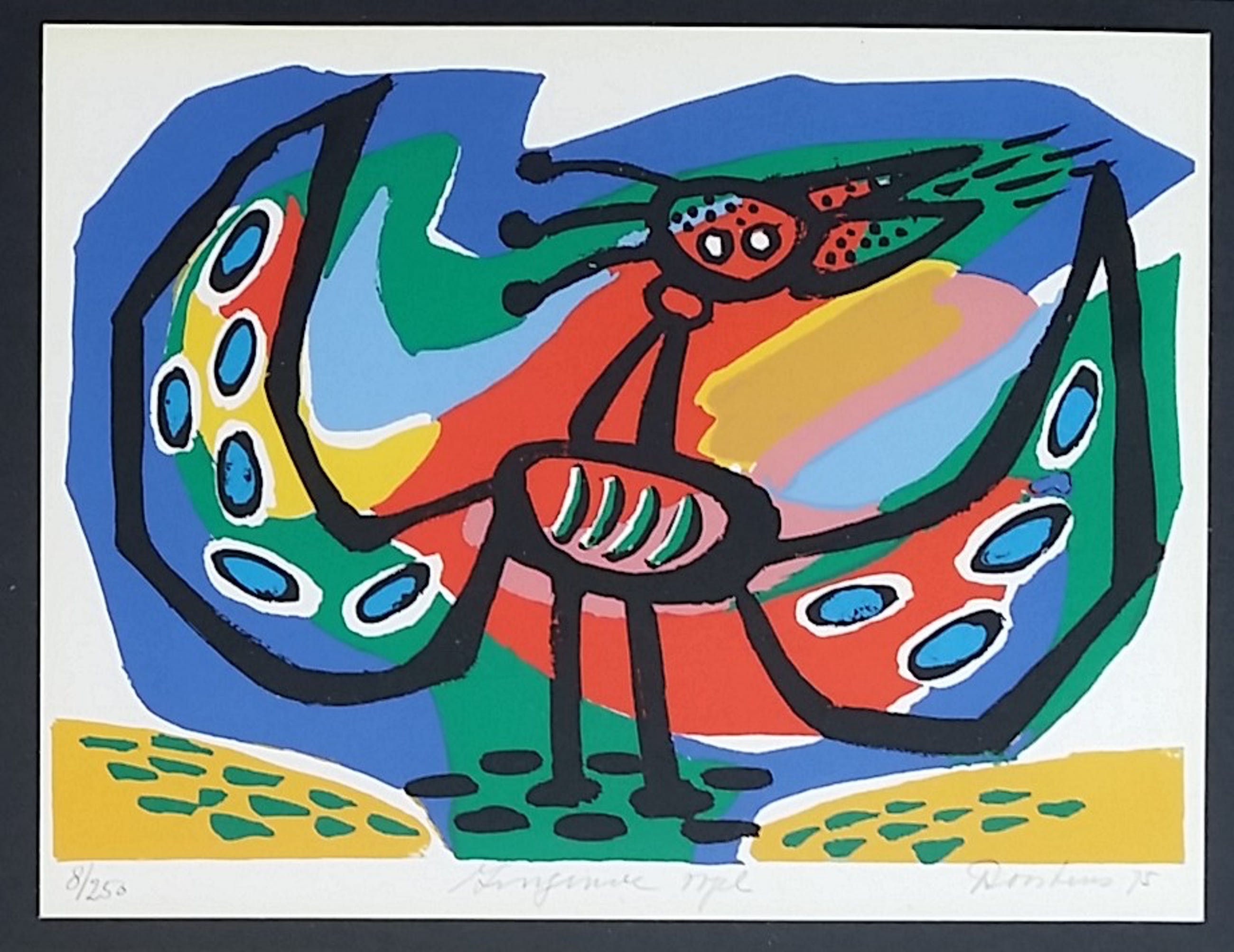 Mooie litho van Anton Rooskens getiteld "Zingende vogels" (1975). Mooi strak ingelijst, achter glas en met passepartout. Handgesigneerd, gedateerd en genummerd. Dit is nummer 8 uit een oplage van 250