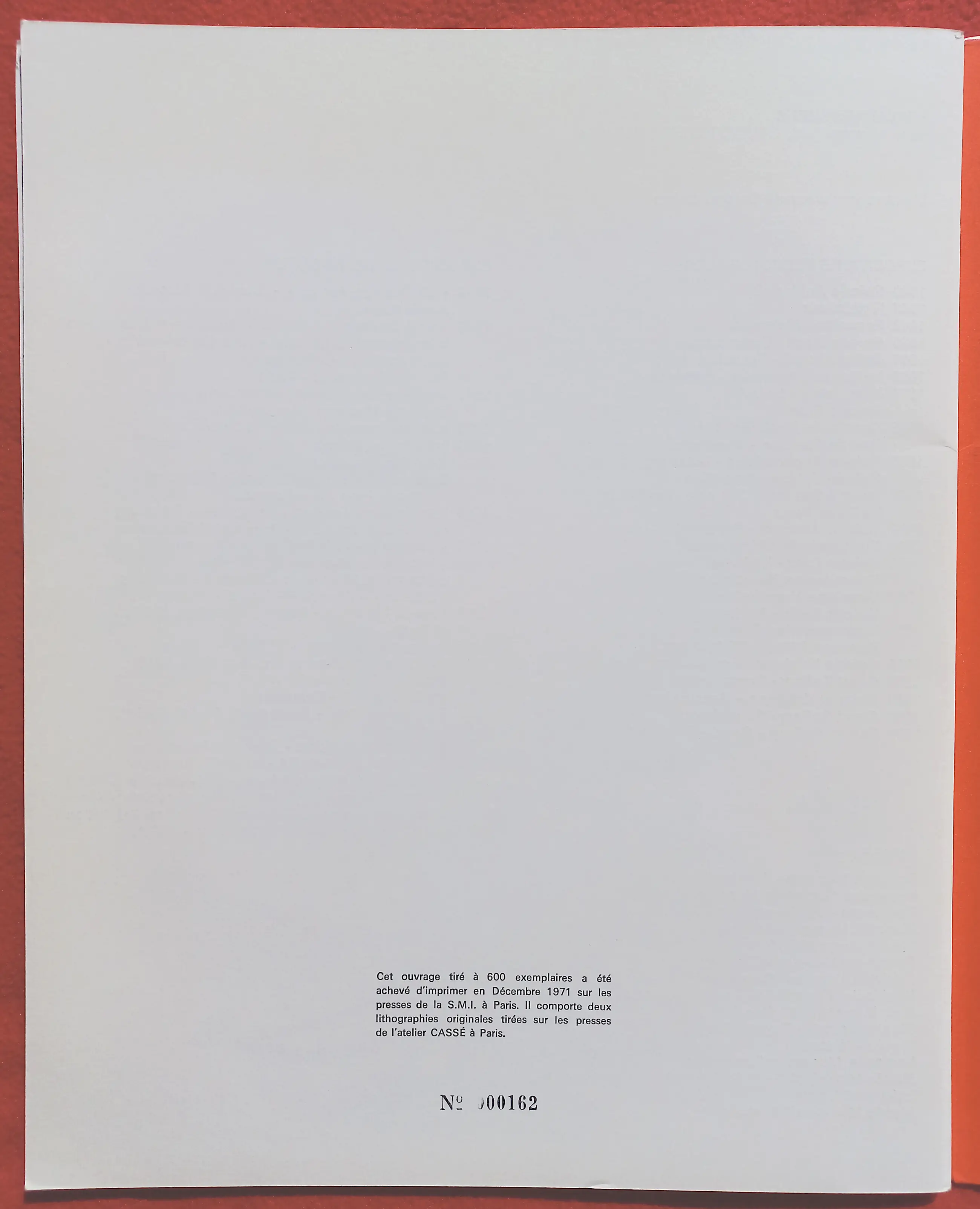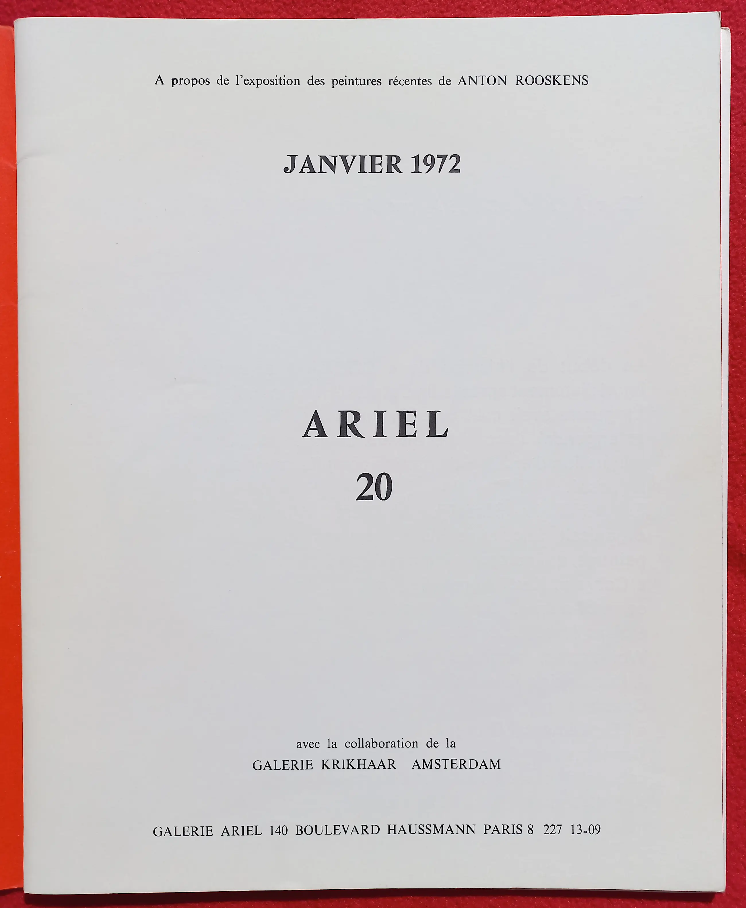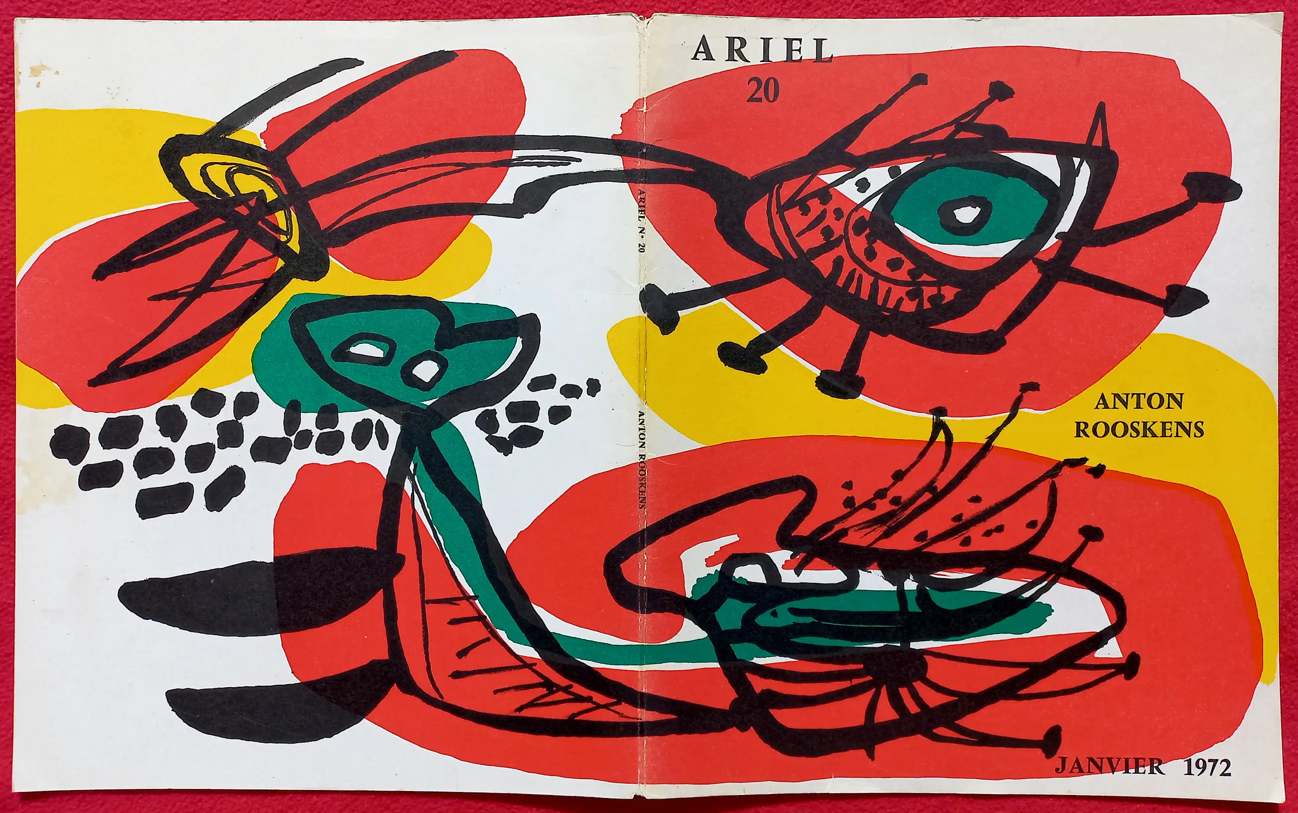 Complete en zeer verzamelwaardige publicatie van galerie Ariel (Parijs) ter gelegenheid van een expositie met werk van Anton Rooskens in 1972. De omslag en de “centerfold” zijn losbladige dubbelpagina litho’s. De centerfold heet “L’enfant aux Fleurs” (1971). Het eerste binnenblad van de publicatie is gesigneerd, gedateerd (7.1.72) en met opdracht (“voor Nico”). De publicatie werd uitgegeven in een oplage van 600, dit exemplaar is nummer 162. In zeer goede conditie; omslag linksboven wel een paar vlekjes.