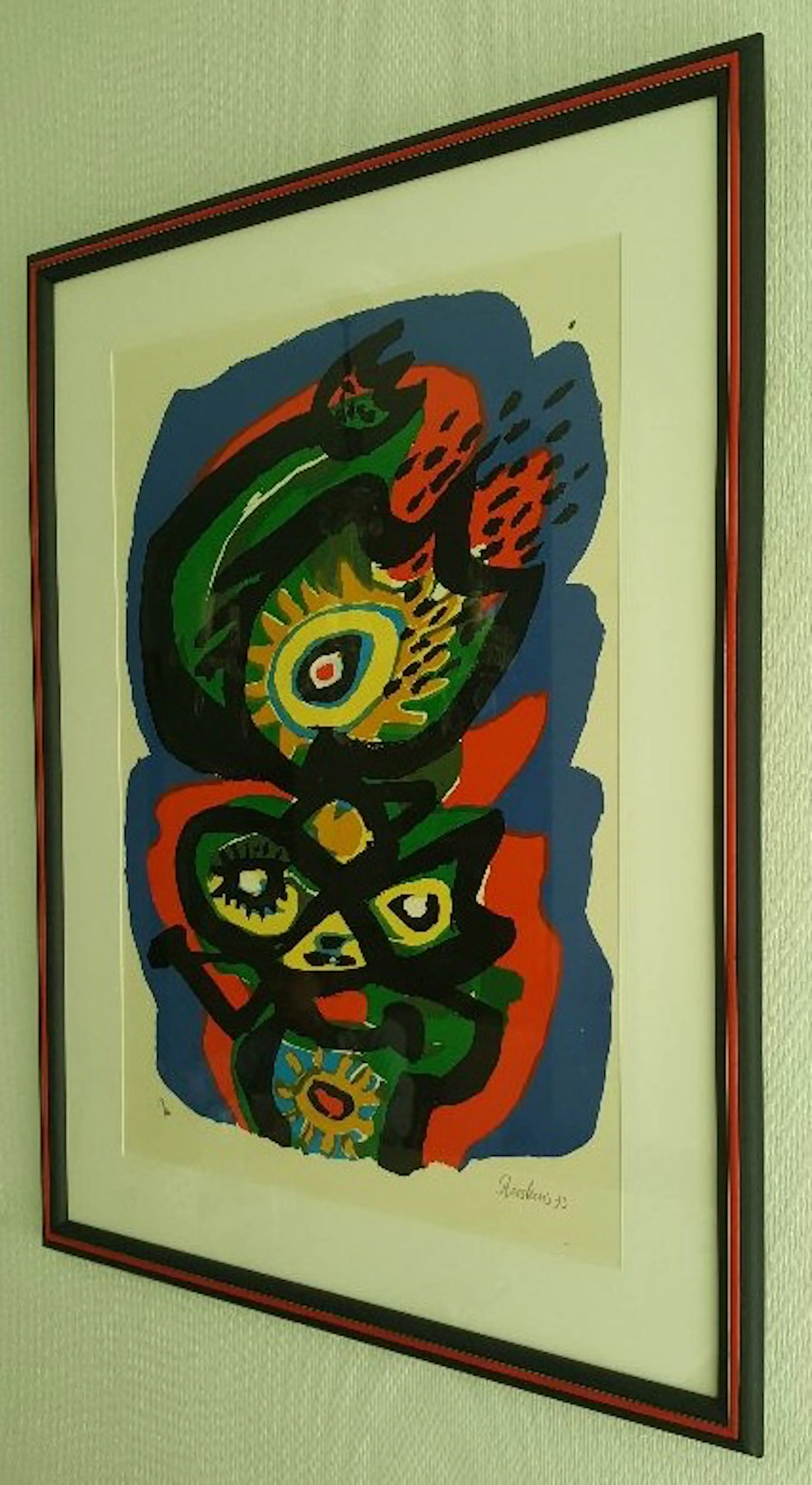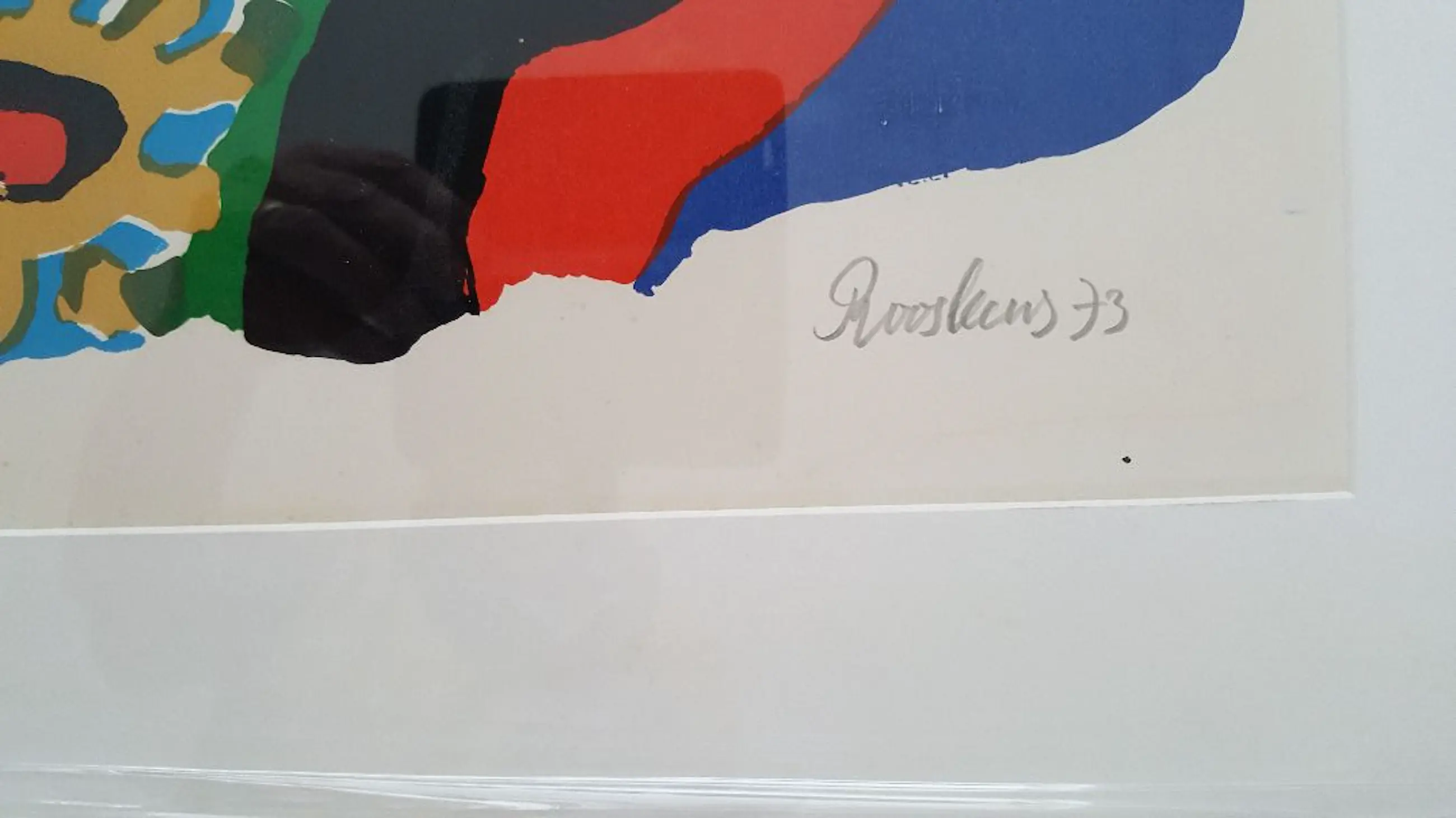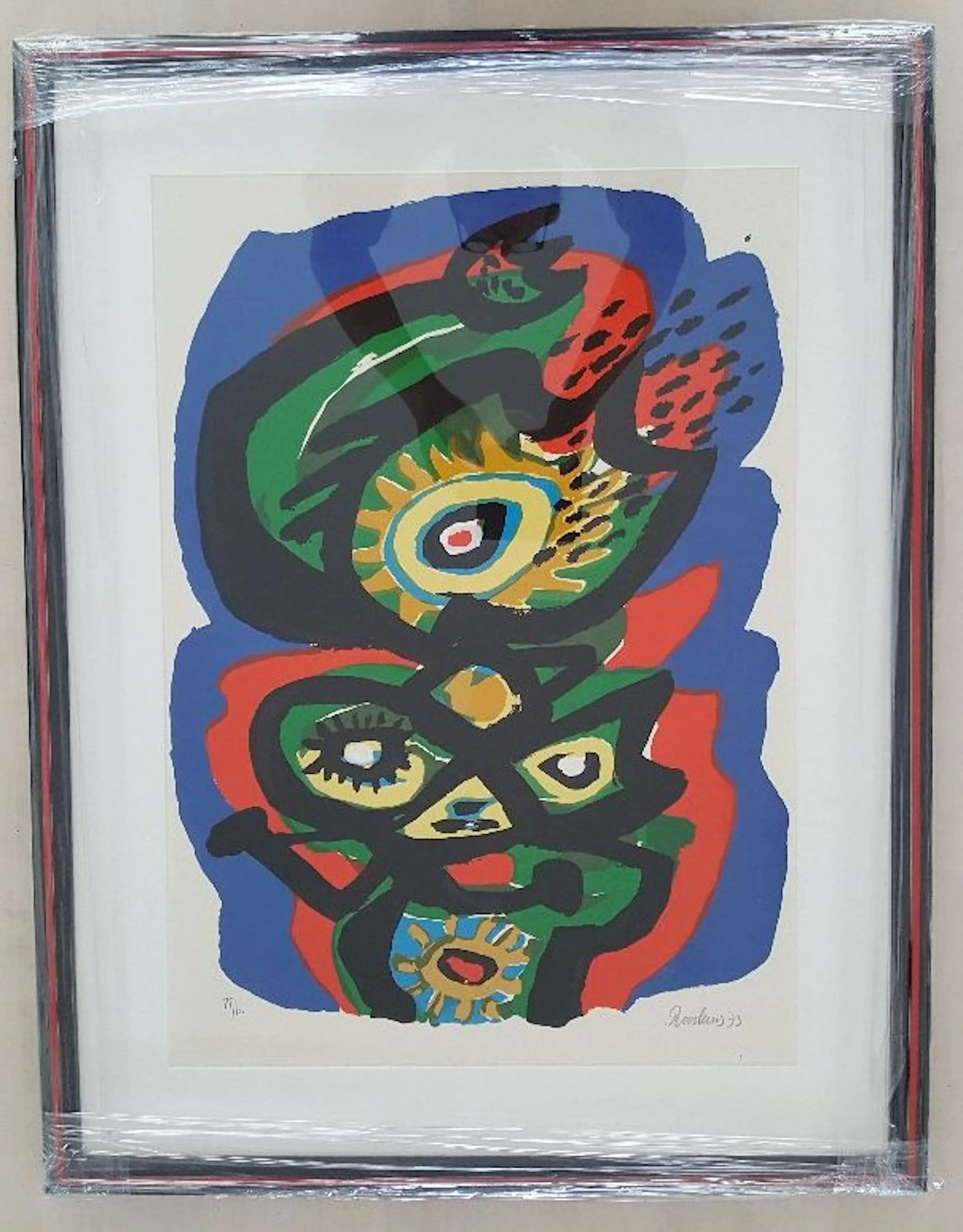 De zeefdruk ‘Birds 3’ van Anton Rooskens is nieuw ingelijst met een passepartout achter glas in een mooie bijpassende tweekleurige lijst. De zeefdruk en de lijst verkeren in goede staat. De lijst heeft de afmetingen in 70 x 2 x 90 cm. (L x B x H), het beeld is 48 x 69 (L x H). De zeefdruk is handgesigneerd, -genummerd (nummer 77) en -gedateerd (1973).