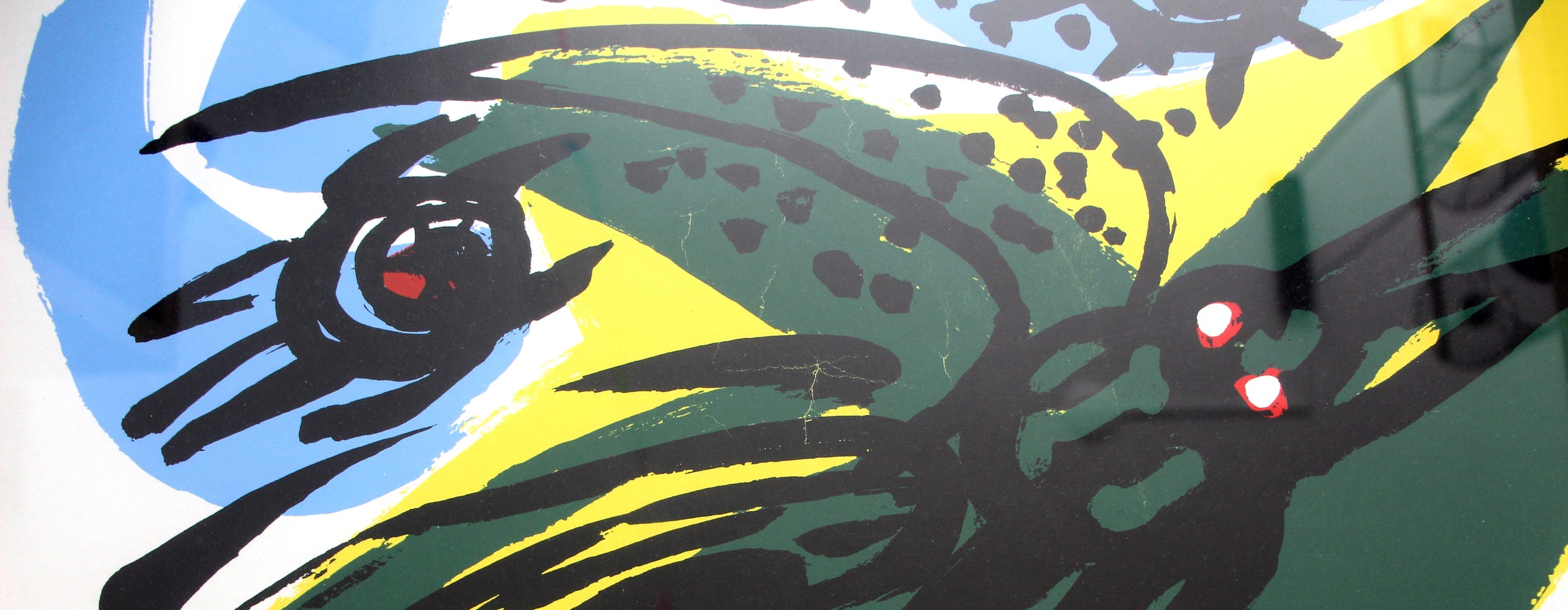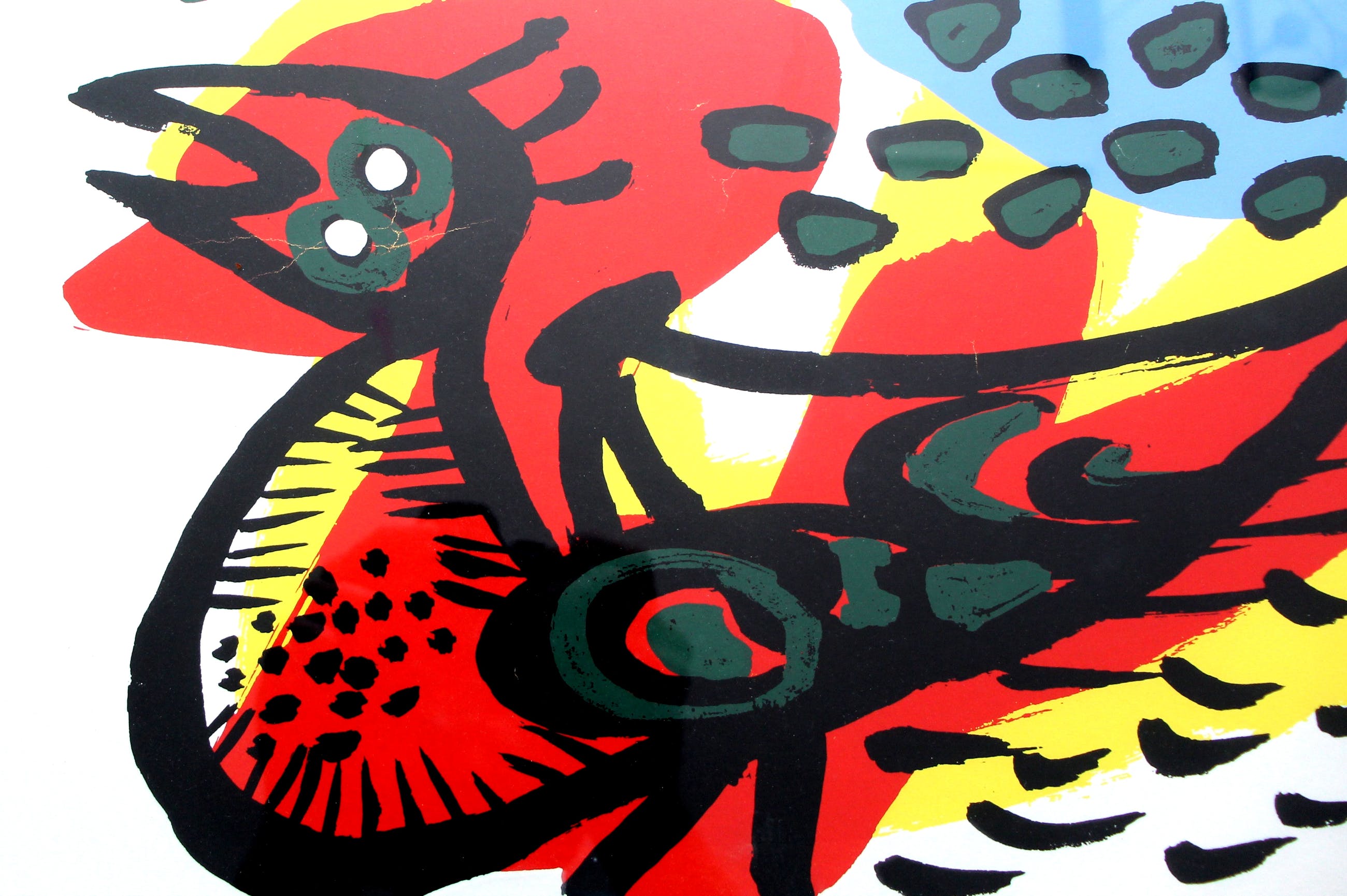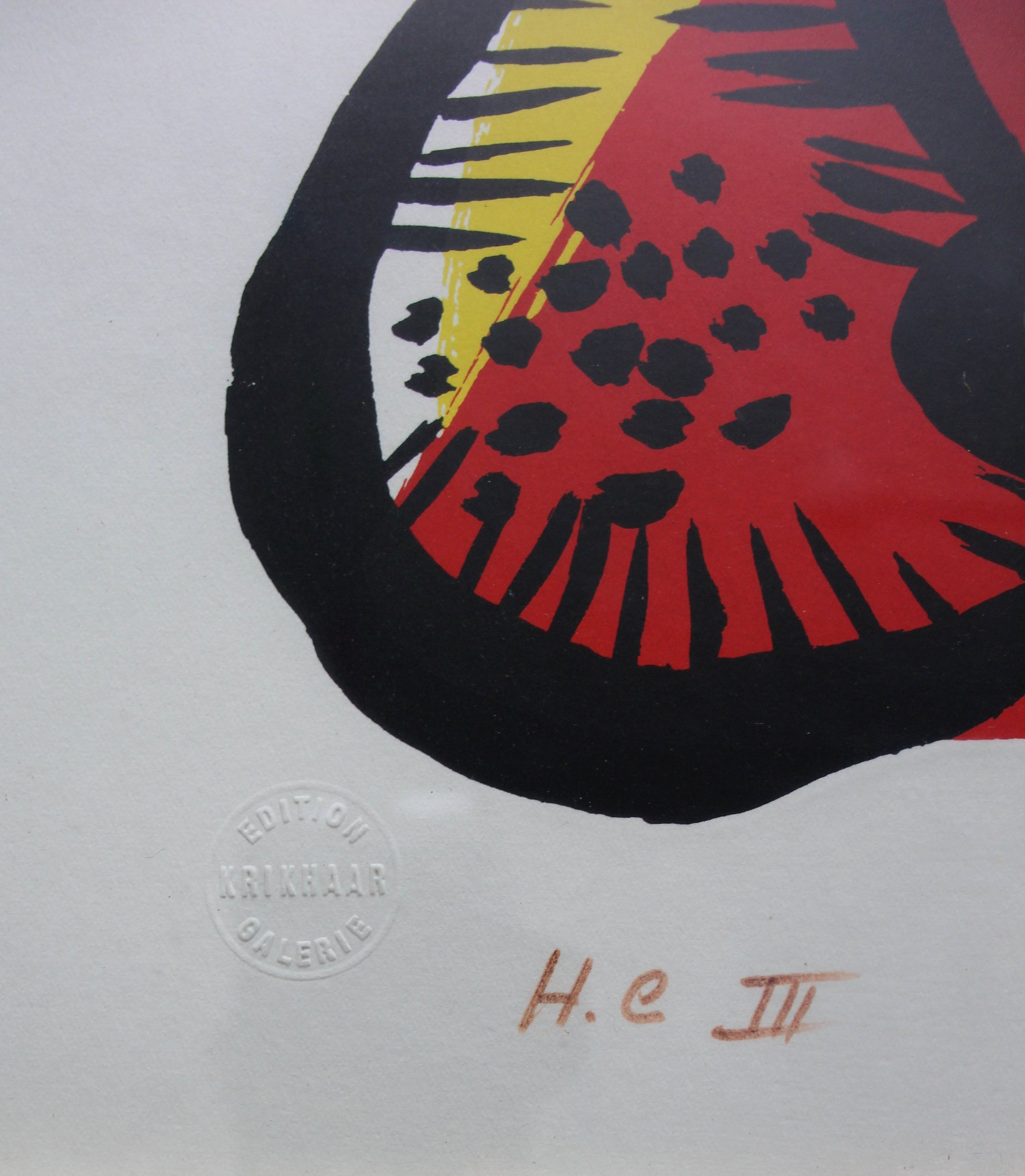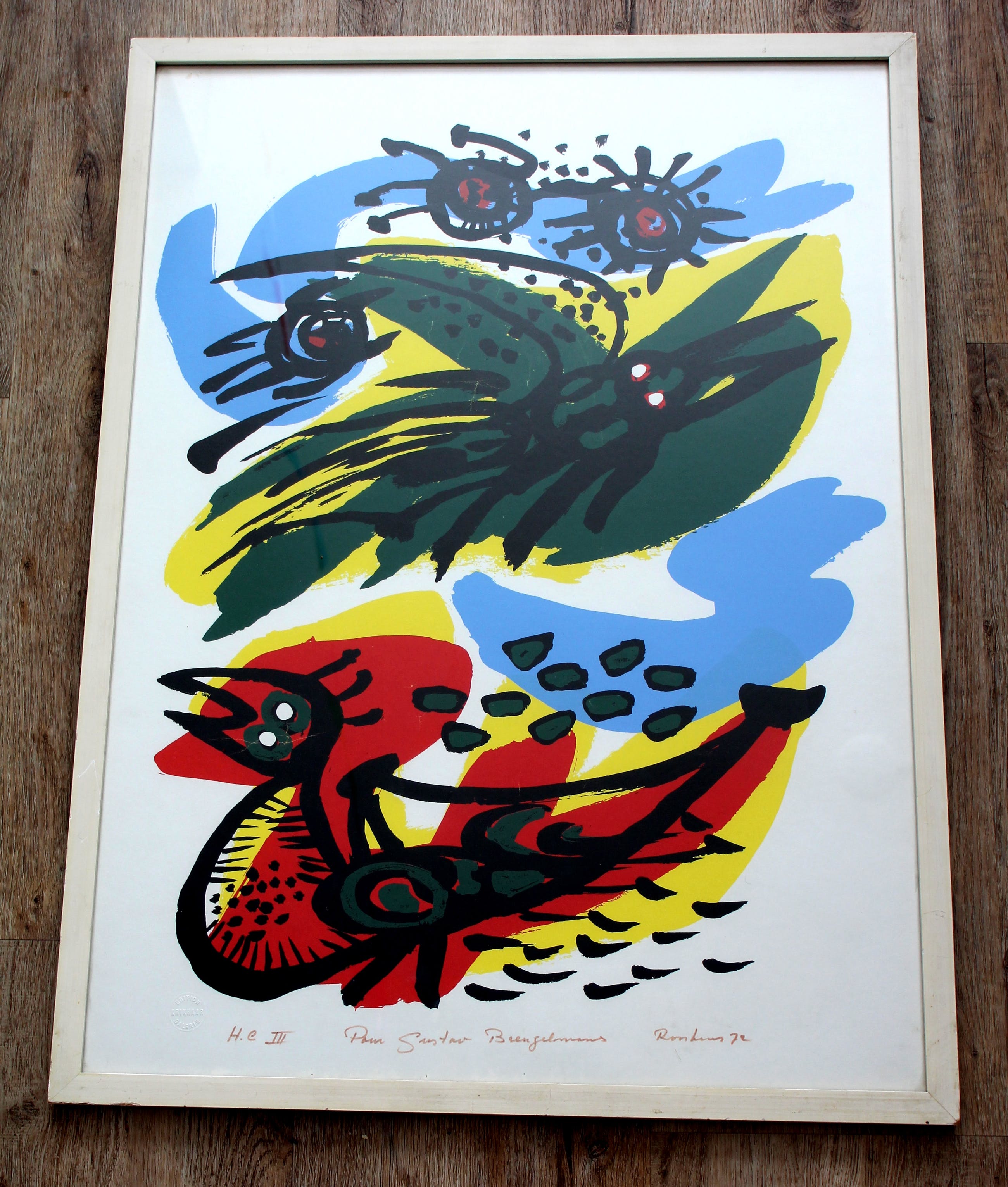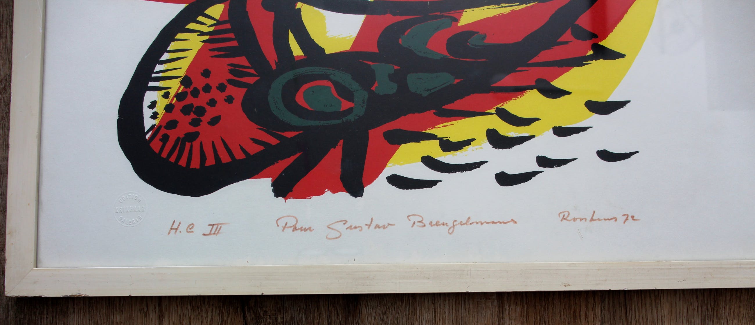 Mooi ingelijste zeefdruk van Anton Rooskens, Cobra-lid van het eerste uur. Afmetingen Incl lijst: H78 x b58cm. Afmetingen voorstelling: H65 x b50cm. "Pour Gustav Breugelmans".