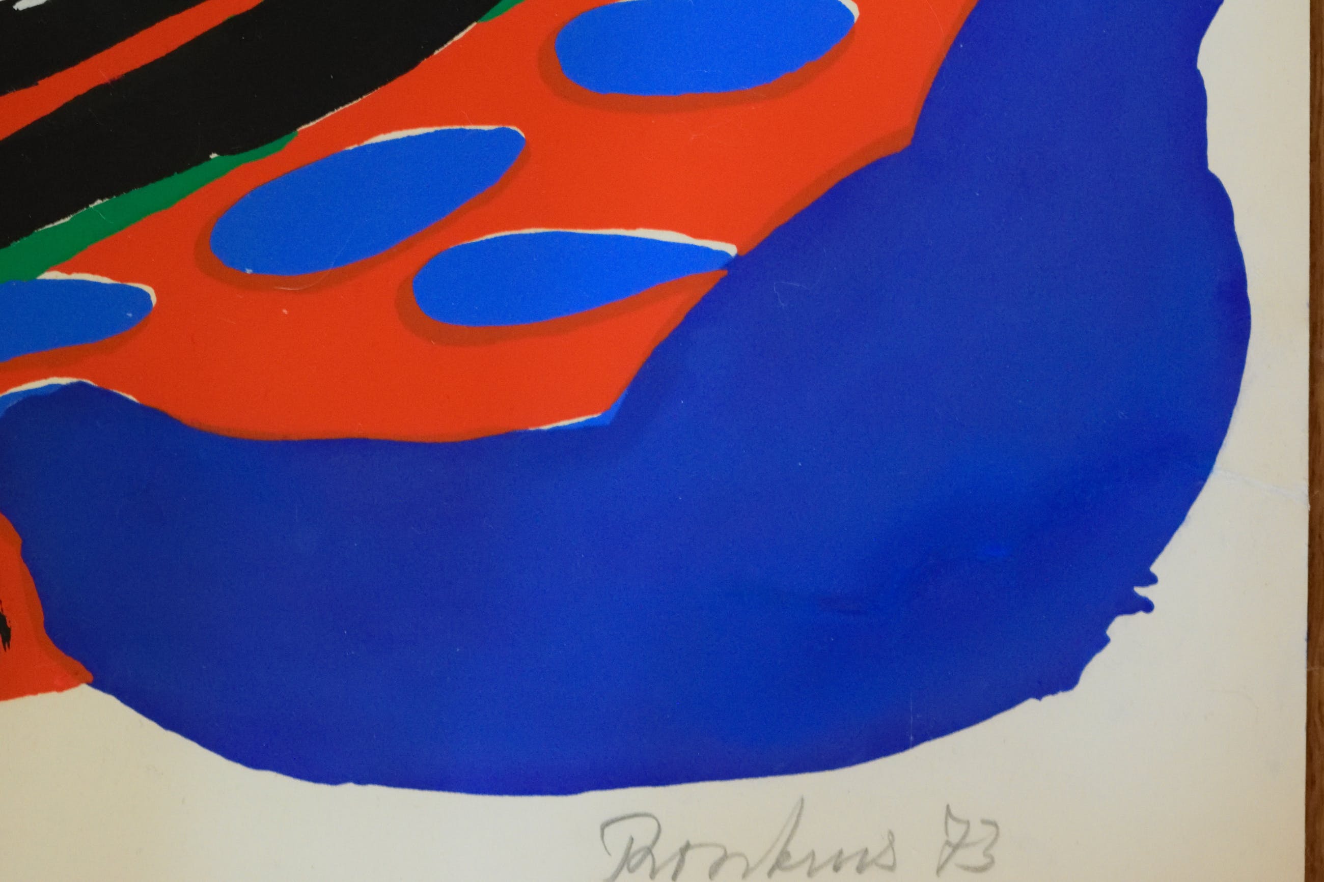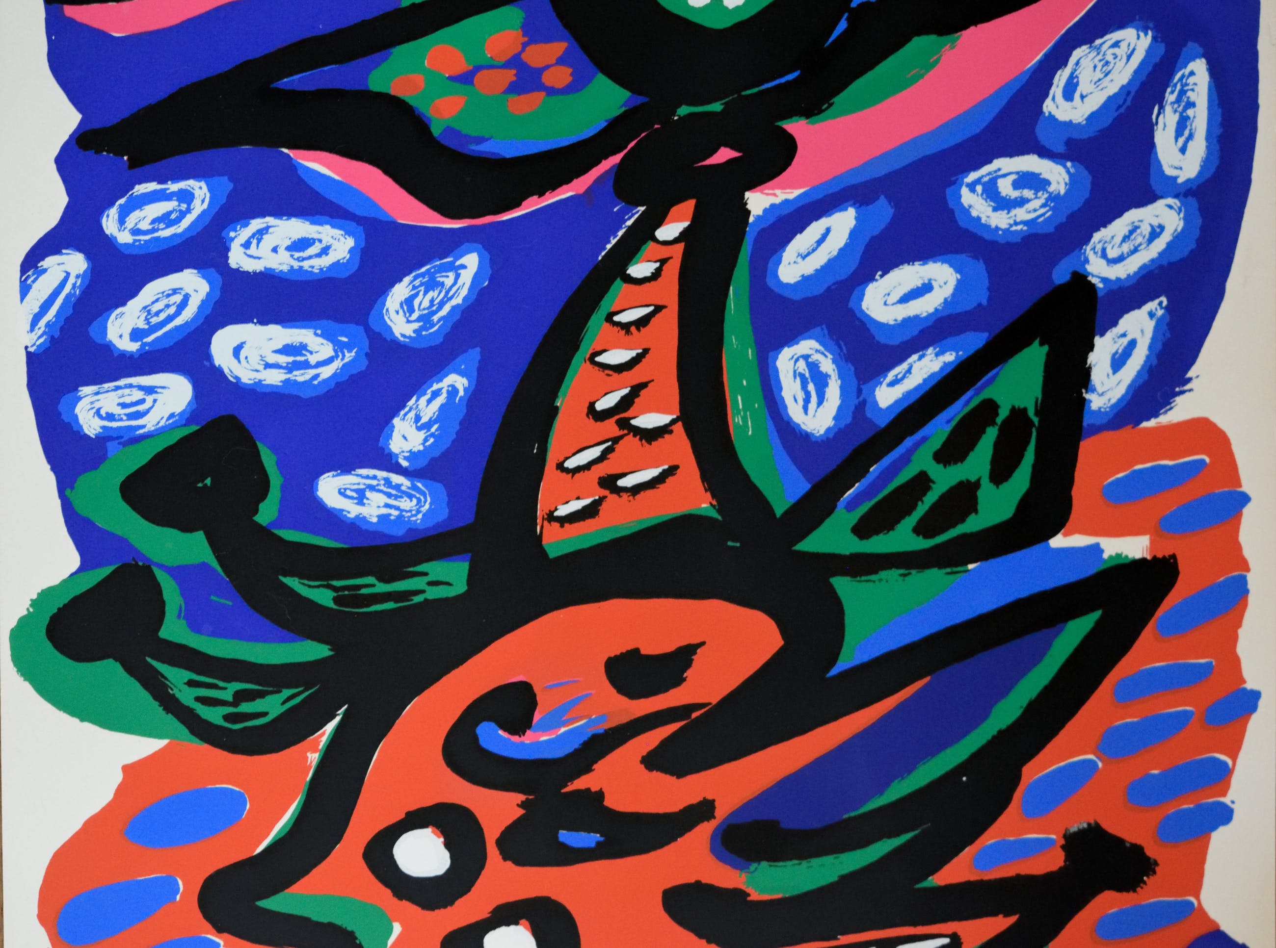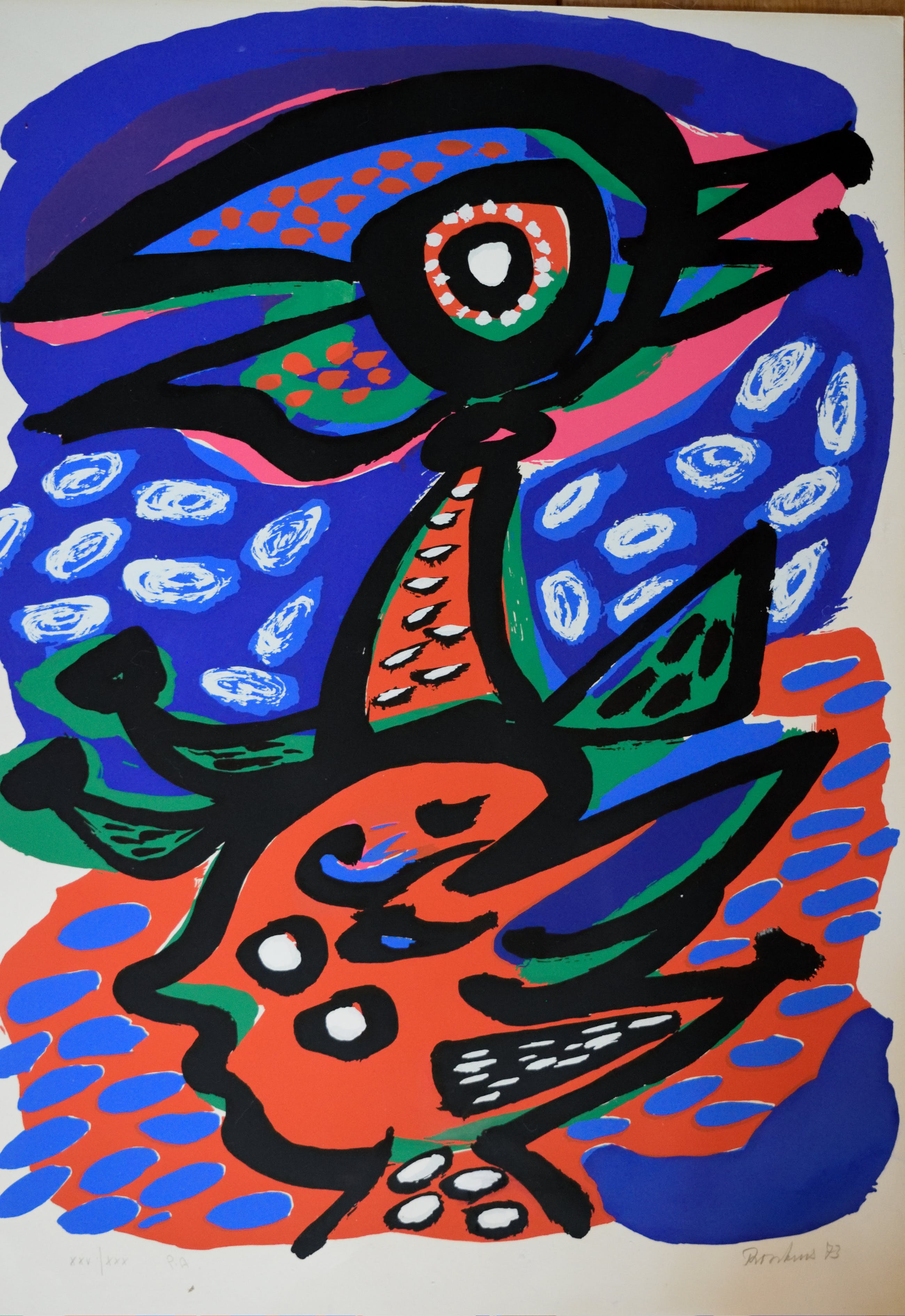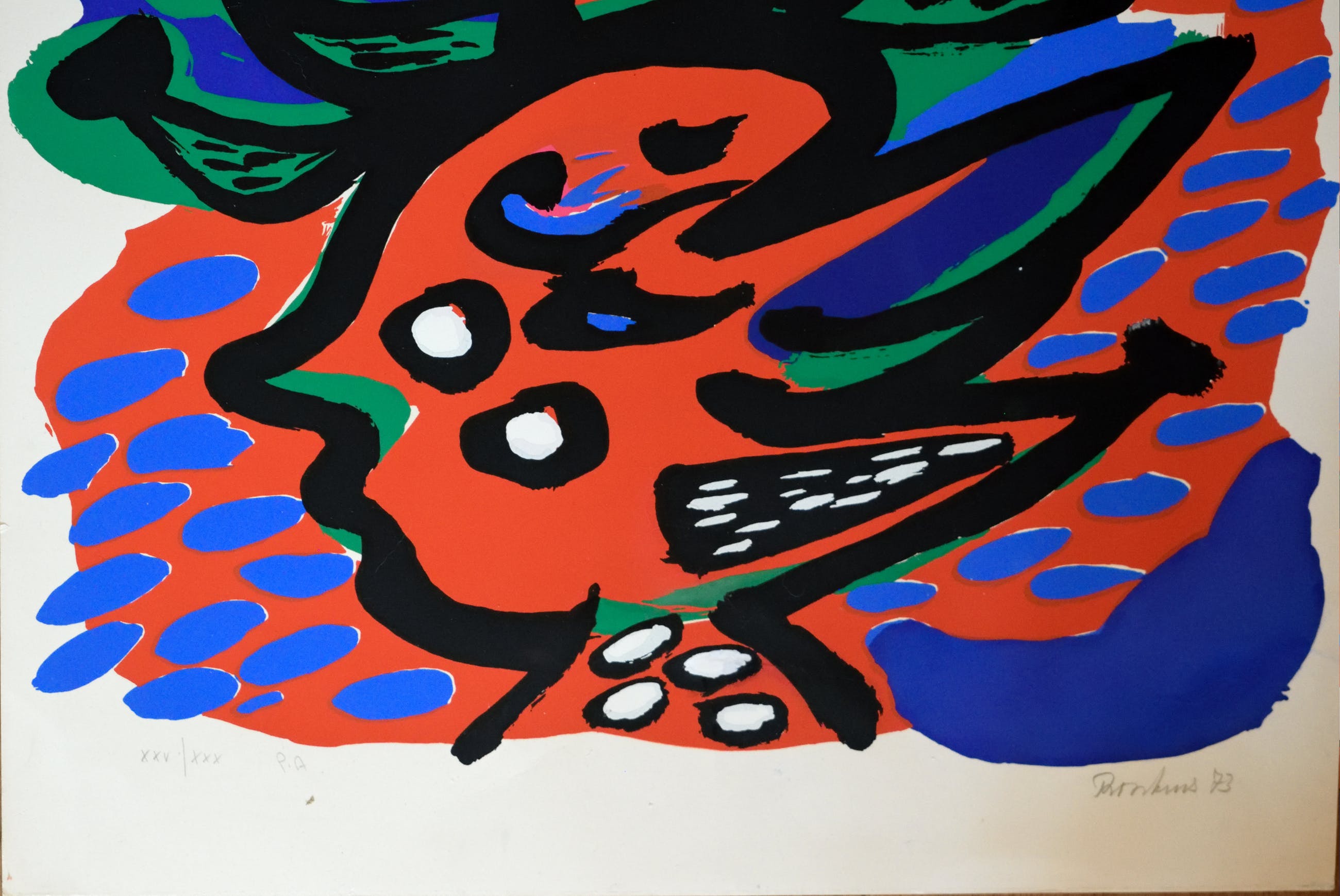 Originele kleurenlithografie van de bekende Nederlandse COBRA kunstenaar ANTON ROOSKENS. De litho stamt uit het jaar 1973. Handgesigneerd en genummerd door de kunstenaar. Totale oplage van 100 genummerde stuks en 30 Romeinsgenummerde A.P. Dit is een van de 30 st Romeinsgenummerde Artist Proofs. (P.A.) nr: XXV/XXX N.B. dit is een exemplaar dat door Rooskens zelf is bijgewerkt met Gouacheverf, Rechtsonder. Komt uit een privé verzameling van een Cobra verzamelaar.