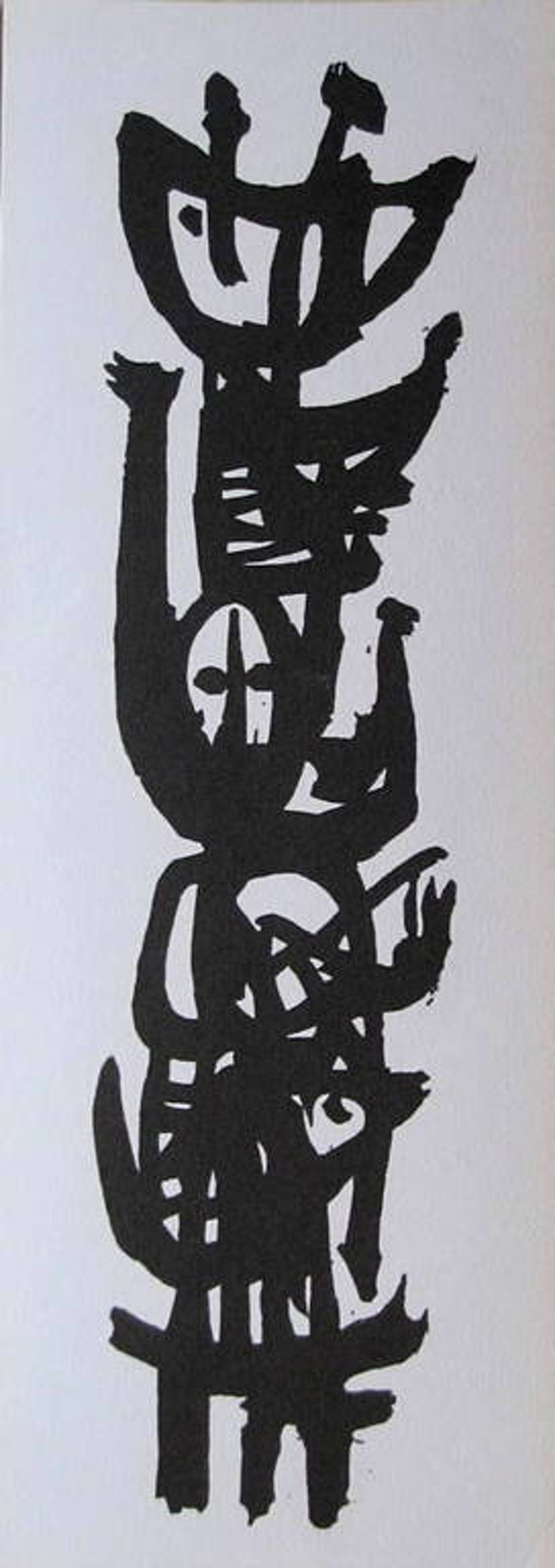 Bijzonderheden: Rooskens overleed 2 weken voordat hij deze lithografie kon ondertekenen. Hij stamt uit zijn Afrikaanse periode en is afgeleid van een houtdruk van 1952. (Zie de andere foto's van zijn studio en de foto van een lithografische poster uit 1952 waarop de houtdruk ook is te zien)