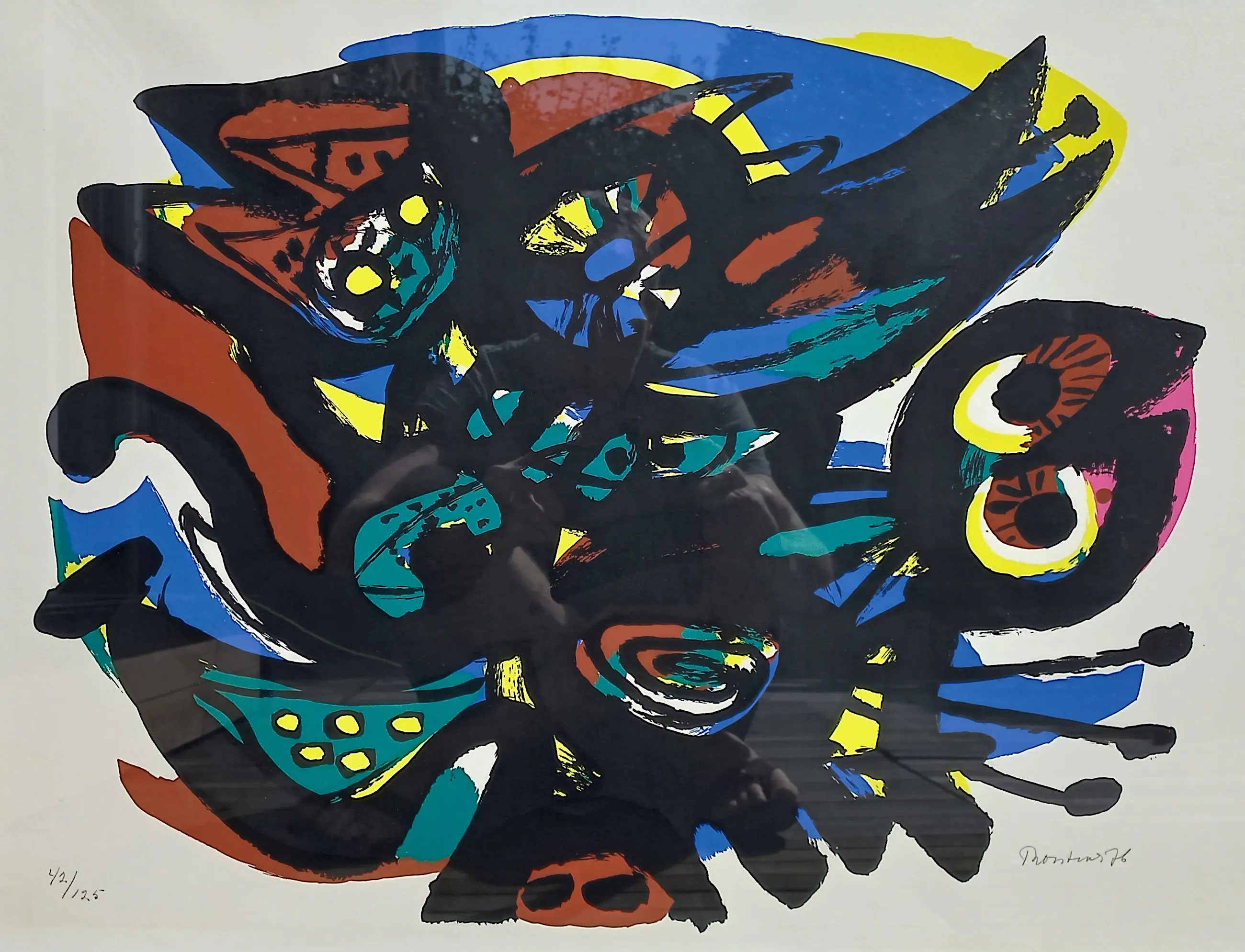 Zeer herkenbaar en mooi werk van Anton Rooskens. Zeefdruk op geschept papier, met potlood gesigneerd, gedateerd (’76) en genummerd (42/125). In strakke houten lijst, achter glas en met smetteloos, zuurvrij passe-partout. Afkomstig uit de kunstcollectie van ABNAMRO, in goede conditie.