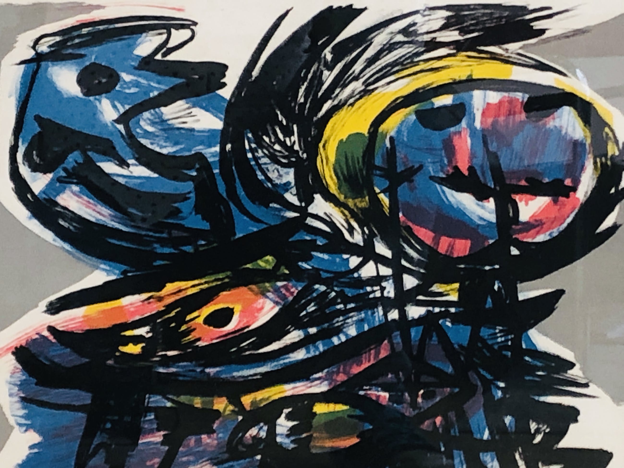 Mooie zeefdruk van CoBrA- kunstenaar Anton Rooskens. U kunt het werk vooraf komen bekijken in de Schatkamer van galerie Rotor in Gorcum, na aankoop afhalen of verzenden per koerier met lijst of zonder lijst per aangetekende post toegestuurd krijgen.Het werk zit in een eenvoudige gebruikte lijst. De foto is door het glas van de lijst heen genomen.