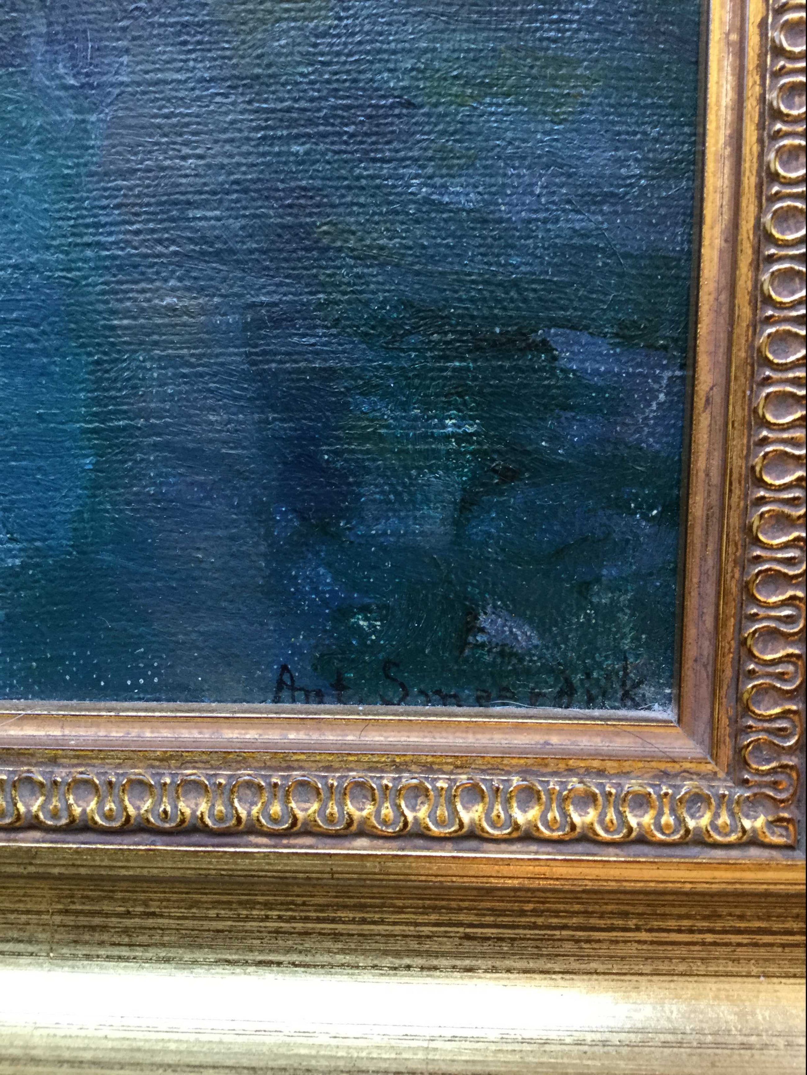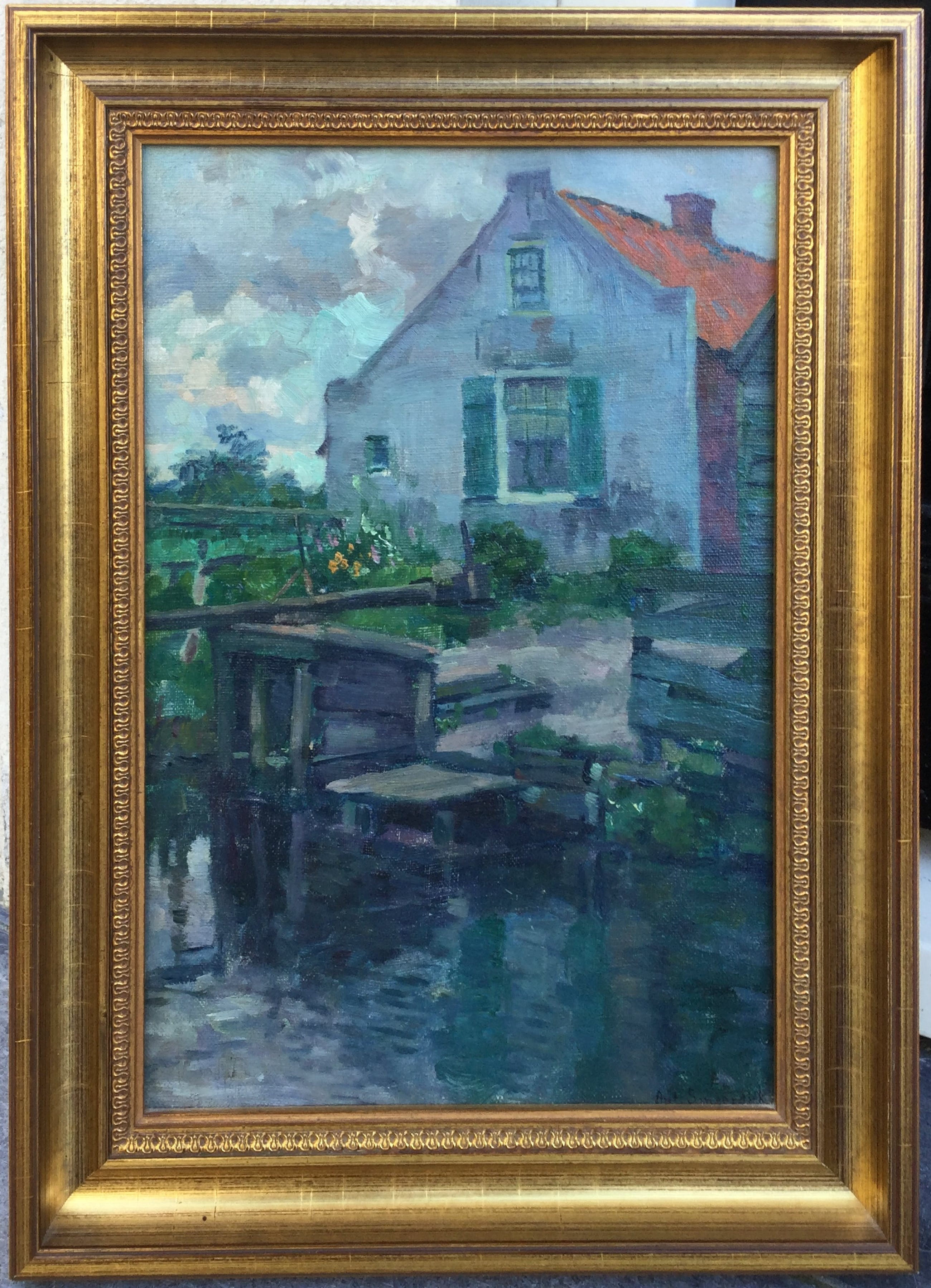| Schilderij bevat vergeelde vernis, oppervlaktevuil, karton onder het doek is iets gaan bobbelen langs bovenzijde, lijst bevat oppervlaktevuil en slijtschade door de tijd. | |