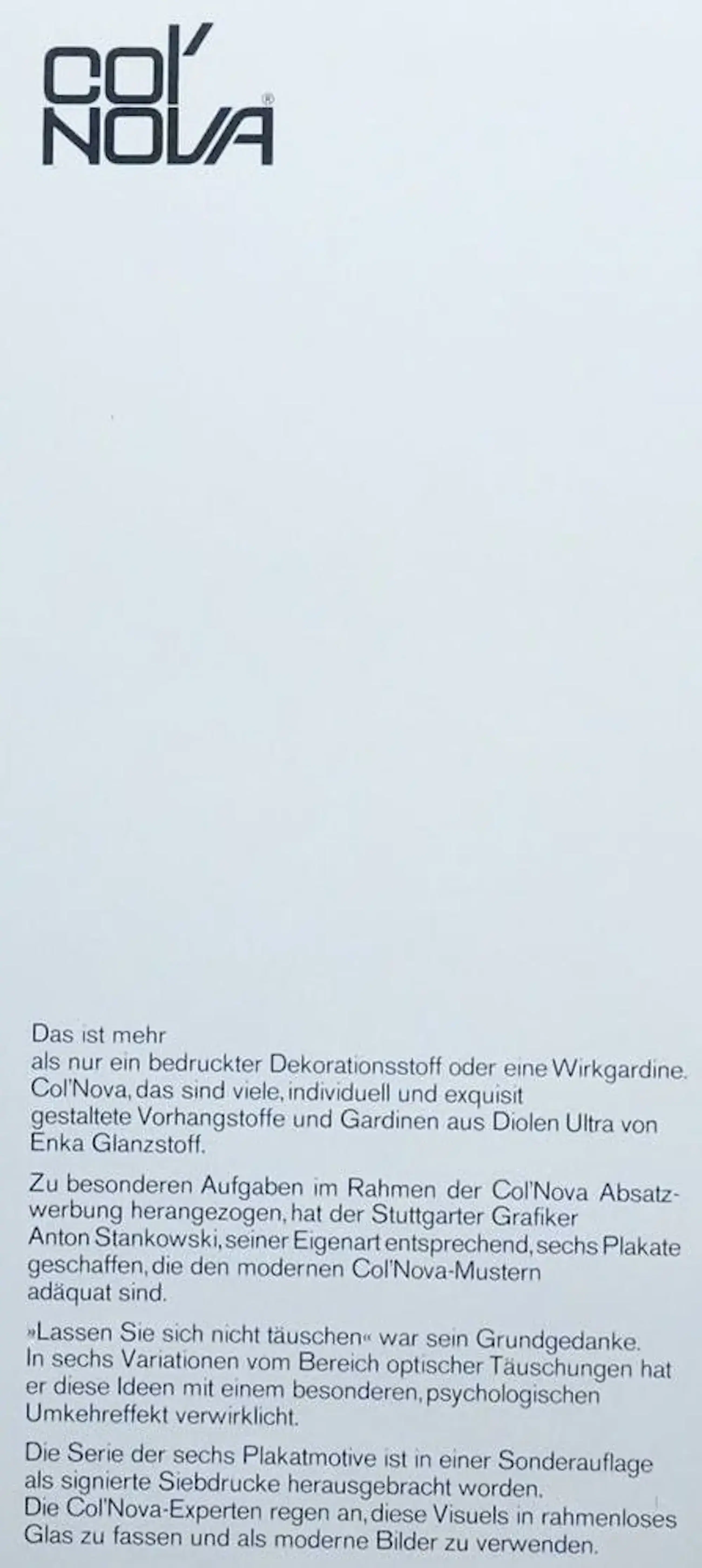 Zeefdruk van Anton Stankowski. Titel: Col'nova. Afmetingen blad: H50 x b50cm. Afmetingen voorstelling: H42 x b42cm. Het werk is, rechts onderaan, gesigneerd door de kunstenaar. De authenticiteit van het, aangeboden, werk wordt volledig gegarandeerd. Een certificaat van echtheid kan, op aanvraag, worden gemaild.