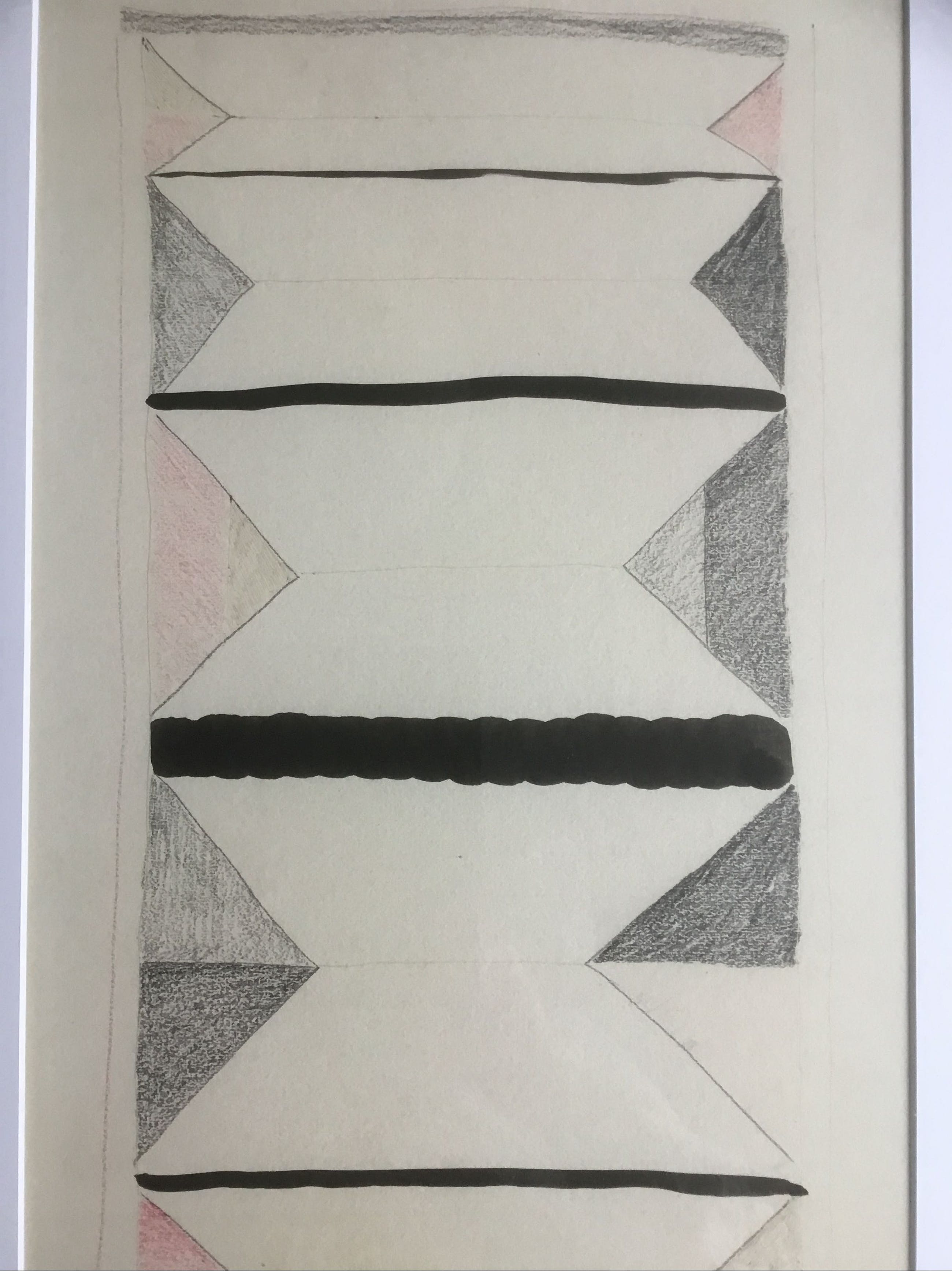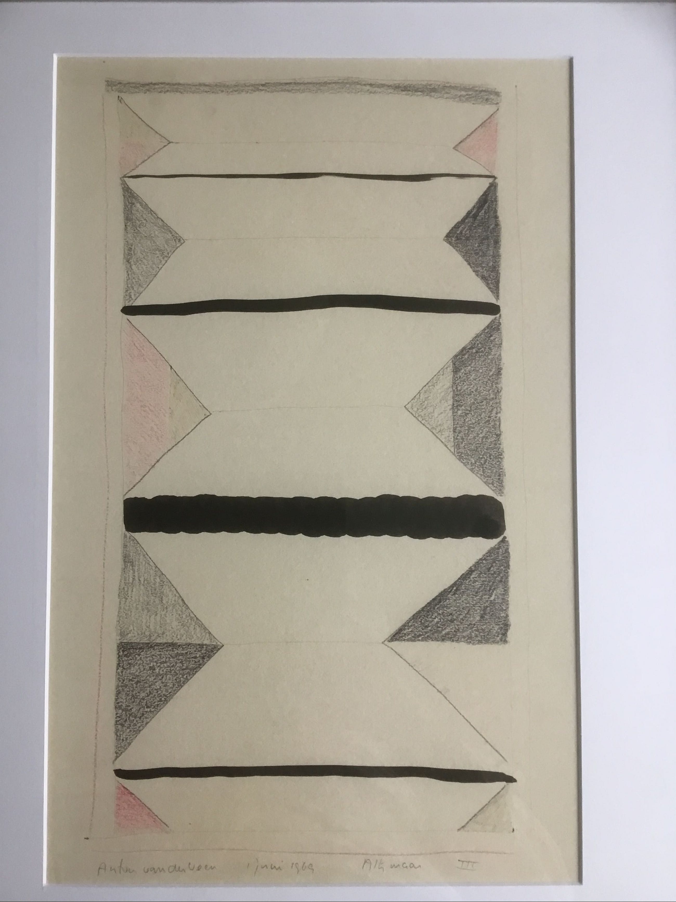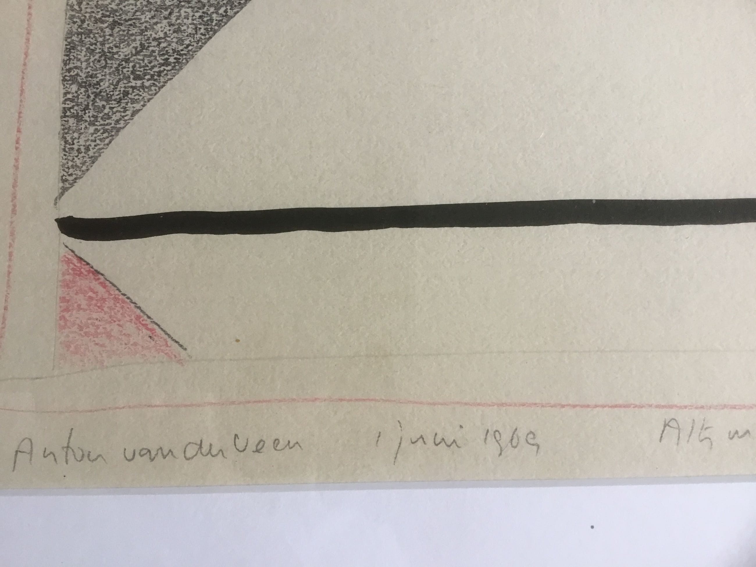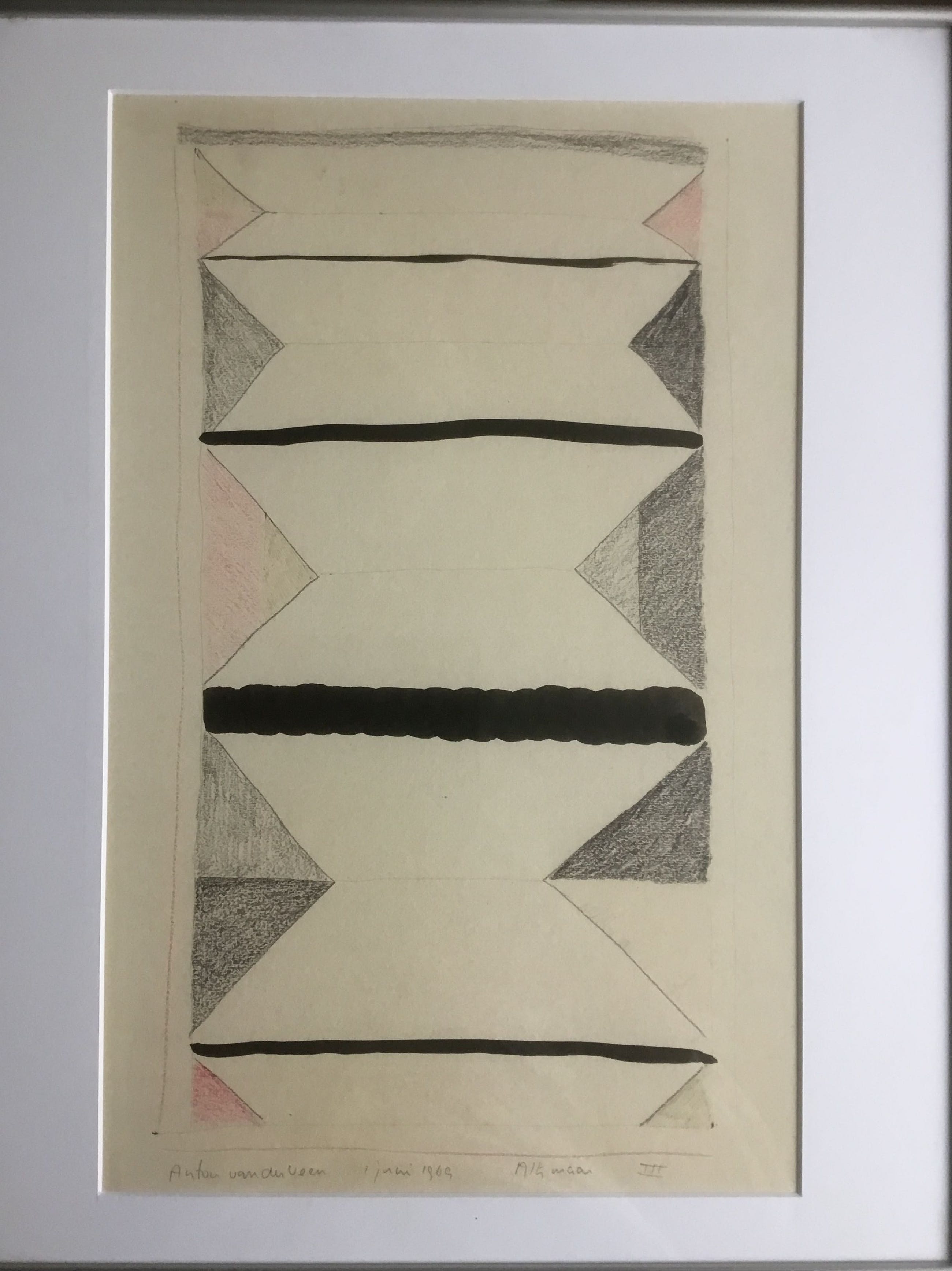 Mooi Geometrisch werk van de graficus en tekenaar Anton van der Veen. Het is een potlood met verf tekening. Hij heeft onder andere les gehad van Bram van de Velde. Het werk is gedateerd 1 juni 1969, Alkmaar.