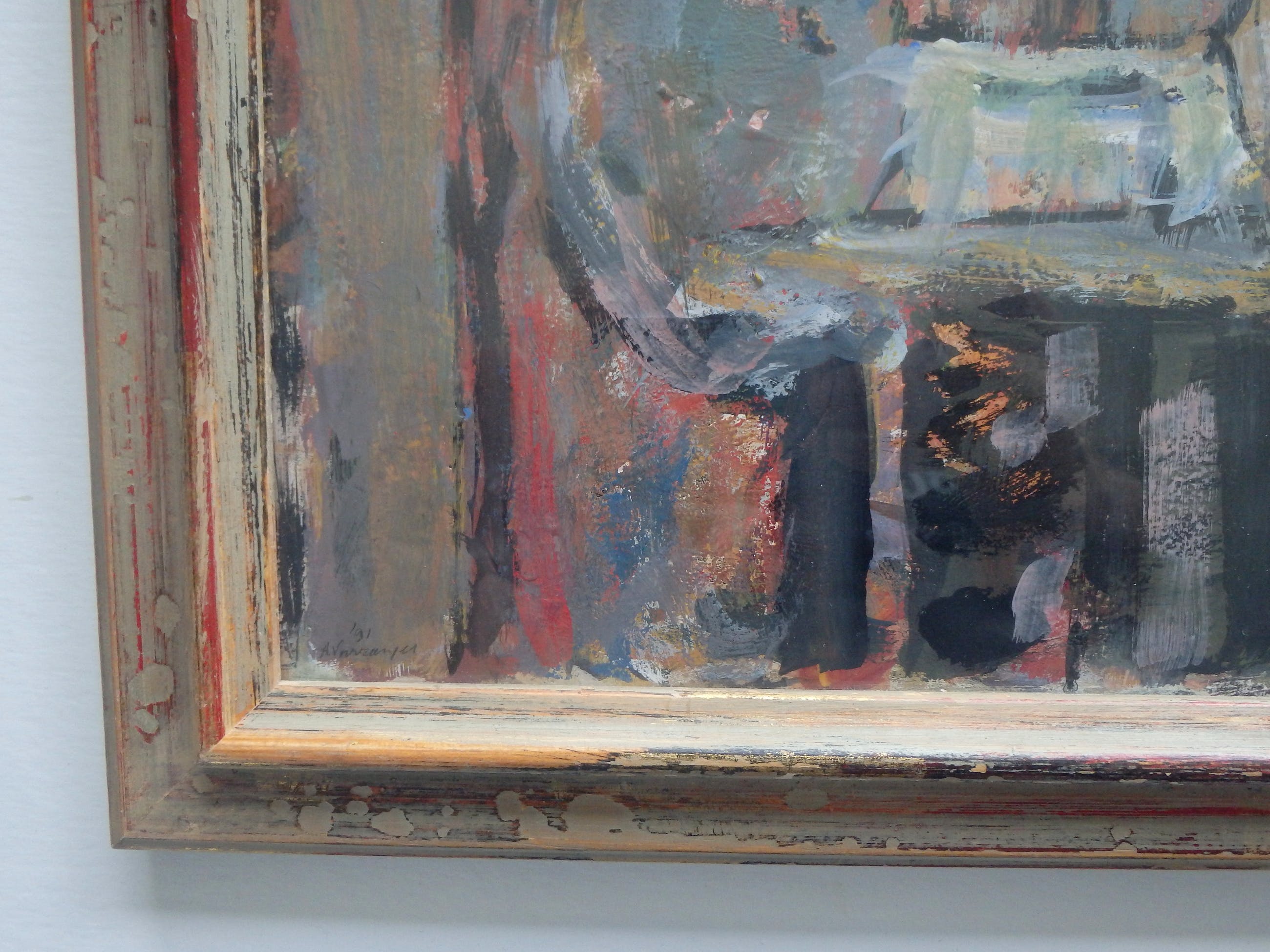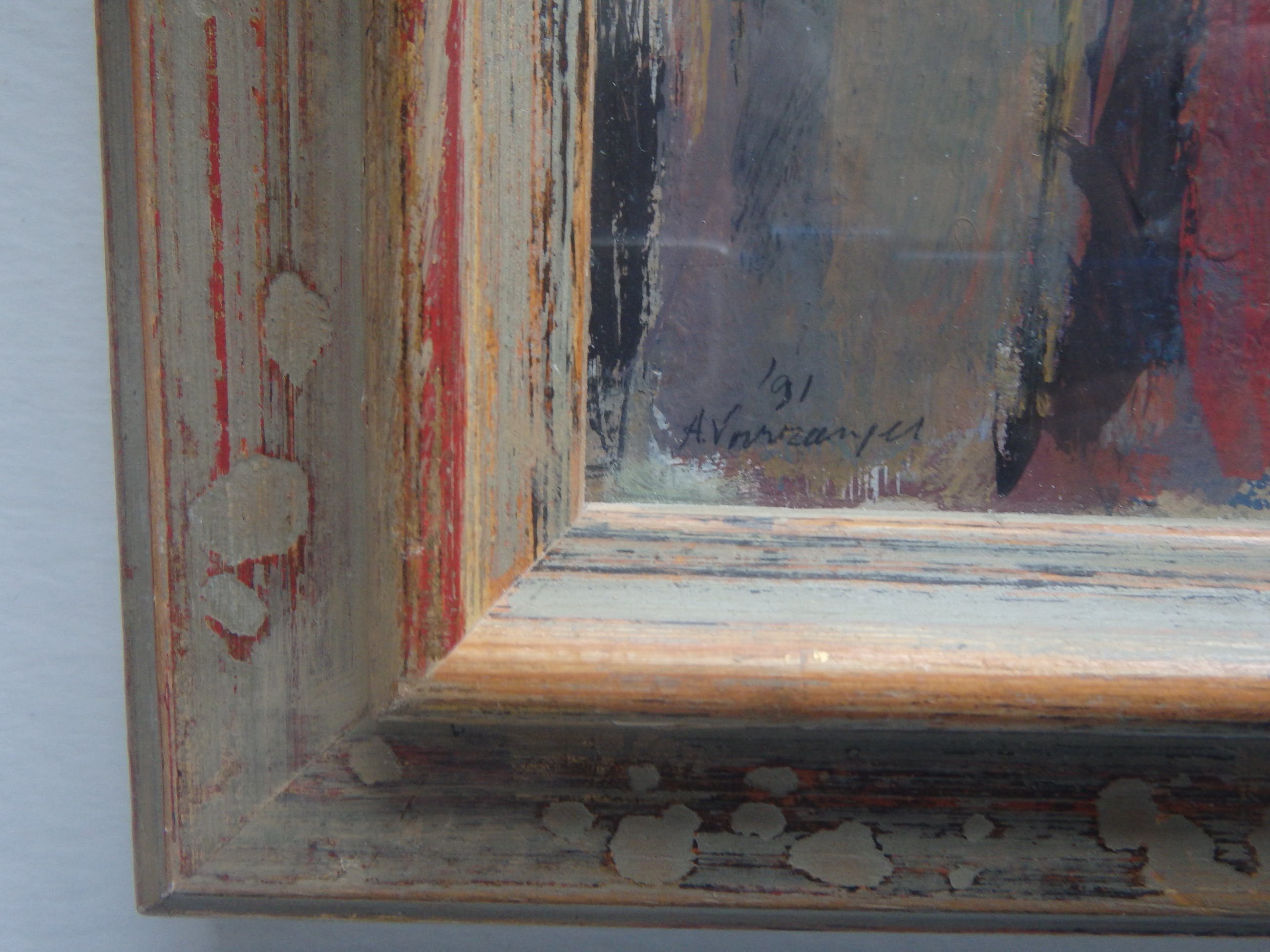 Acryl / olieverf vermoedelijk op board 43x36 cm. linksonder gesigneerd A. Voorzanger en gedateerd '91, mooi ingelijst en achter glas.