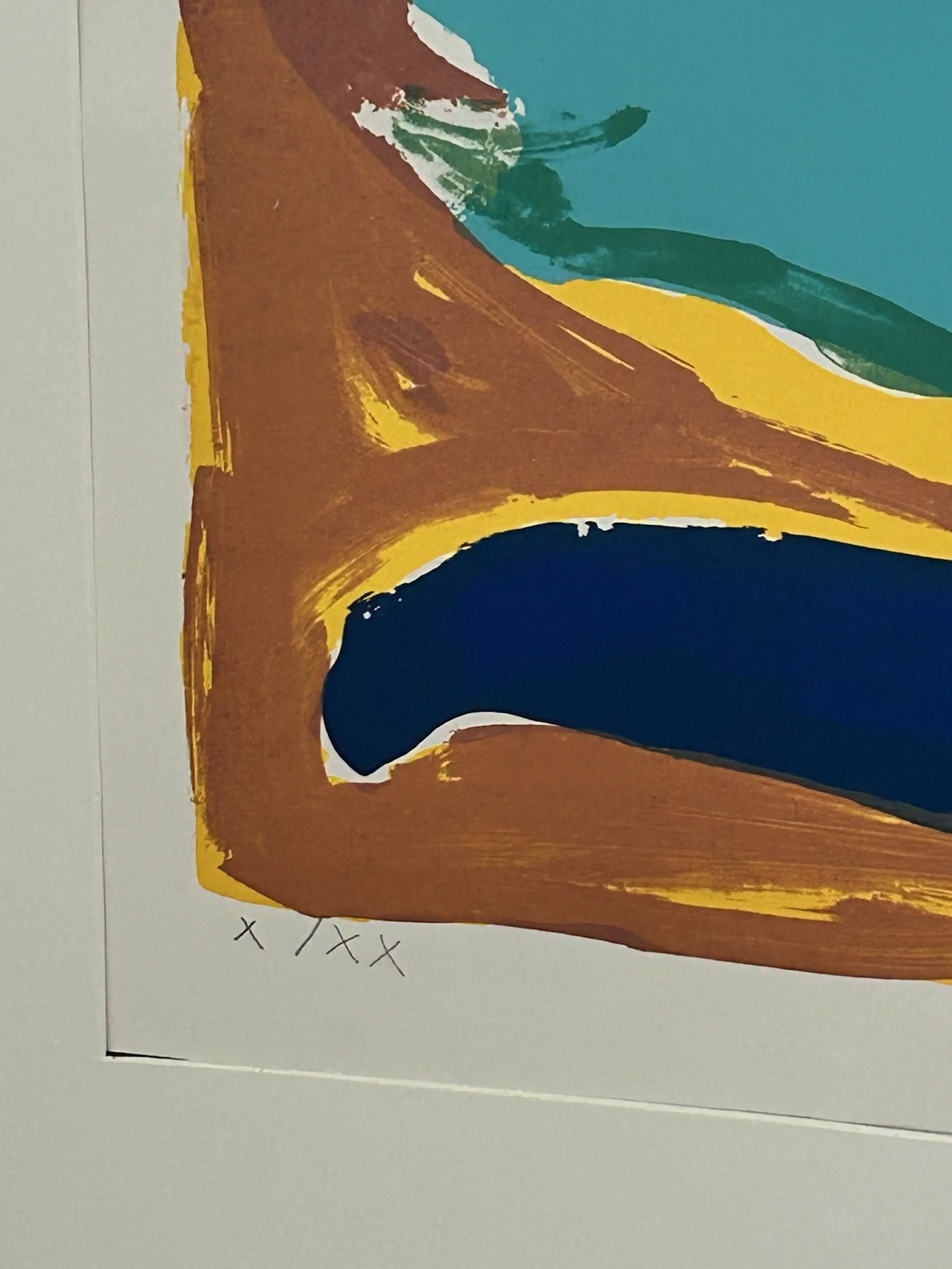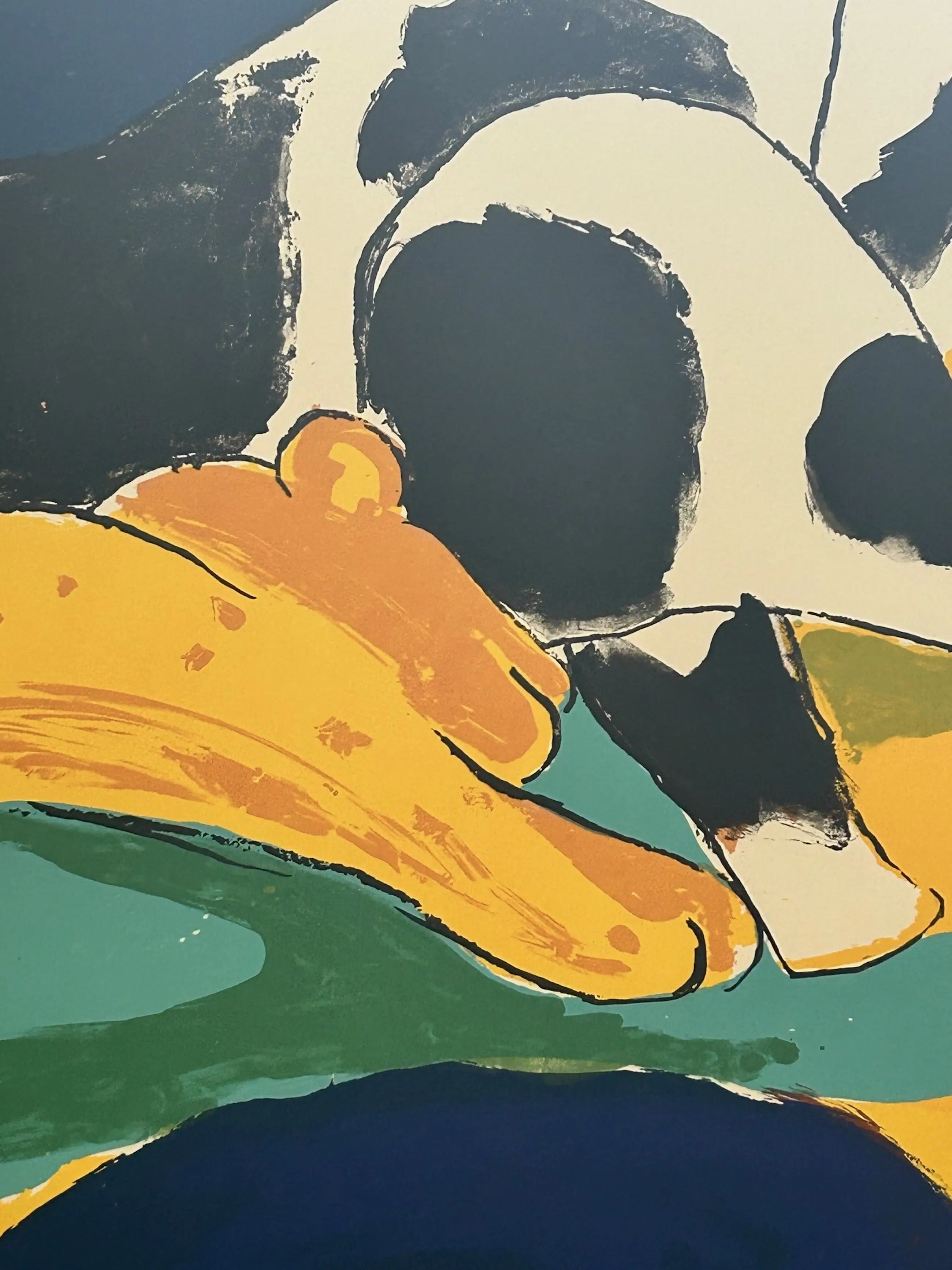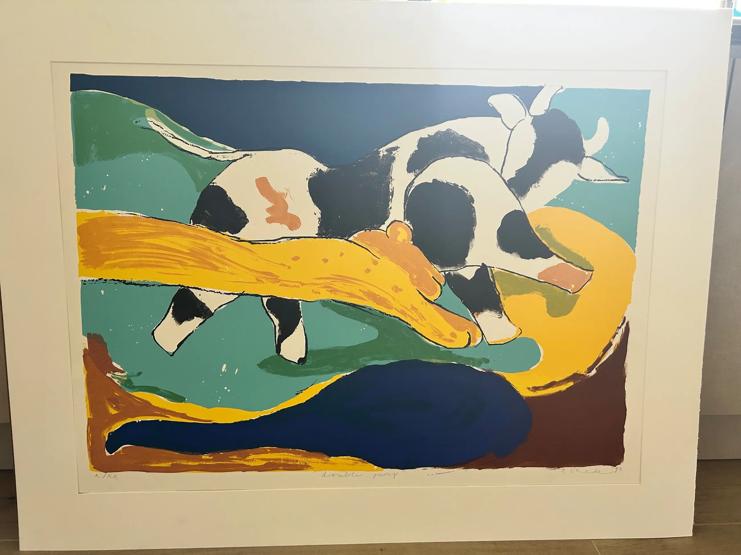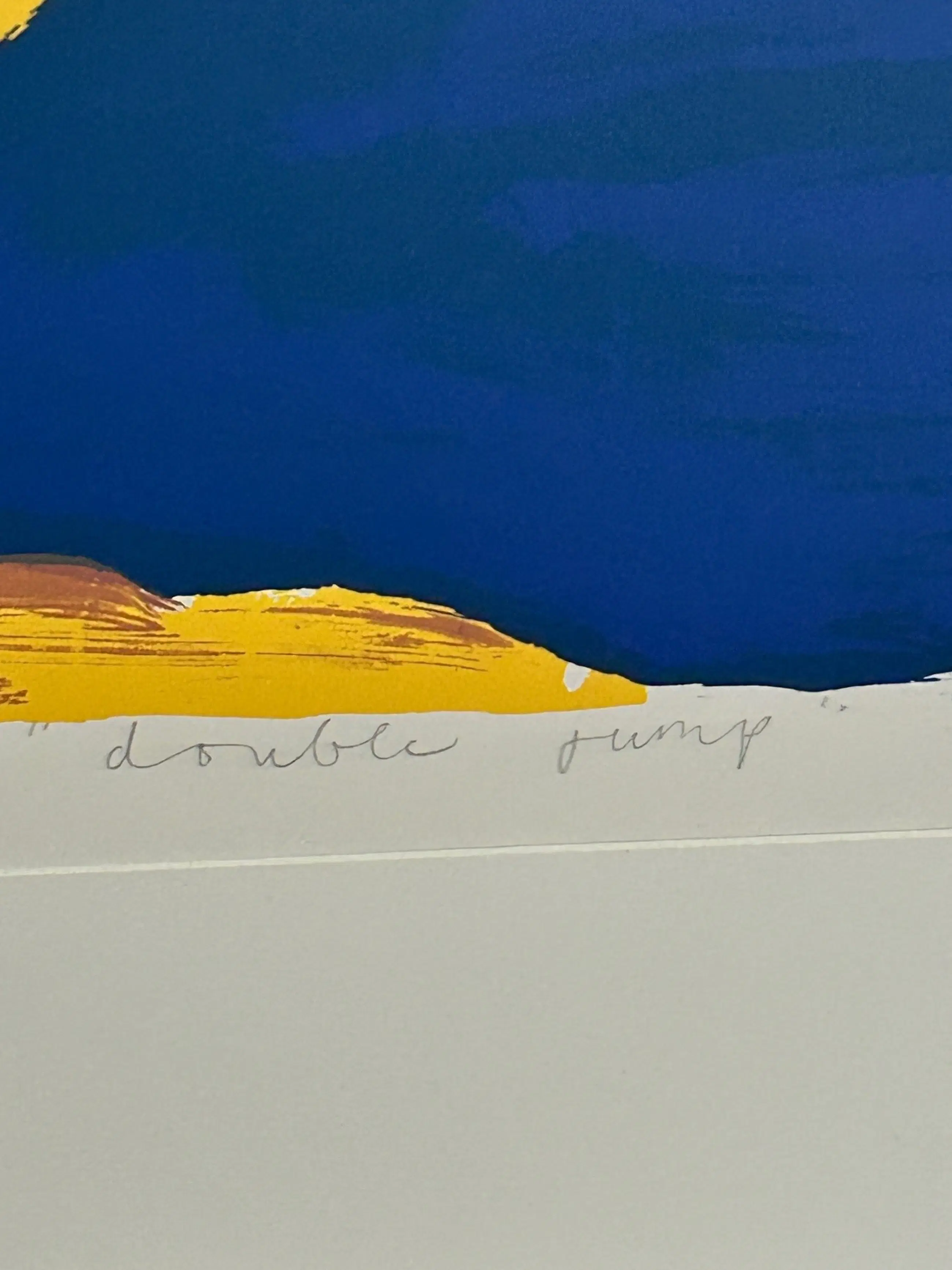 Vrolijke en kleurrijke en grote litho. Deze litho is verlijmd op een onderbrak en voorzien van een bijbehorende passe partout van 100 x 130 cm. Bijbehorende lijst en achterwand (hardboard) zijn ook aanwezig alleen geen glasplaat meer. Met l.o. X/XX met potlood, in het midden double jump met potlood en r.o. A. Vrede '93 met potlood.