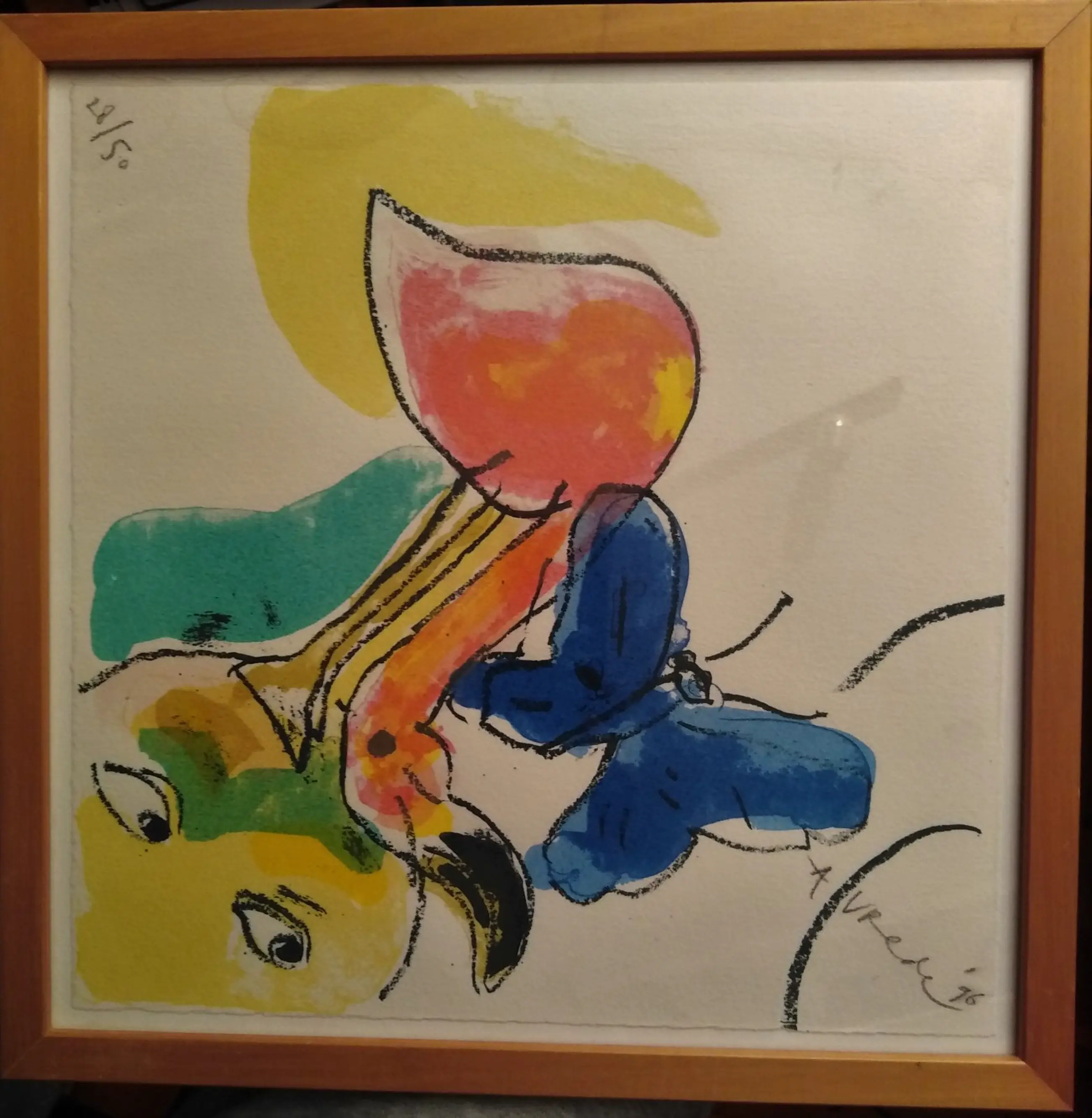 In deze zeefdruk vertrouwt hij met vlotte penseelstreken een naïeve sprookjeswereld toe aan het papier. Dierfiguren spelen hierbij de hoofdrol waarbij ieder dier zijn eigen betekenis heeft.