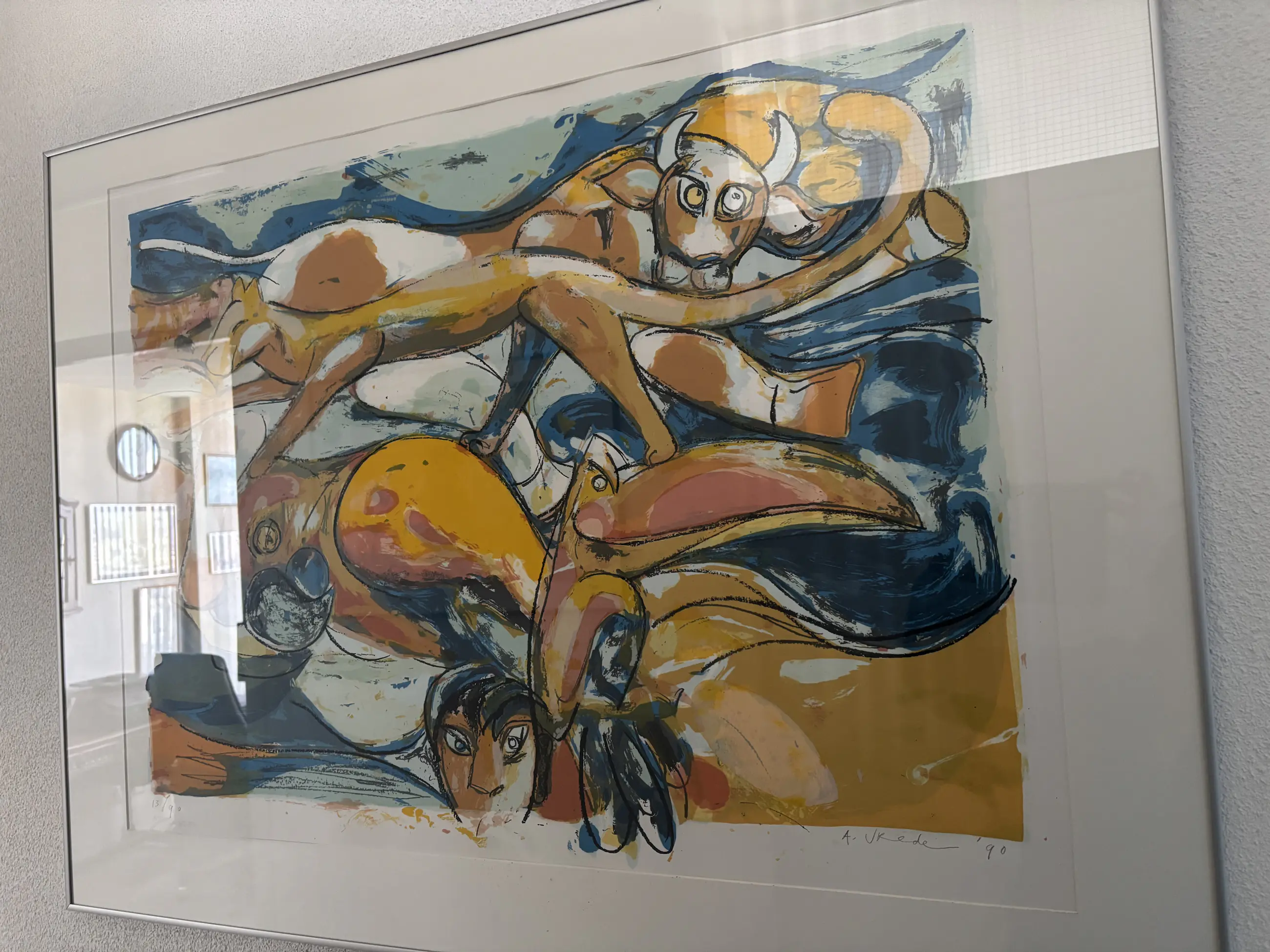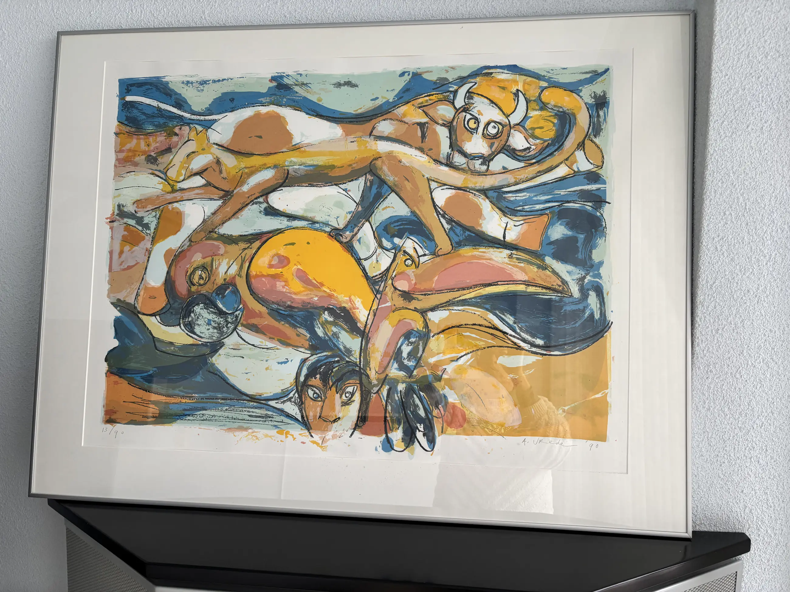 Prachtige en expressieve grafische prent van de bekende kunstenaar Anton Vrede. Het werk toont levendige, kleurrijke dierfiguren in een dynamische compositie — typerend voor Vrede’s unieke stijl waarin humor, beweging en fantasie samengaan. Details van het werk: Kunstenaar: Anton Vrede Techniek: Grafische prent (waarschijnlijk litho of zeefdruk) Jaar: 1990 Oplage: Genummerd 13/90 Gesigneerd: Ja, handtekening van de kunstenaar rechtsonder Conditie: Goede staat, zorgvuldig ingelijst (zie foto’s)