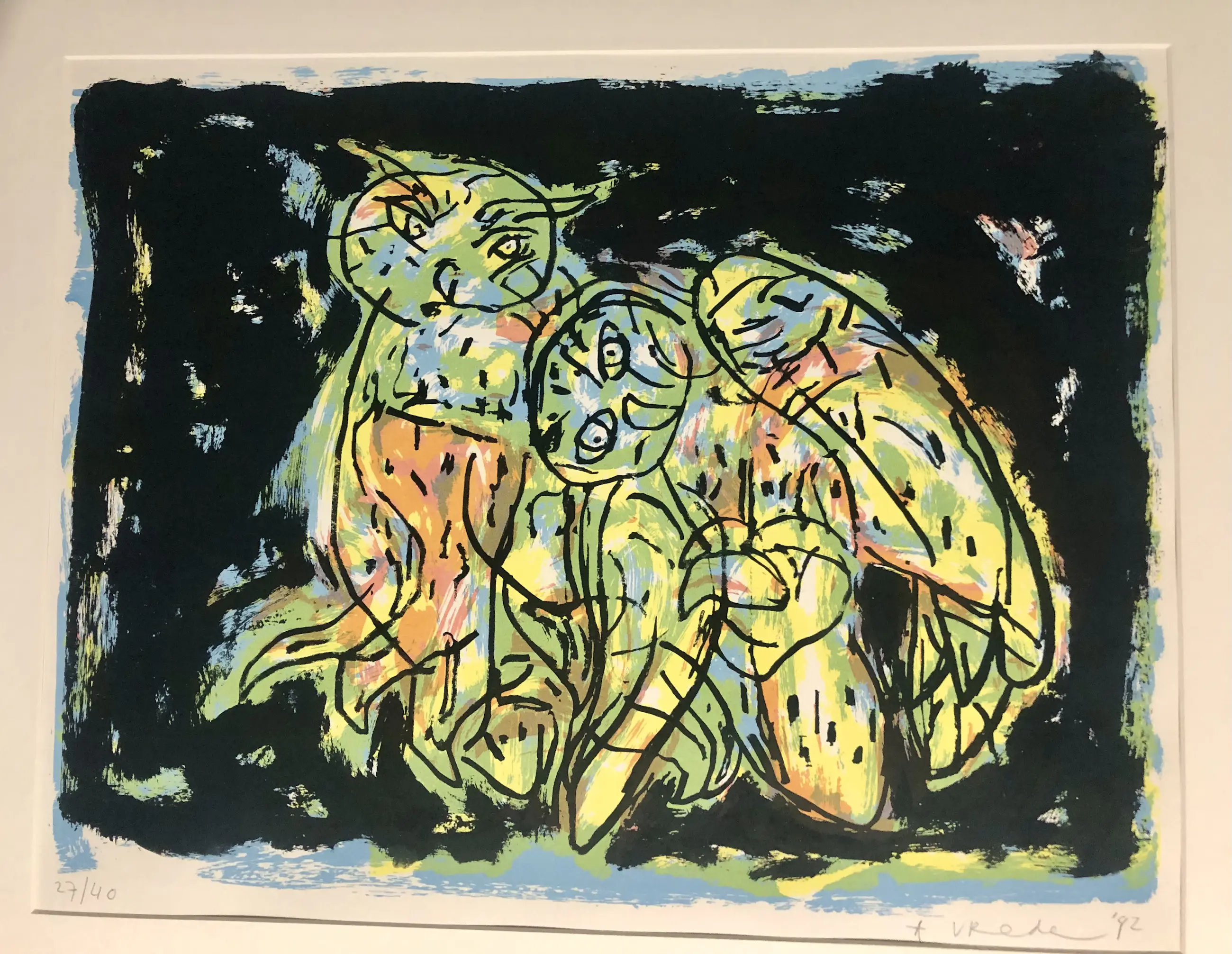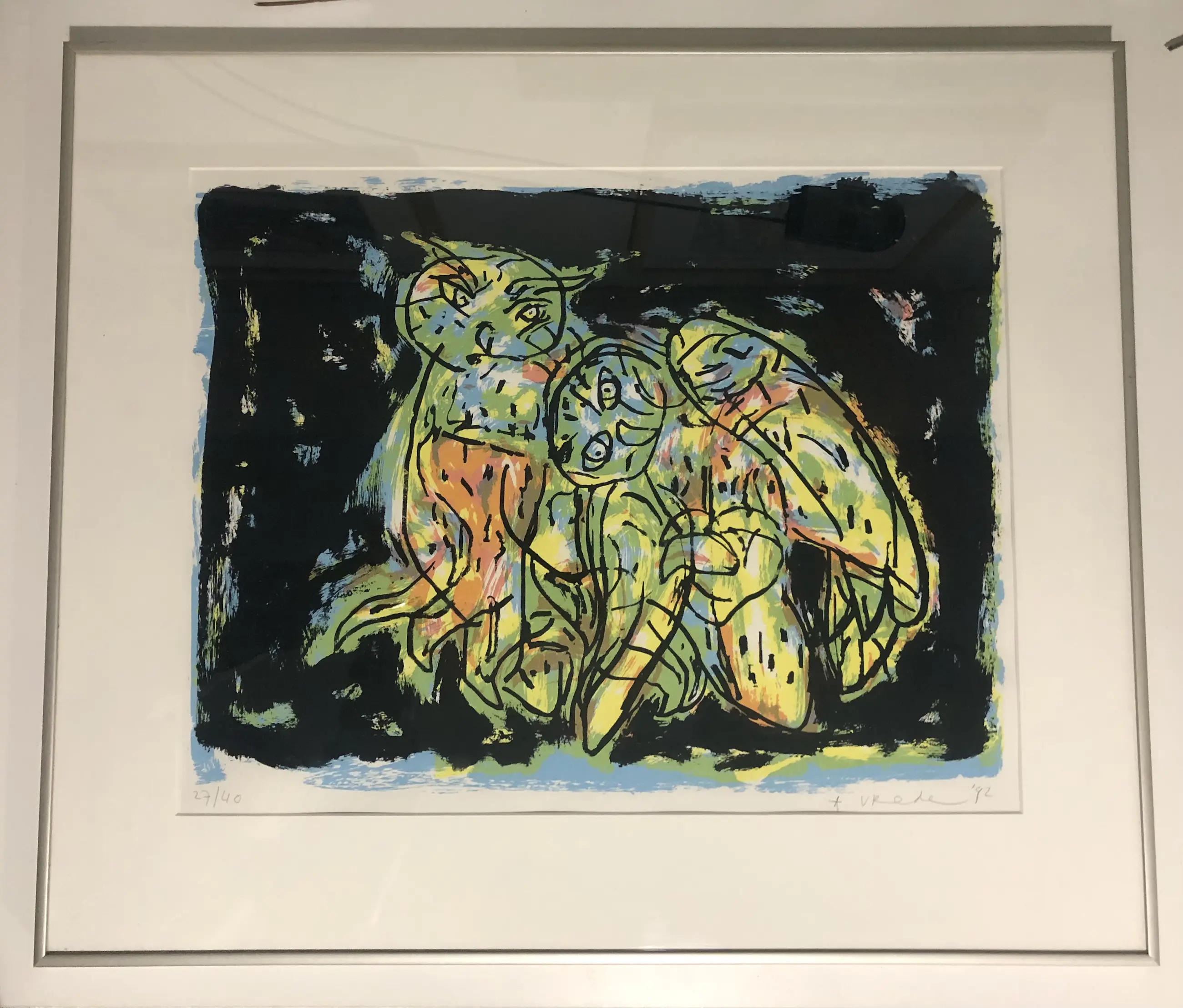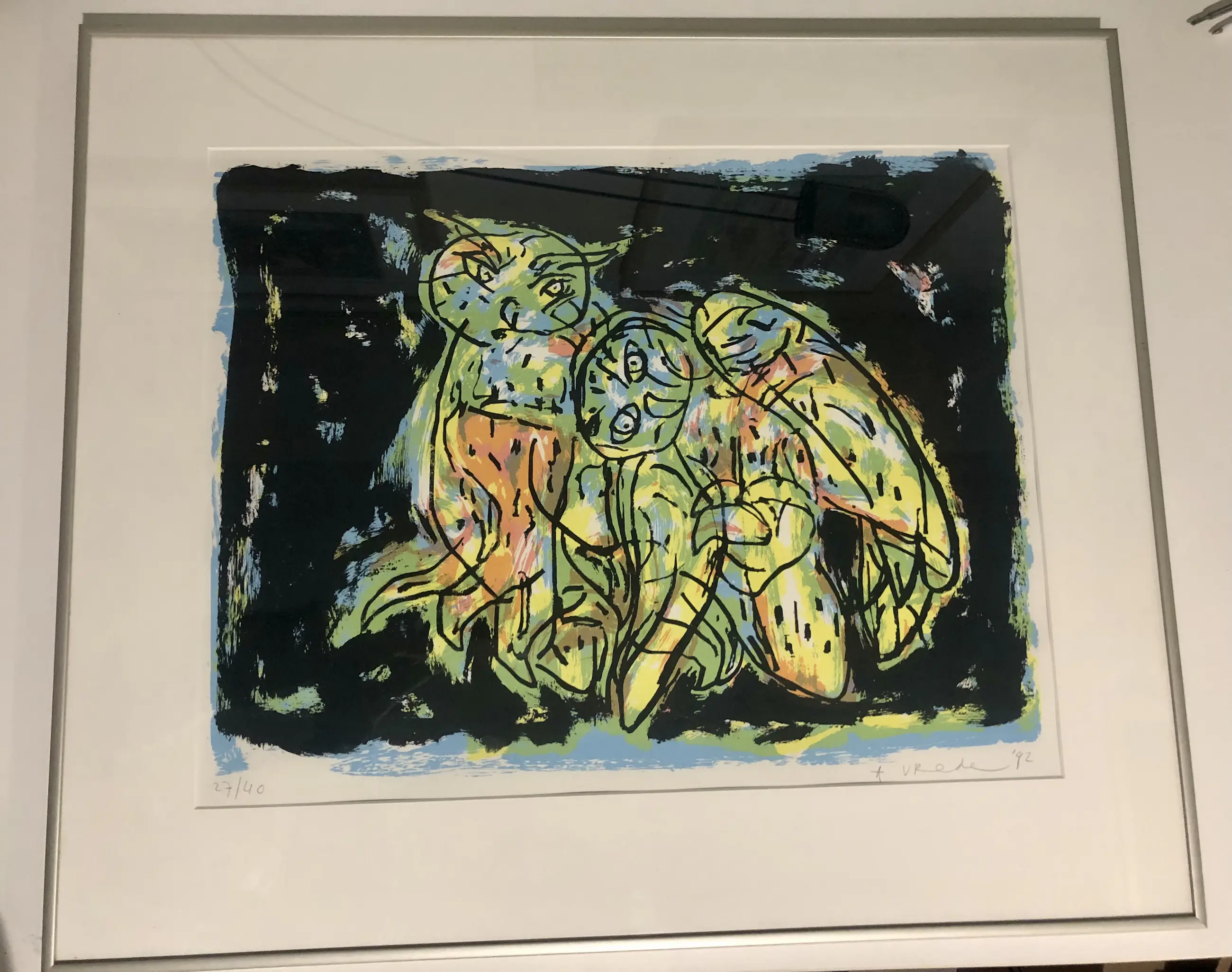 Krachtig en kleurig expressief werk van Anton Vrede gevat in een nette lijst en passe-partout.
