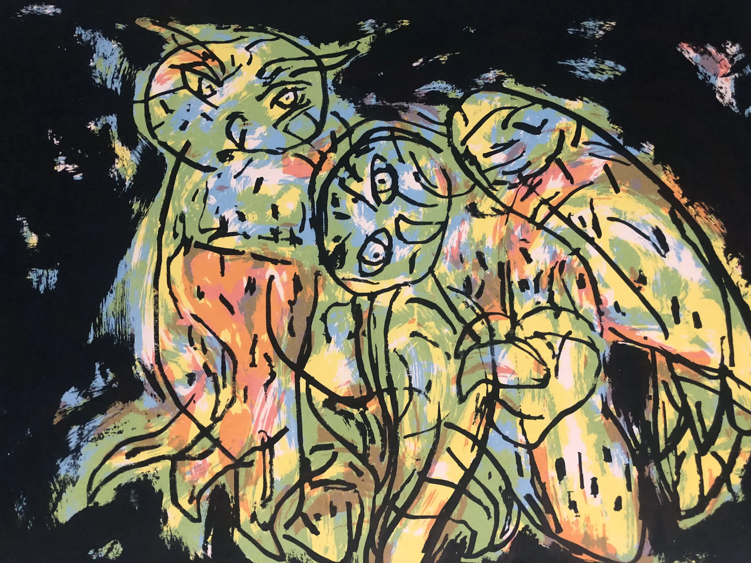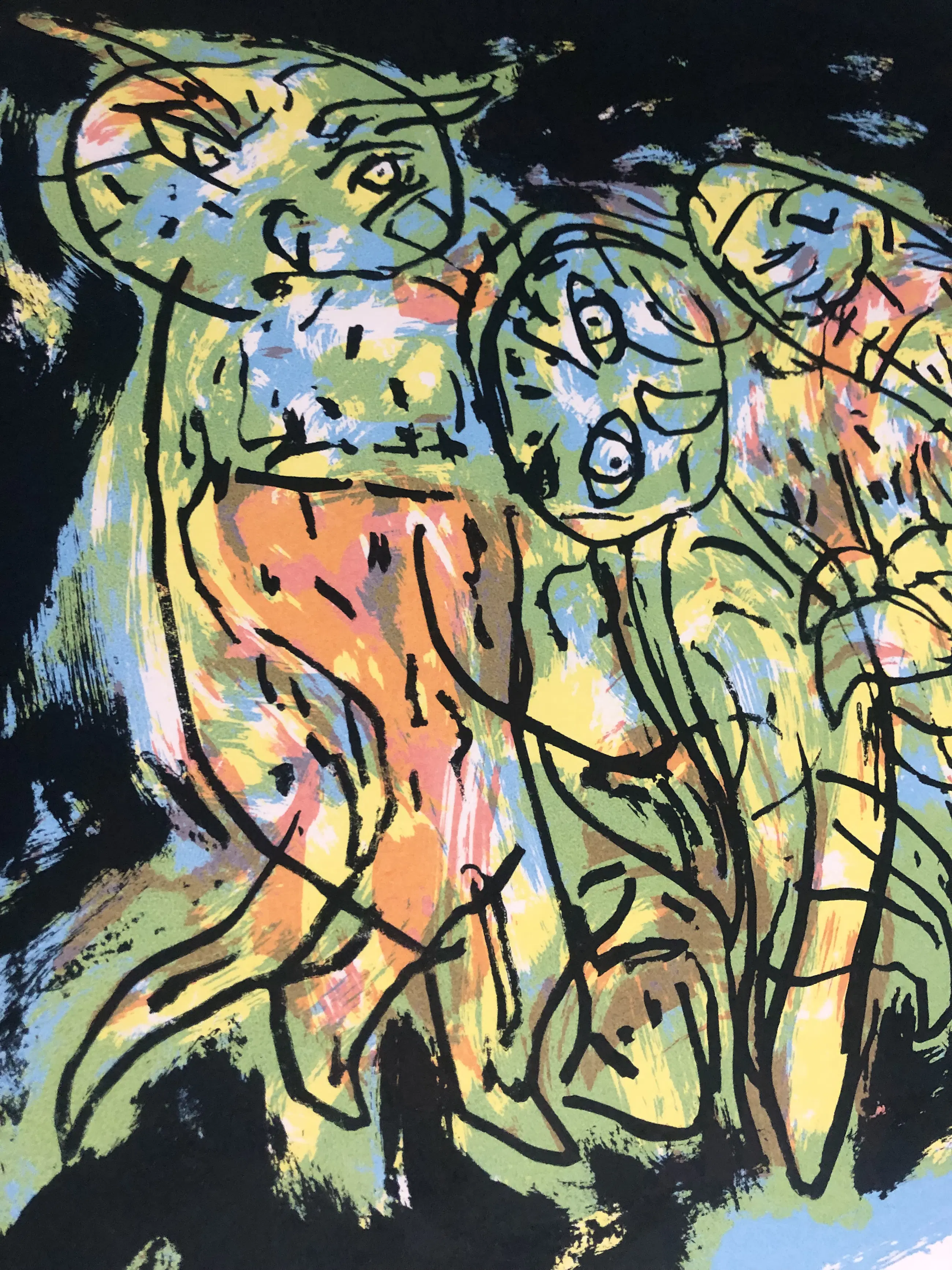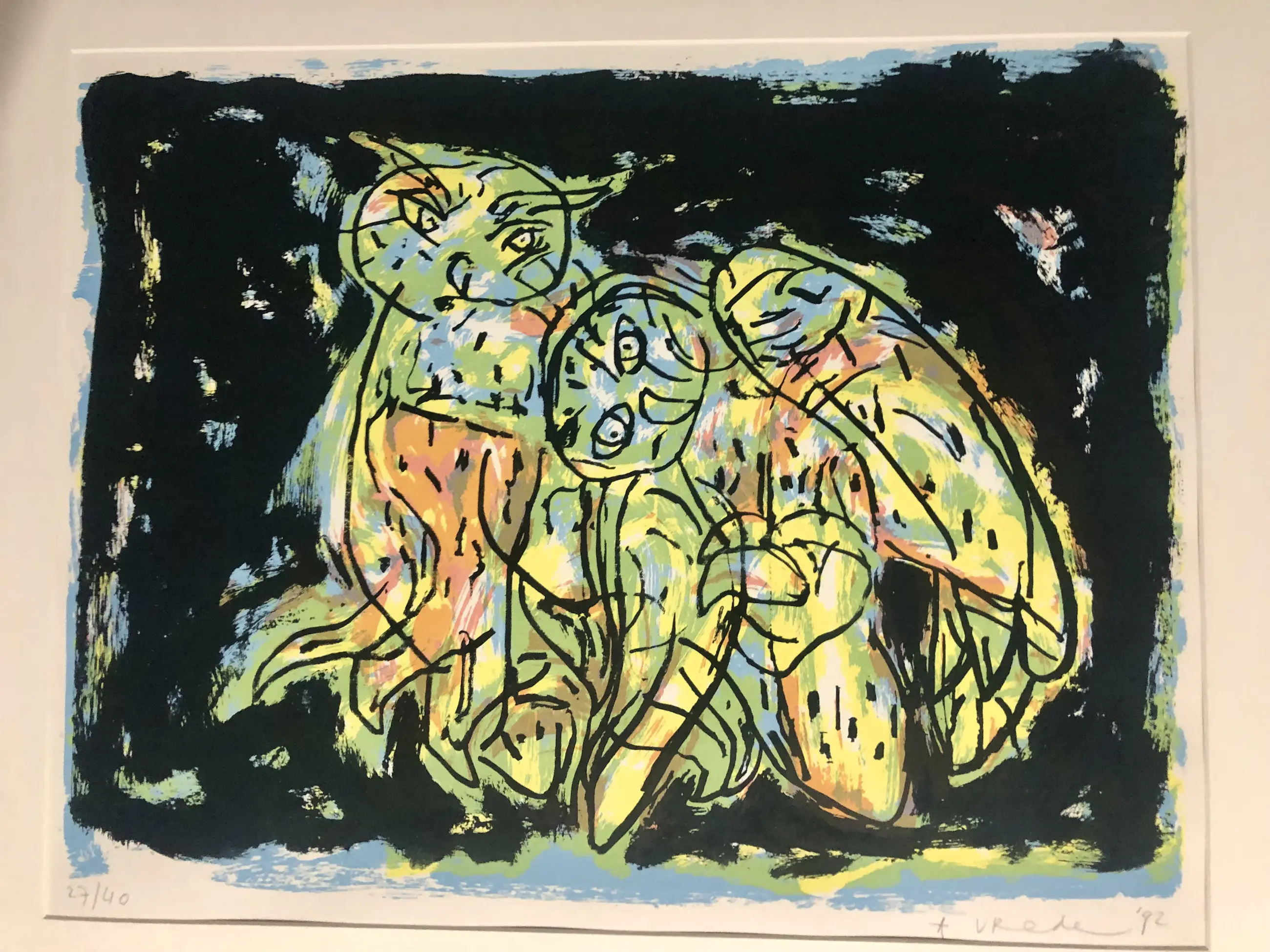 Krachtig en kleurig expressief werk van Anton Vrede gevat in een nette lijst en passe-partout.