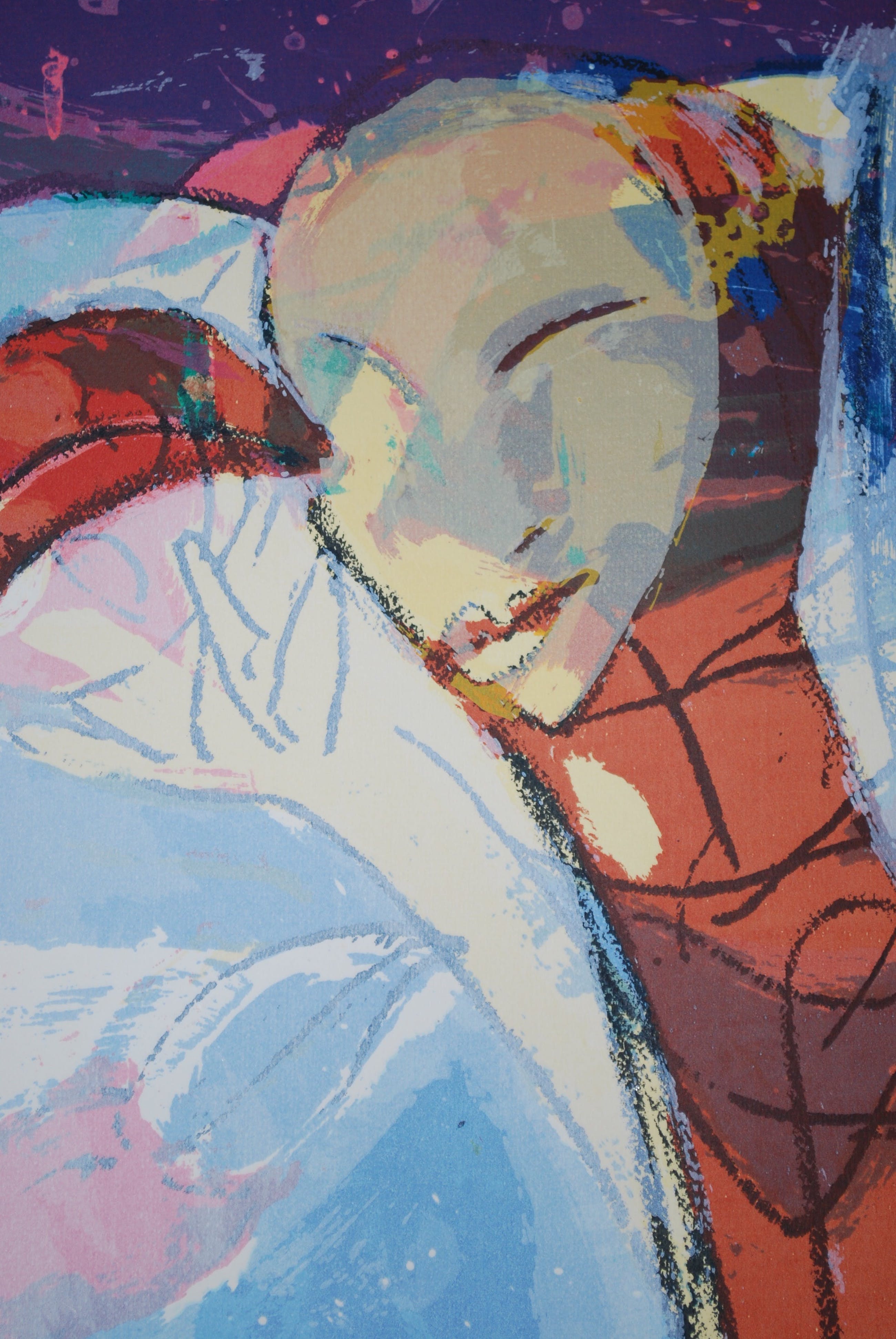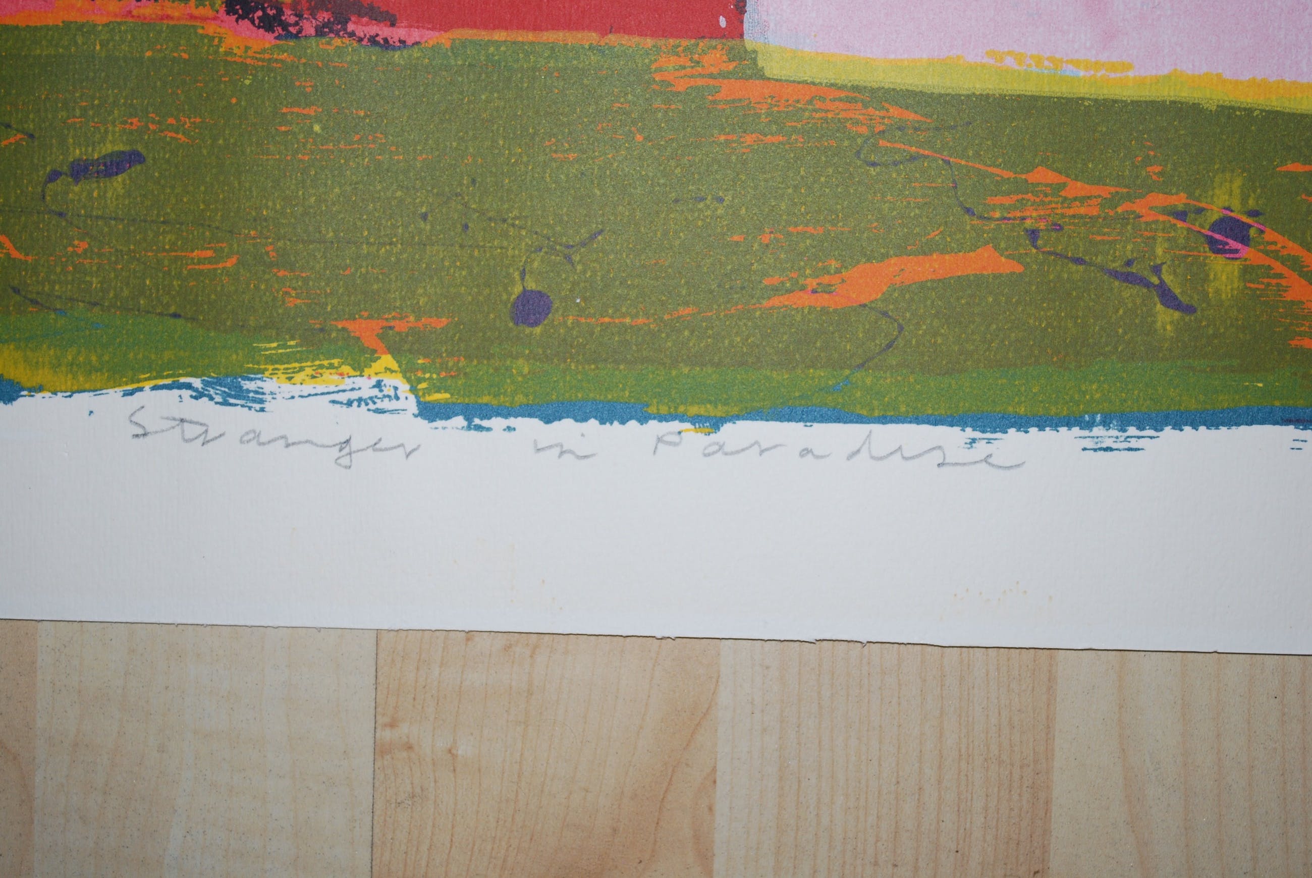 Ter rechterzijde een paar minuscule (enkele mm) krasjes/sneetjes van voormalig gebarsten glas. Ingelijst zal dat niet te zien zijn. Verder in goede staat.