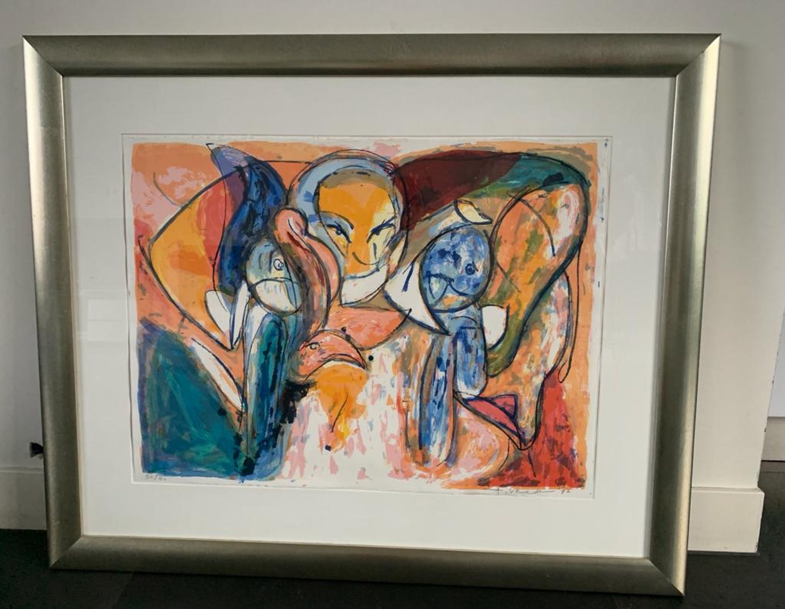 Zeefdruk in een houten, zilverkleurige lijst. In zeer goede staat.
