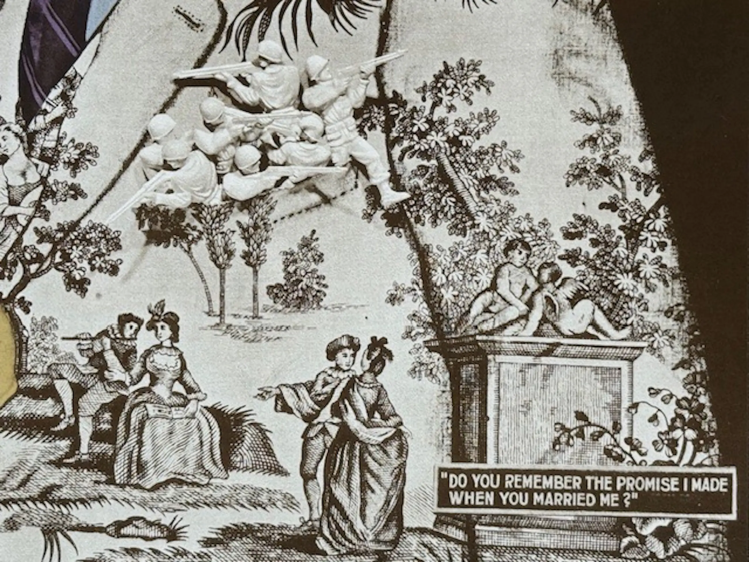 "Jouyce the general wife" van Antoni Miralda is een werk met gemengde media dat de voor de kunstenaar karakteristieke barokke, kitsch- en feestelijke stijl volgt, waarin felle kleuren en populaire objecten samenkomen om sociale rituelen ter discussie te stellen.