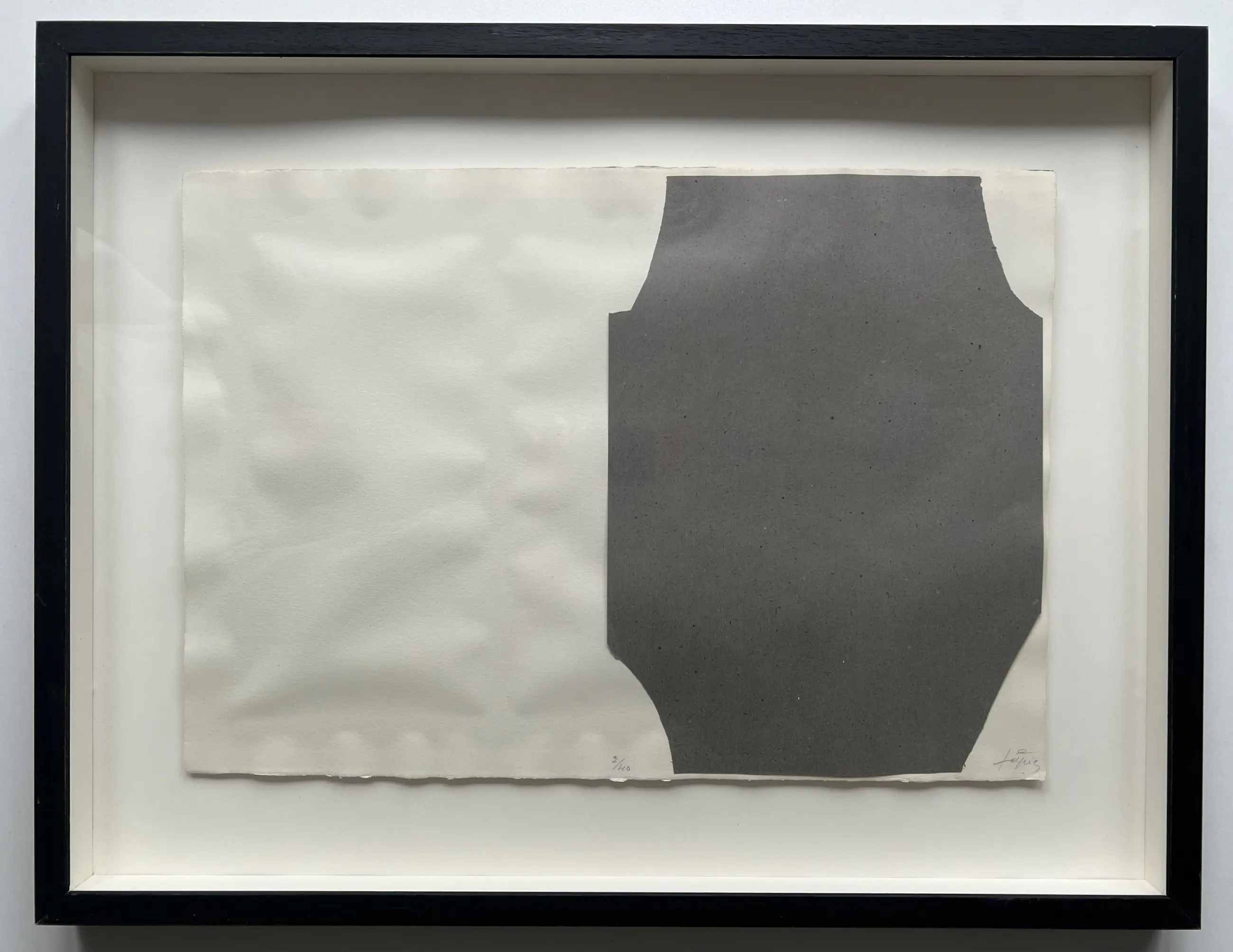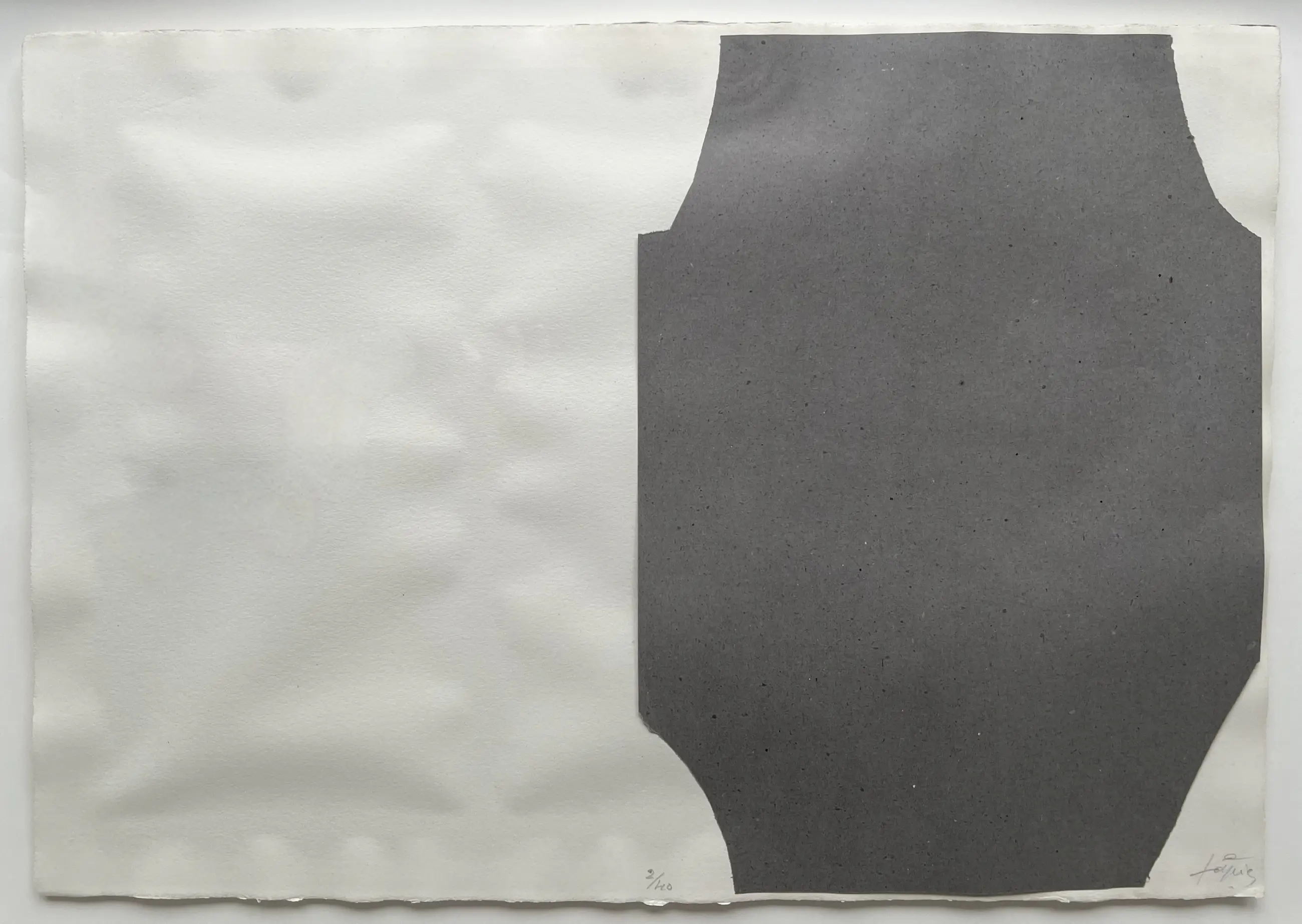Interessante compositie, waarbij het gehele blad onderdeel is daarvan. Rechtsonder gesigneerd met potlood door de kunstenaar. Middenonder genummerd met oplagenummer 2/40. Rechtsonder zit ook de signatuur van Tapies als watermerk in het papier.
