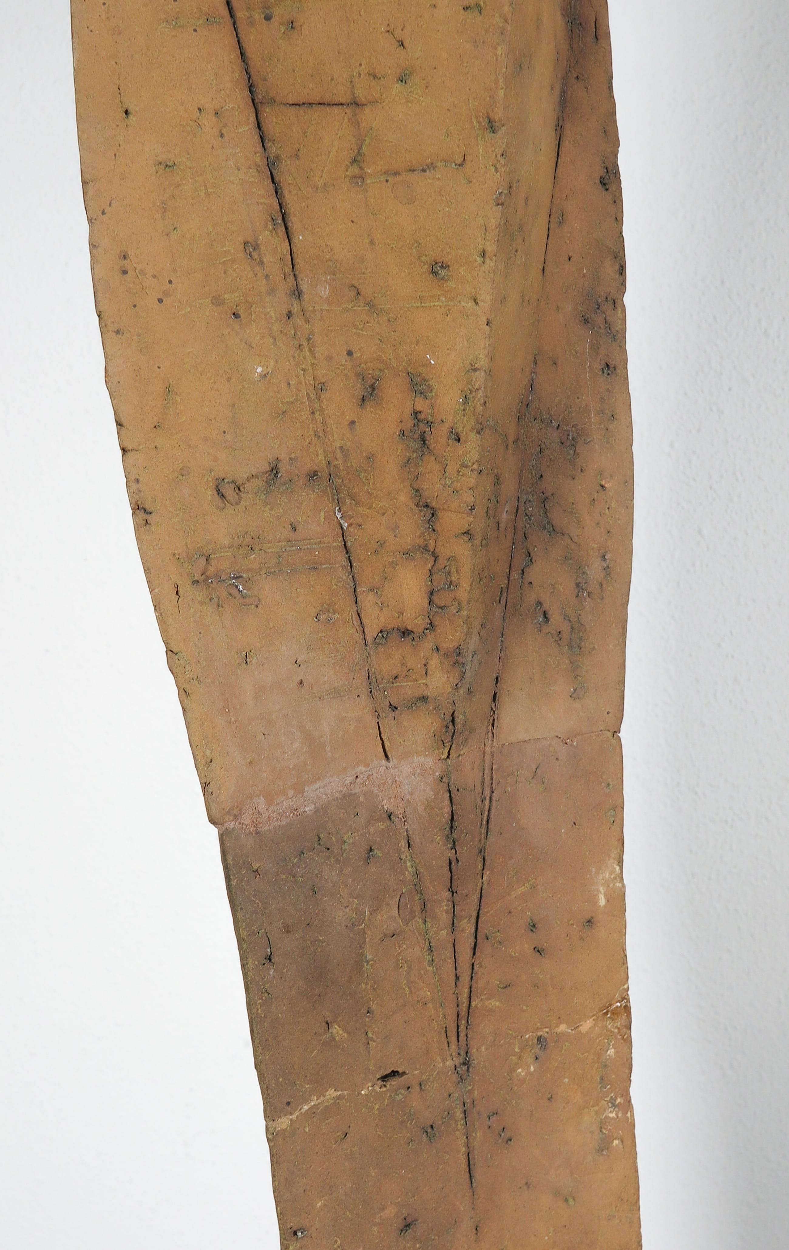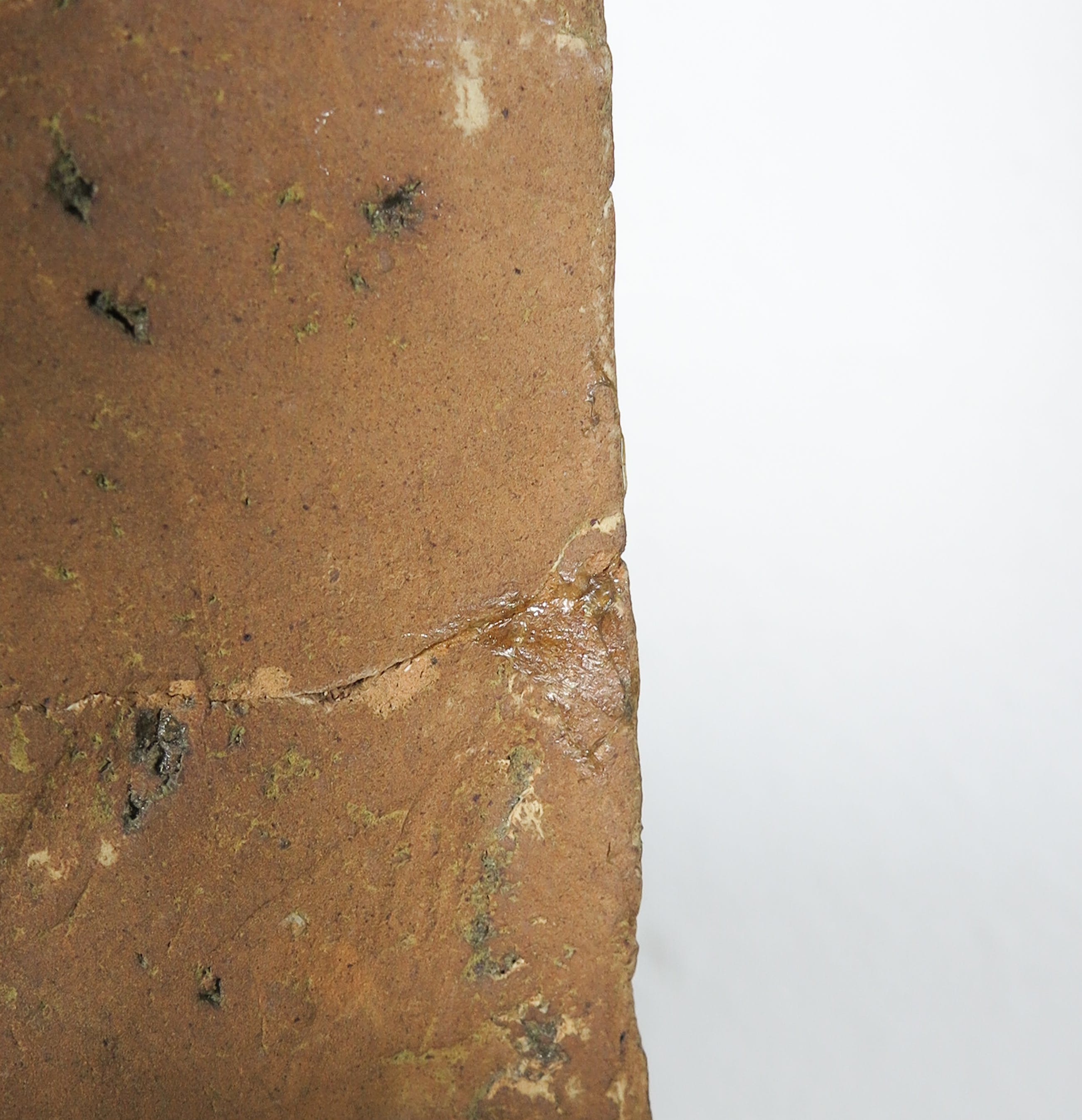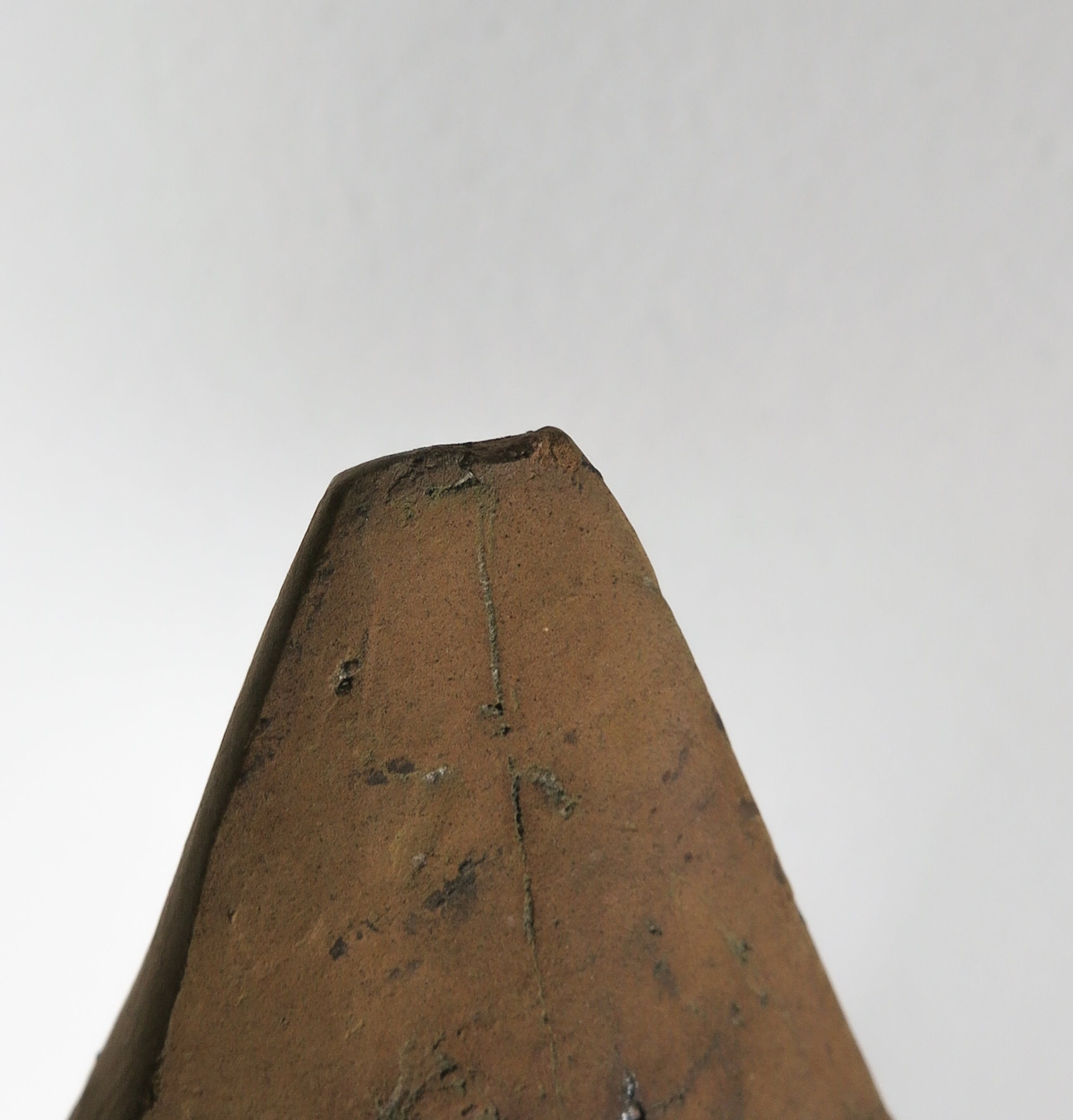 | Goede staat, maar het lijkt alsof hij mogelijk gebroken is geweest (?). Bij verschillende naden is lijm waarneembaar. Tevens een scherfje van de punt/top. | |