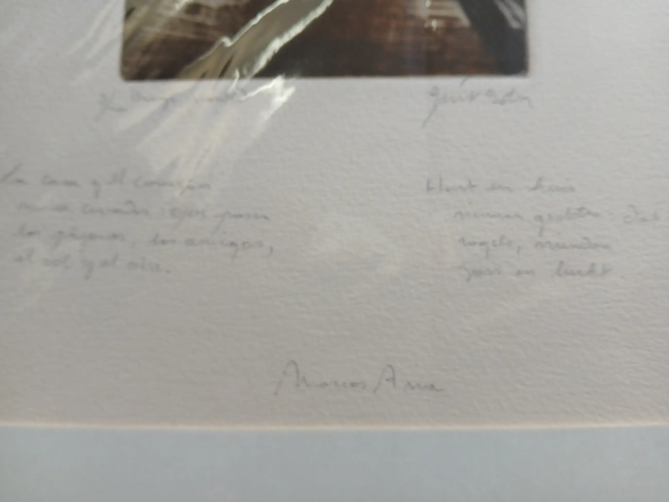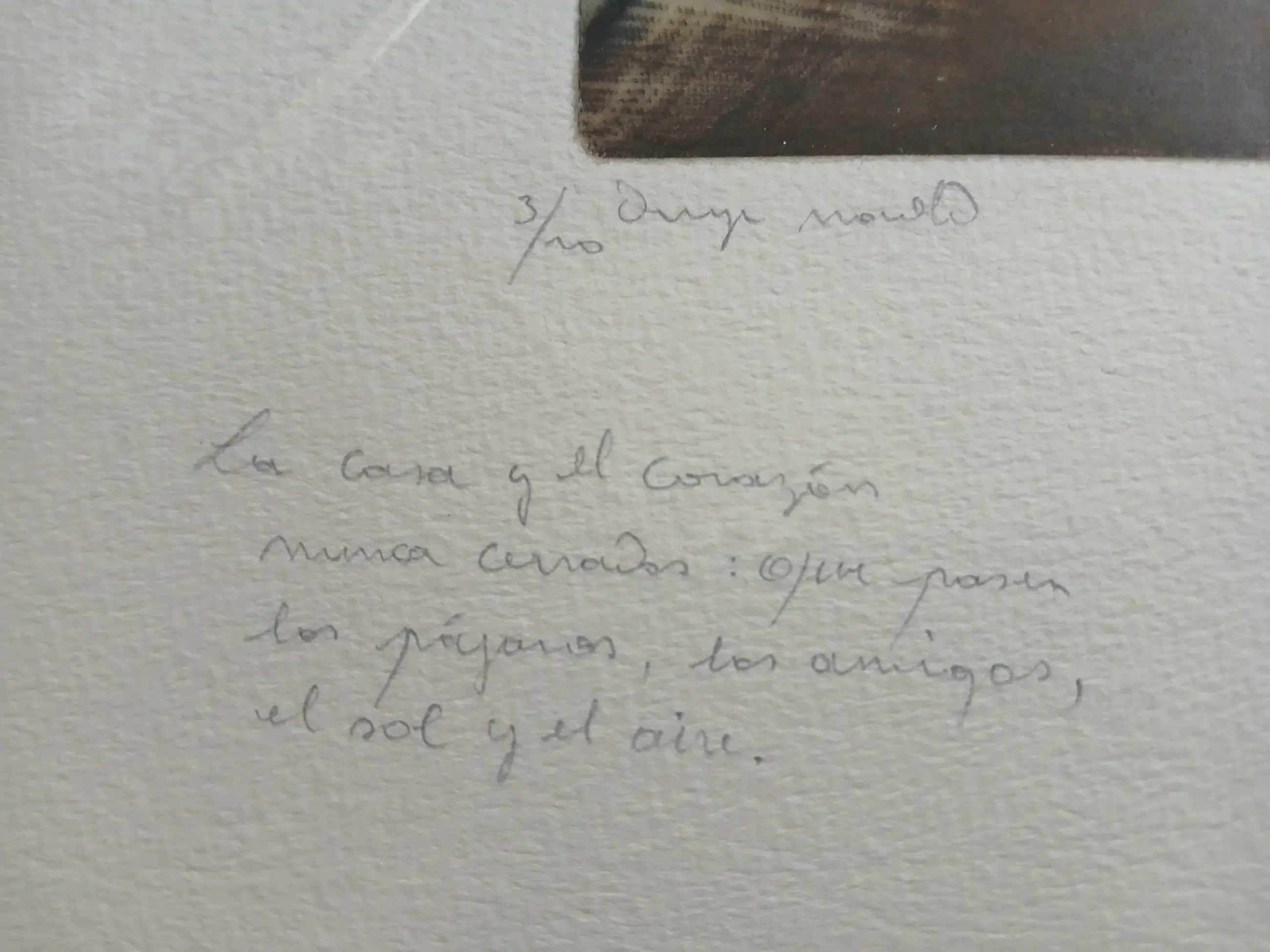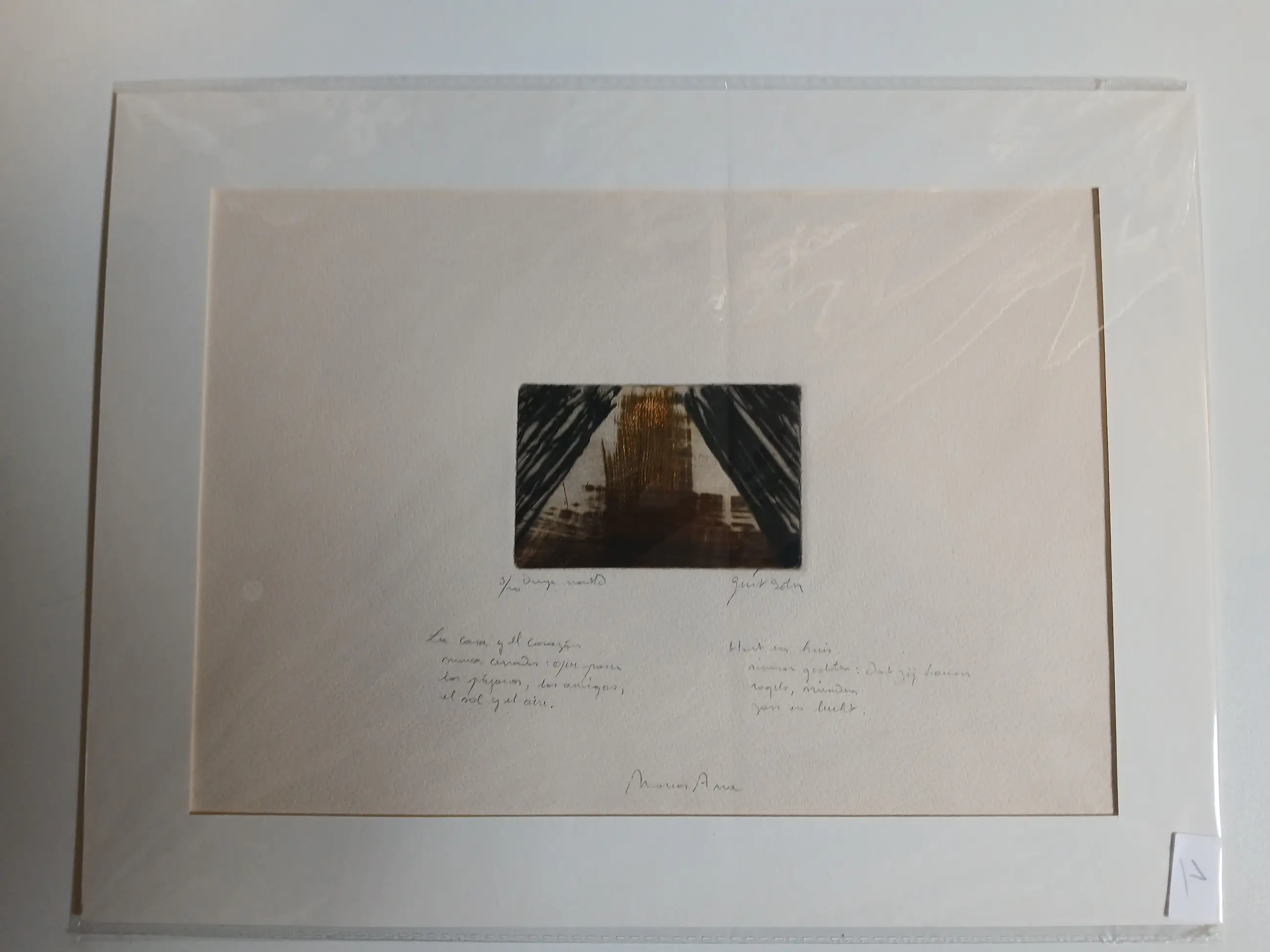 Papier: Dik handgeschept kunstdrukpapier met zichtbaar watermerk (van hoge kwaliteit) Kenmerken: Kleurets in aard en goudtinten met zwarte diagonalen. Linksonder: 3/10 Rechtsonder: Hand gesigneerd Guirado Onder het beeld handgeschreven tweetalige tekst links Nederlands : Hout en huis nimmer gesloten. Dat zij komen vogels , monden ,gras en lucht. rechts Spaans fragment van de dichter MARCOS ANA5"LA CASA Y TIEMPO" ,bekend uit zijn bundel Poemas desde la carcel. Intieme grafiek waarin guirado de poezie van Marcos Ana visueel vertaalt : een symbolische opening naar vrijheid en licht , gevangen in een strakke geometrische compositie.