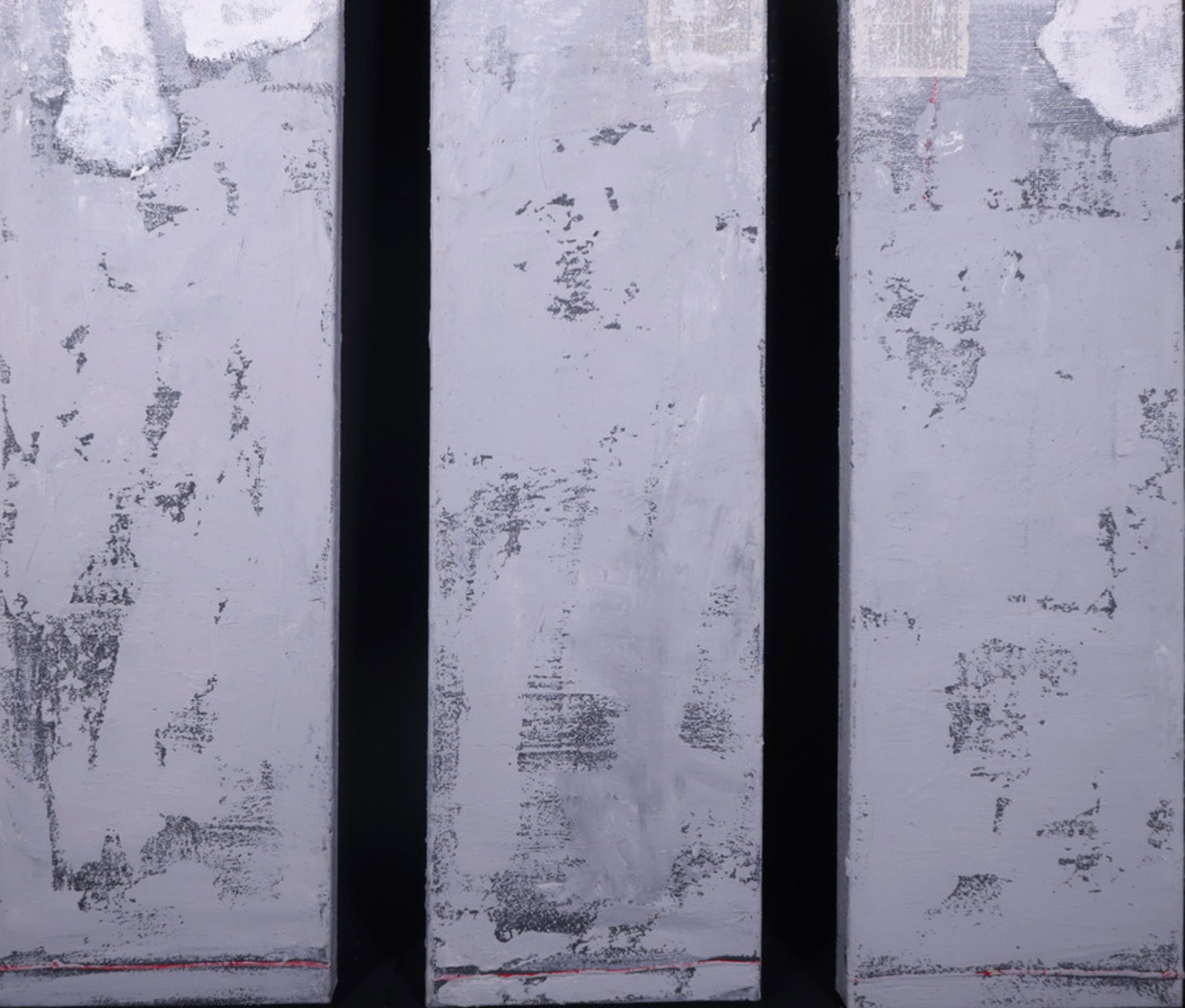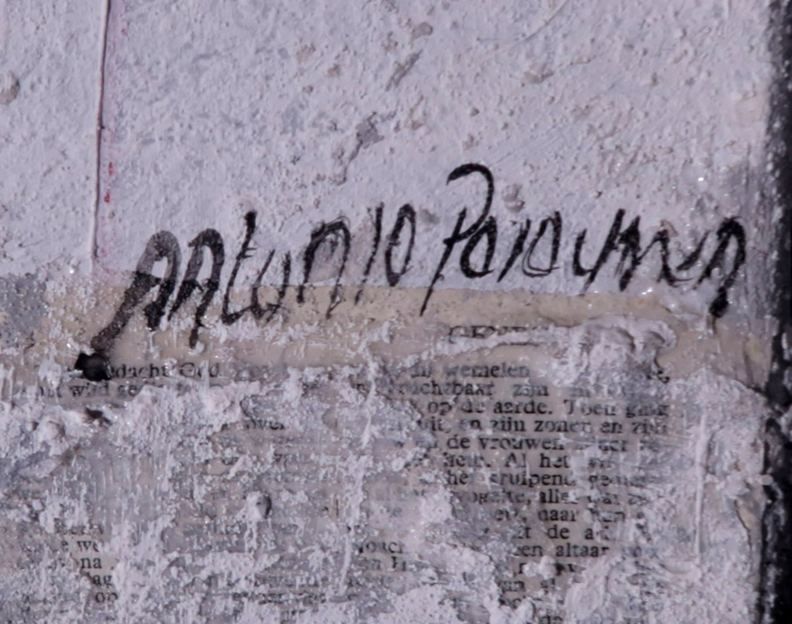 Materiaal: Acryl verf, aangebracht reliëf doormiddel van zand structuur en collage op doek