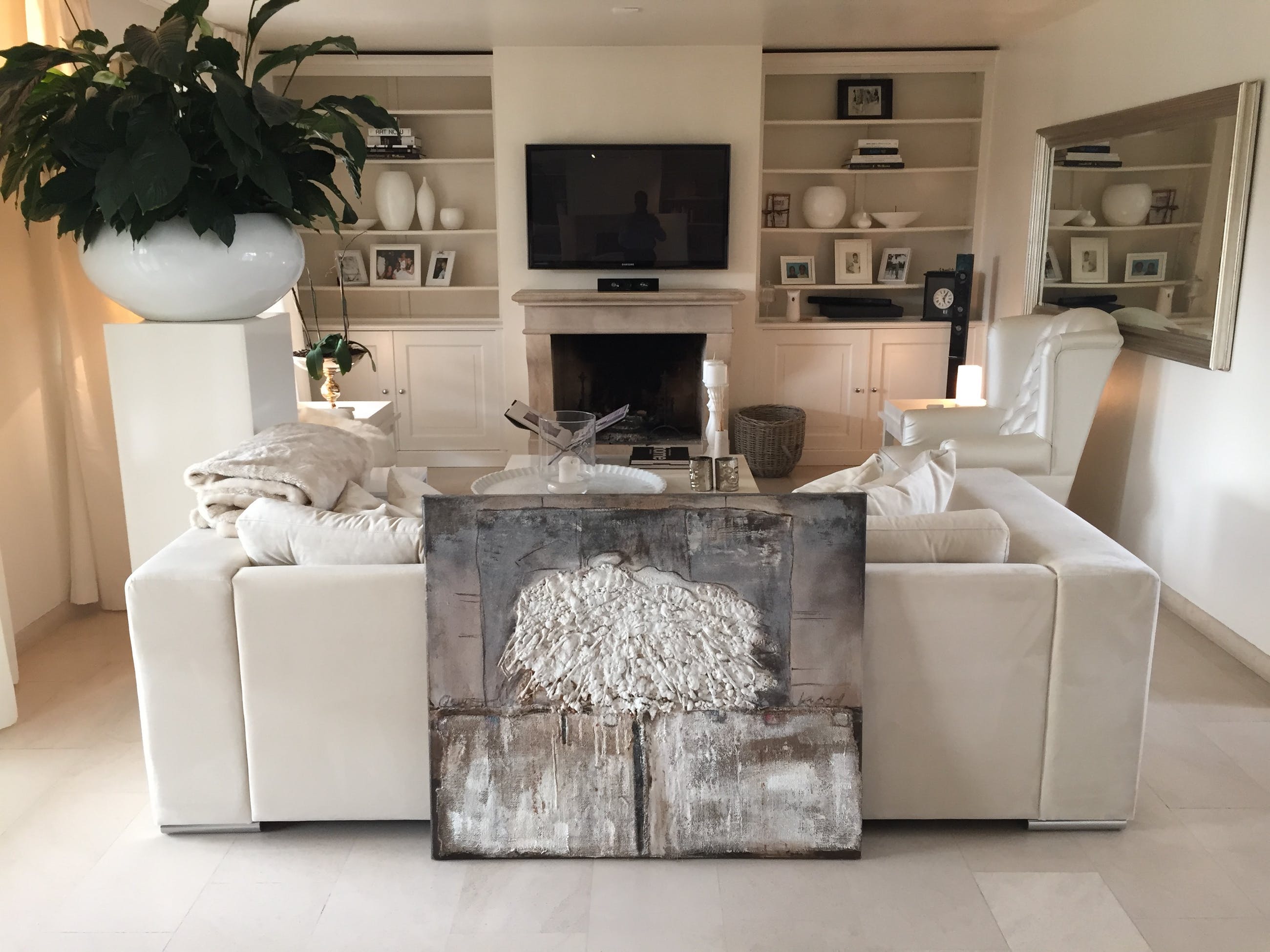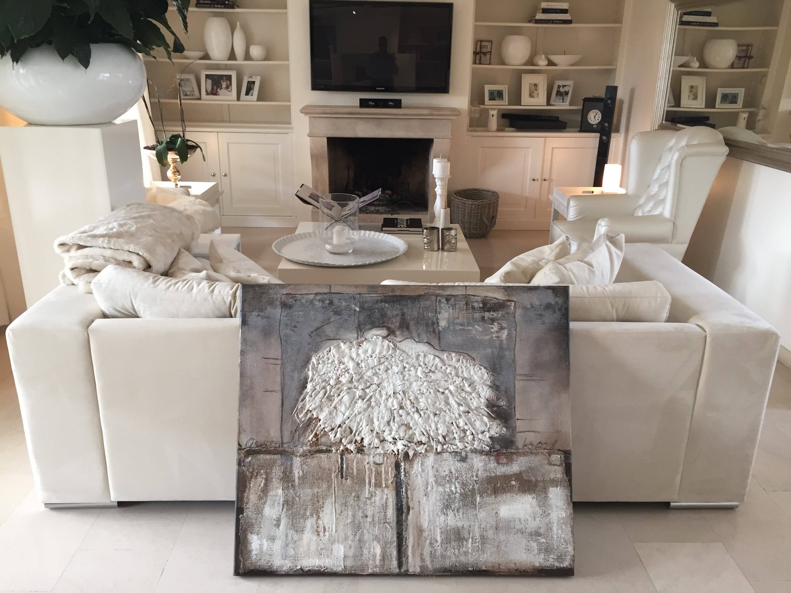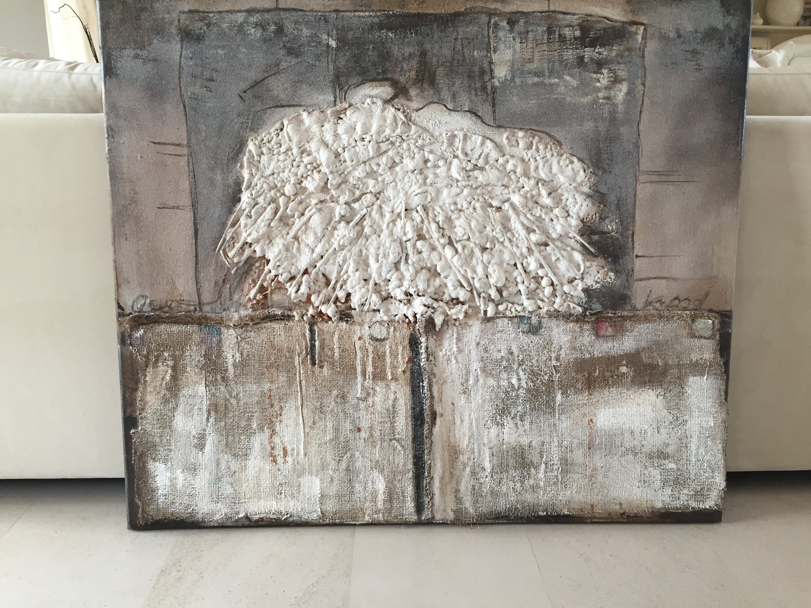 Schilderij is gemaakt van mixed media (olieverf, jute, schuim, etc.).