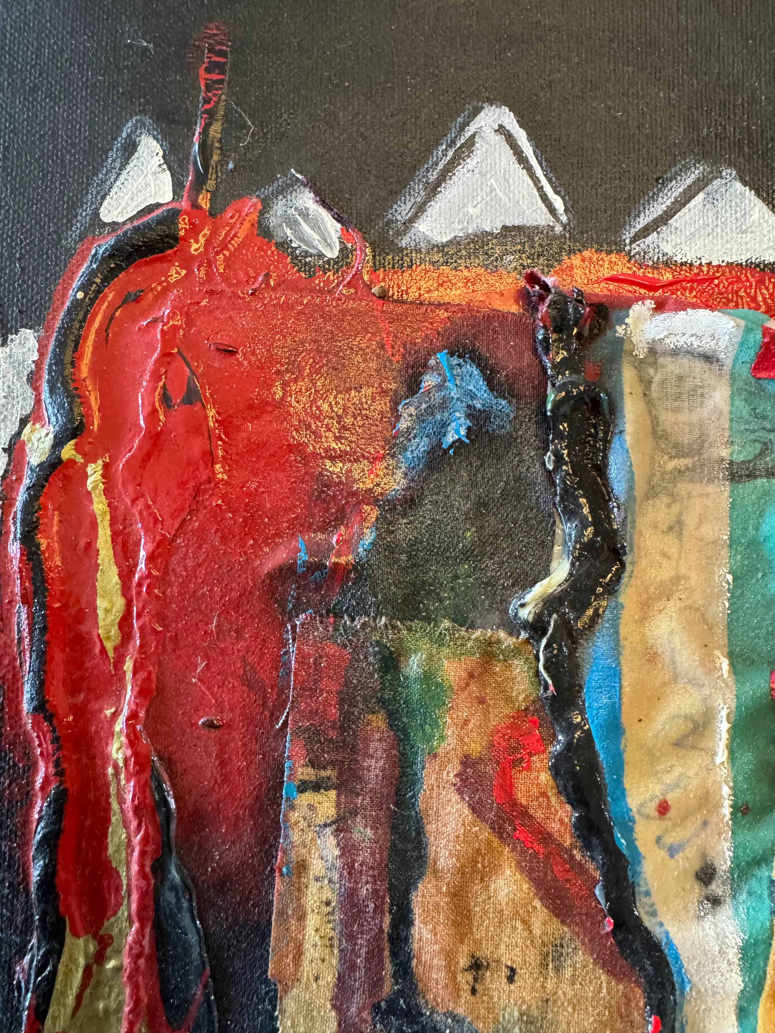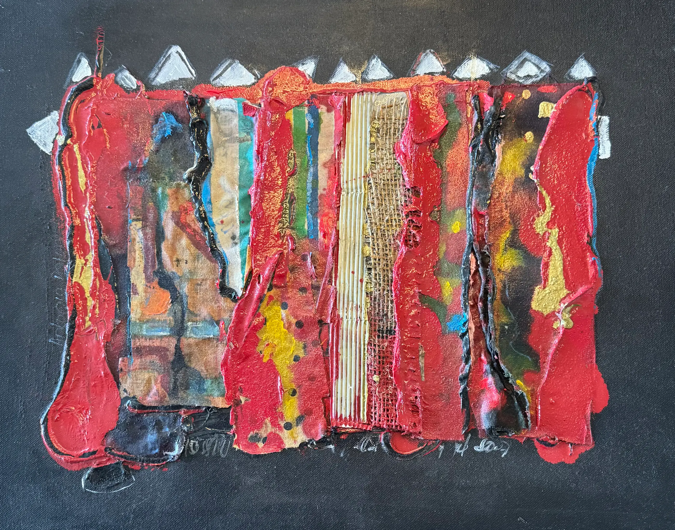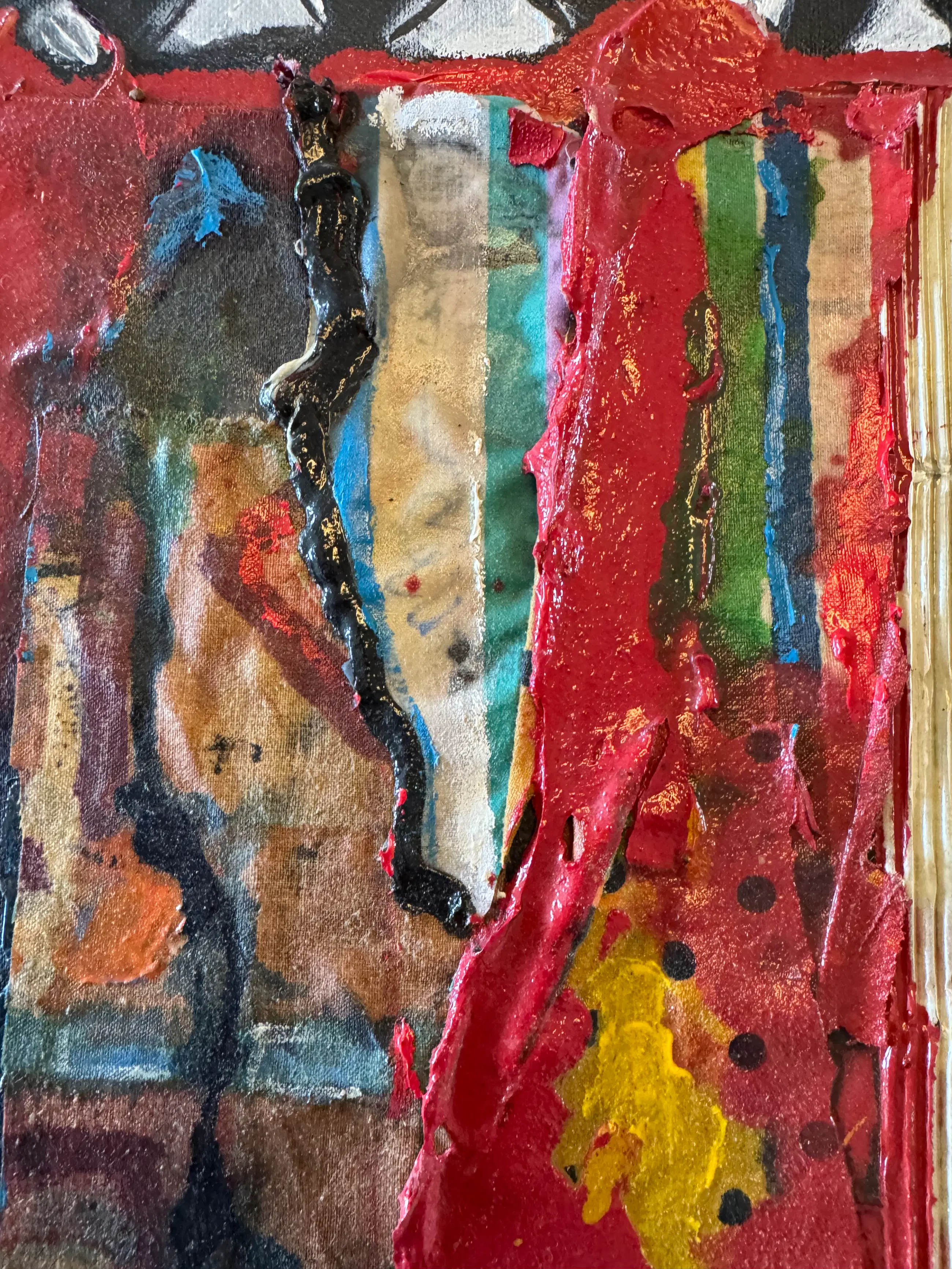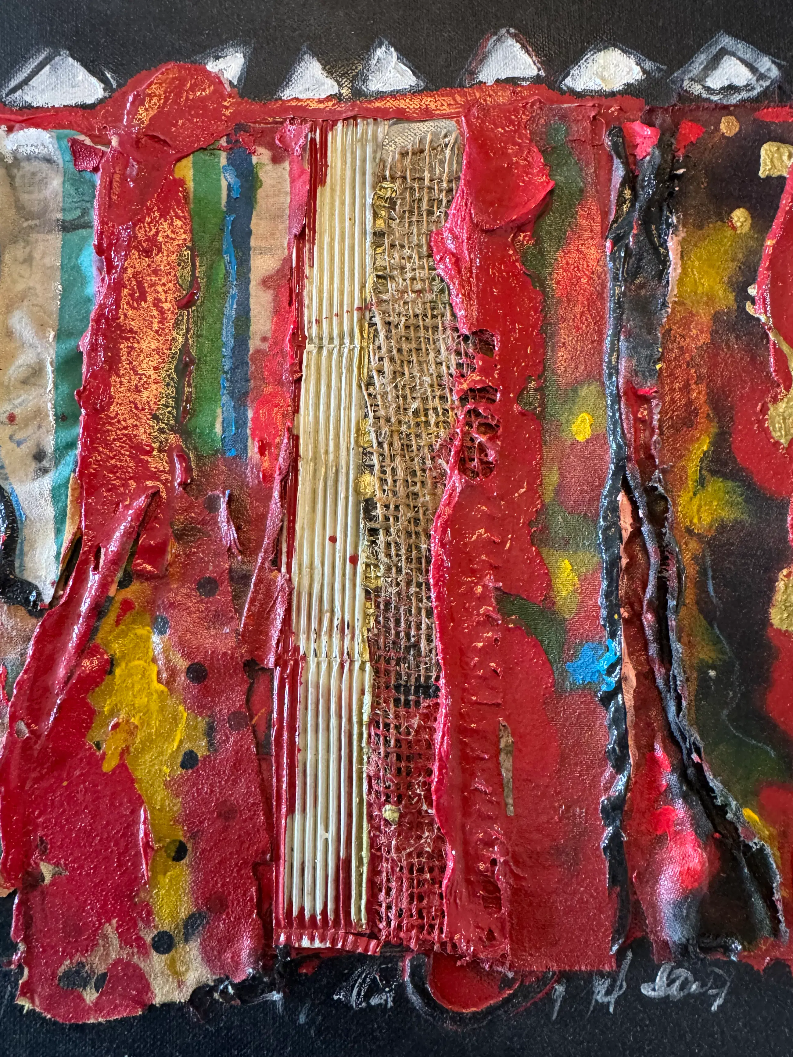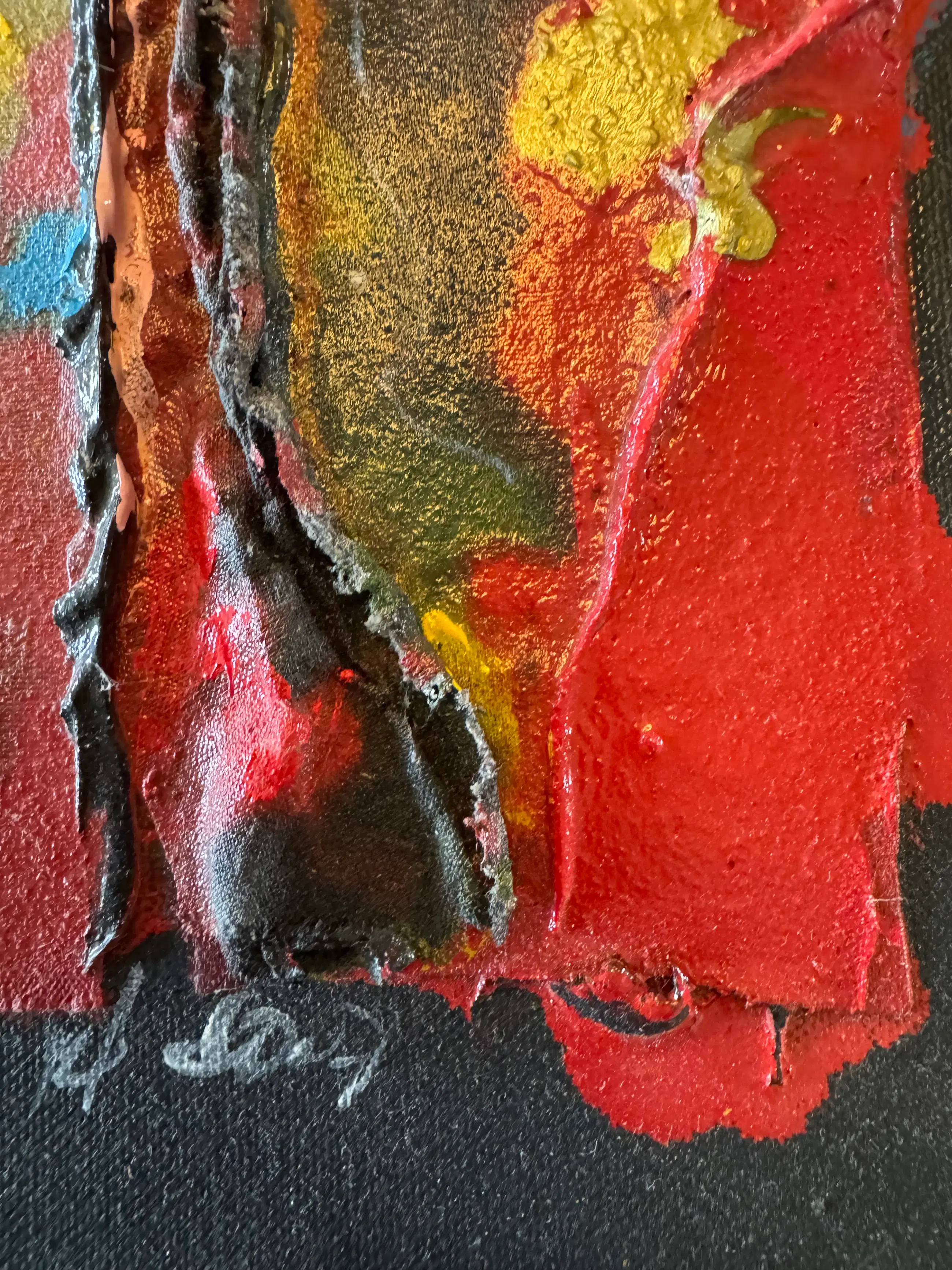 Kenmerkend werk op een zwarte achtergrond met felle kleuren en diverse materialen. 40 x 50 cm. Kan zo aan de muur.