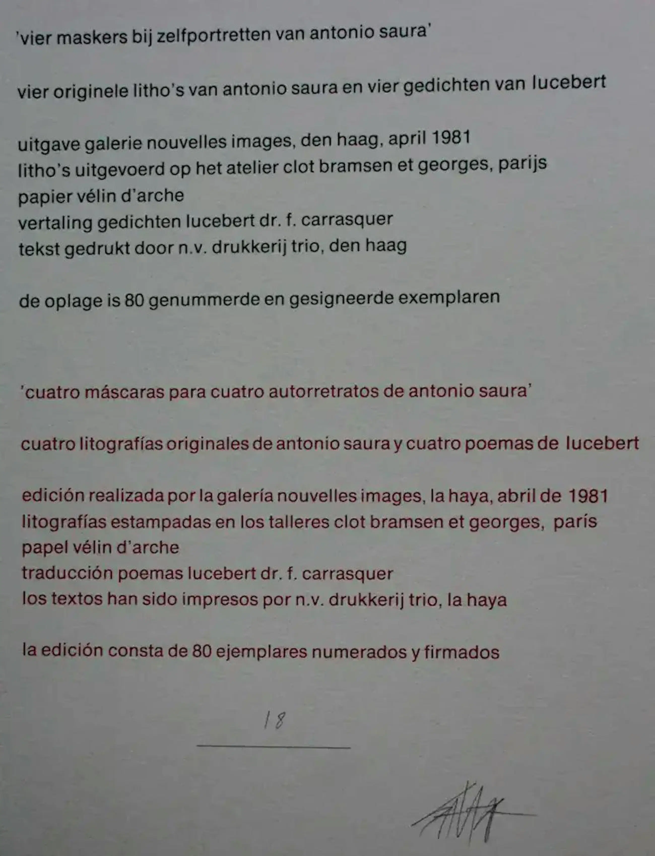 Uitgave Galerie Nouvelles Images, Den Haag, april 1981. Litho's uitgevoerd op het atelier Clot Bramsen et Georges, Parijs. Papier vélin d 'arche. Vertaling gedichten Lucebert Dr. F. Carrasquer. Tekst gedrukt door N.V. Drukkerij Trio, Den Haag. De bladen zijn opgenomen in Saura l'oevre, Catalogue Raisonee, Patrick Cramer Editeur, blz. 385 en blz. 386, 387, 388 en 389, getiteld "Quatro Mascaras". Bladformaat: 67 cm bij 48,5 cm, beeldformaat: 59,5 cm bij 42 cm. Afmetingen map: H67 x b50cm. De werken zijn rechts onderaan gesigneerd door de kunstenaar.