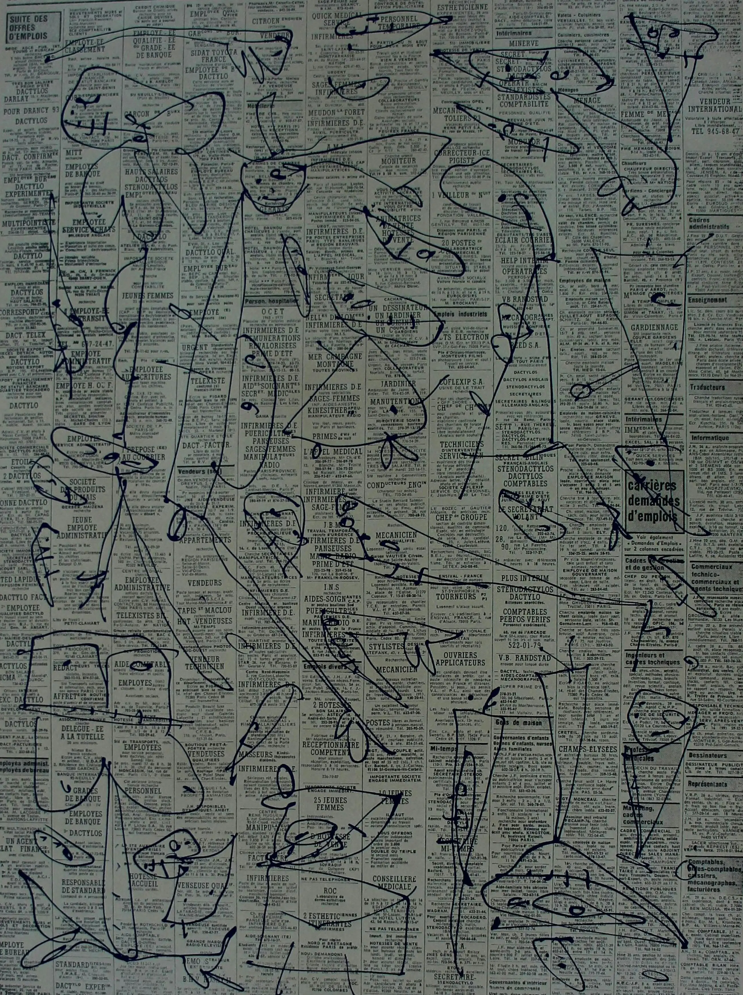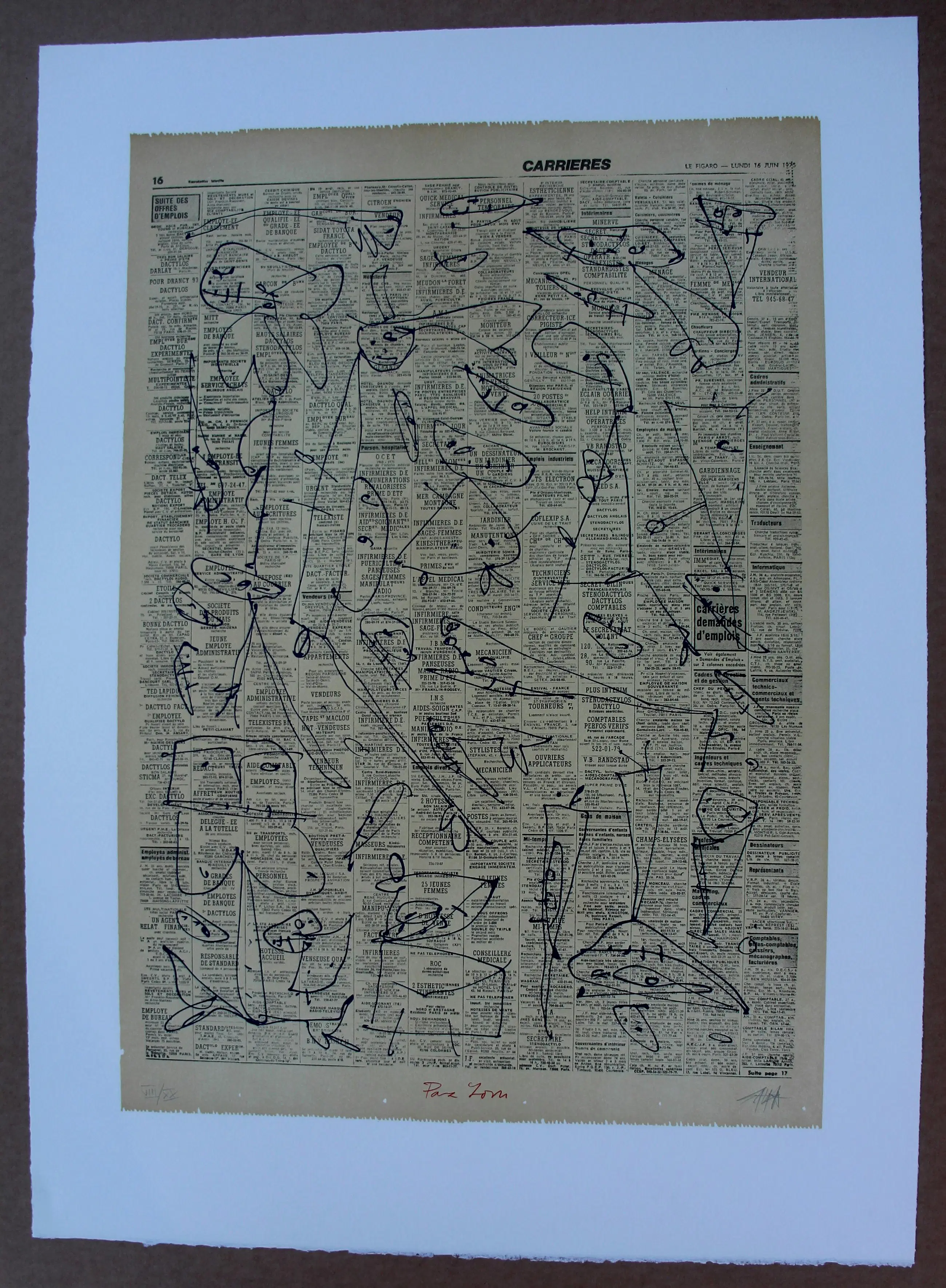 Litho van Antonia Saura uit 1976. Titel: pour Jorn. Oplage: VIII/XX. Afmetingen blad: H75 x b54cm. Afmetingen voorstelling: H60 x b42cm. Het werk is rechtsonder, met potlood, gesigneerd en gedateerd door de kunstenaar. De authenticiteit van dit werk wordt volledig gegarandeerd. Een certificaat van echtheid kan, op aanvraag, worden gemaild.