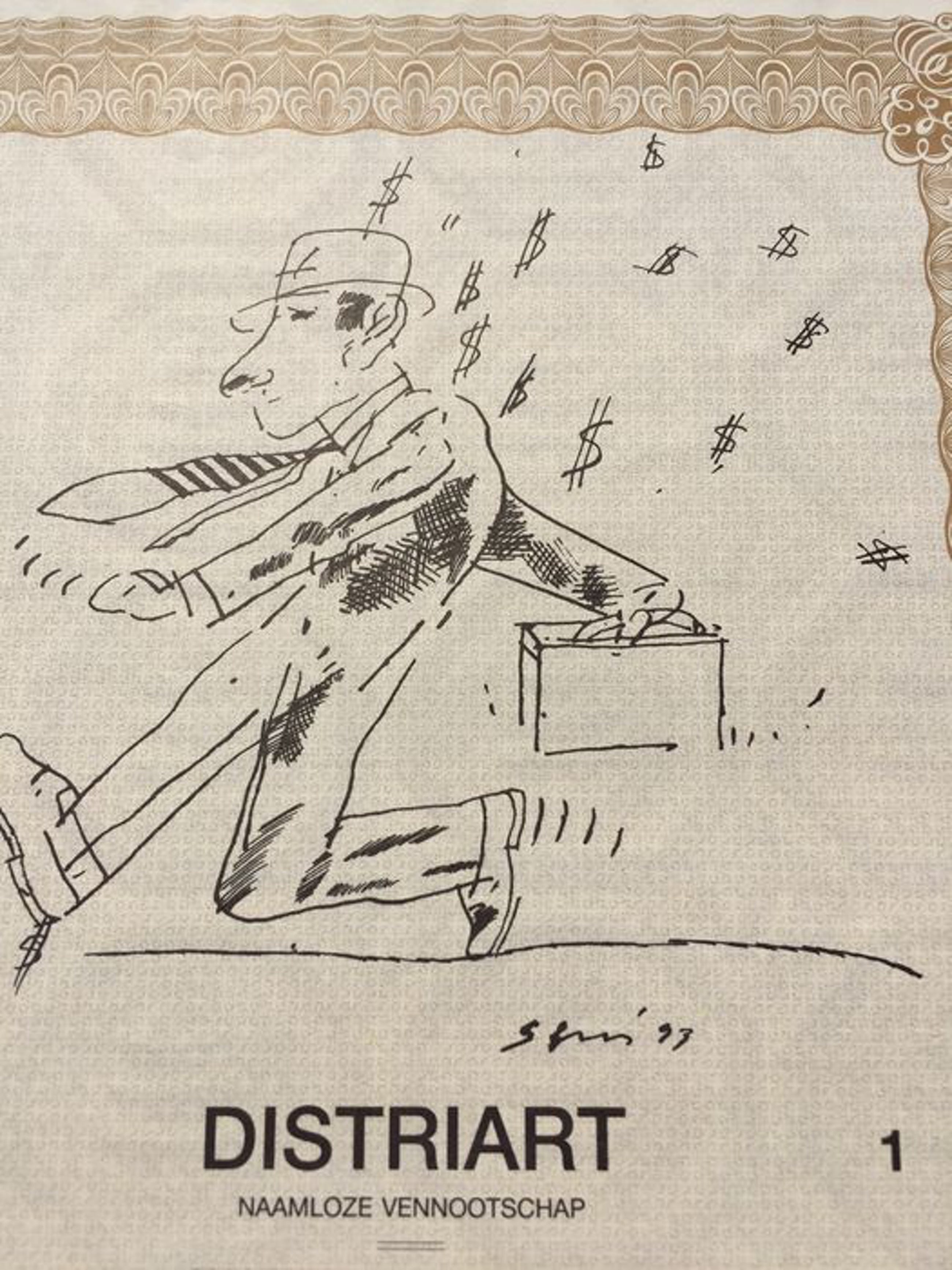 Antonio Segui Werk speciaal vervaardigd voor dit aandeel. Genummerd aandeel met coupon Techniek; Offsetprint gesigneerd in de druk. maten; 44 x 32 cm in perfecte staat. nummering op de foto wijkt af. Titel; Distriart Belgie Uitgver; Distriart N.V. Gallery Forum, Oosteinde 1987 Oorspronkelijk zouden er 1000 aandelen worden uitgegeven door 100 kunstenaars. De oplage was uiteindelijk slechts 16 exemplaren. Het aandeel van Segui is nummer 0.009.528 Op de achterkant; Uitreksel van de statuten van Distriart