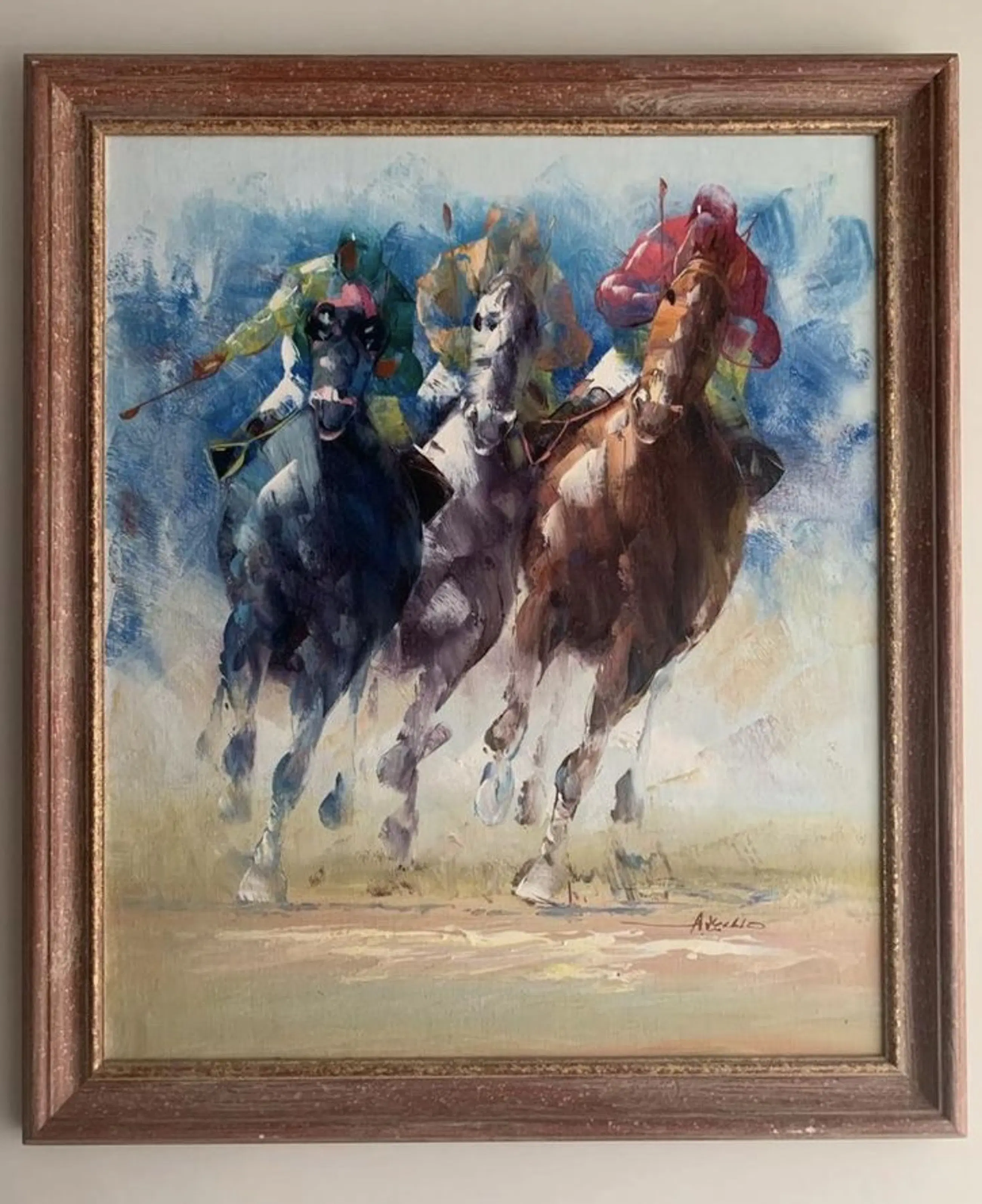 Prachtig, pastelkleurig schilderij van de Amerikaanse kunstschilder Antonio Veccio (geboren in 1949). Het schilderij toont een levendige paarden polo wedstrijd met drie paarden en jockeys. Veccio, een echte paardensport kunstenaar, heeft dit impressionistische werk met olieverf en paletmessen op board gecreëerd. Het schilderij is rechtsonder gesigneerd met 'A. Veccio' en wordt geleverd inclusief lijst. Een origineel en sfeervol kunstwerk, zeker voor de liefhebbers van paardensport en deze kunstschilder. Graag ophalen in Den Bosch of Amsterdam. Verzending in overleg