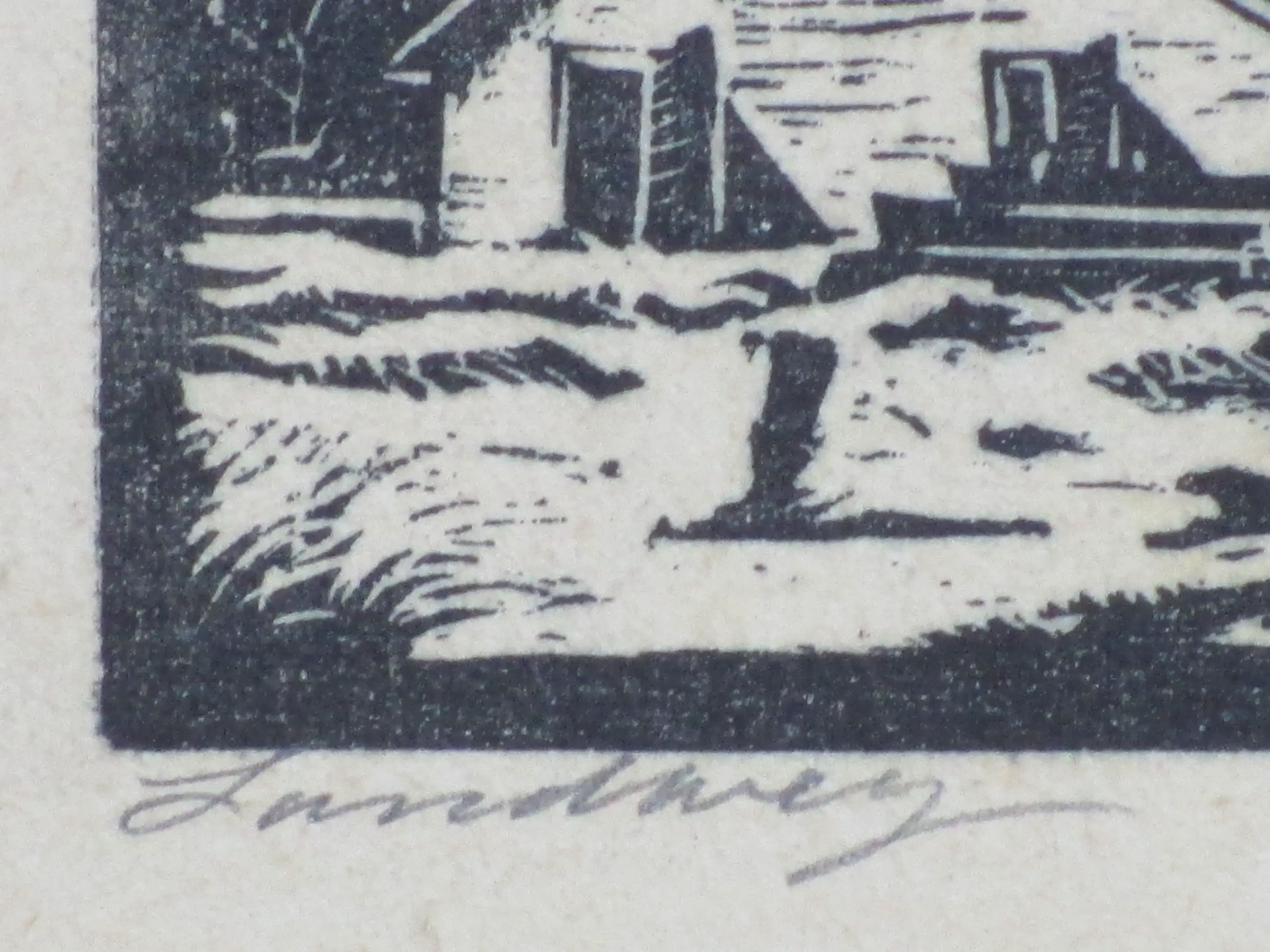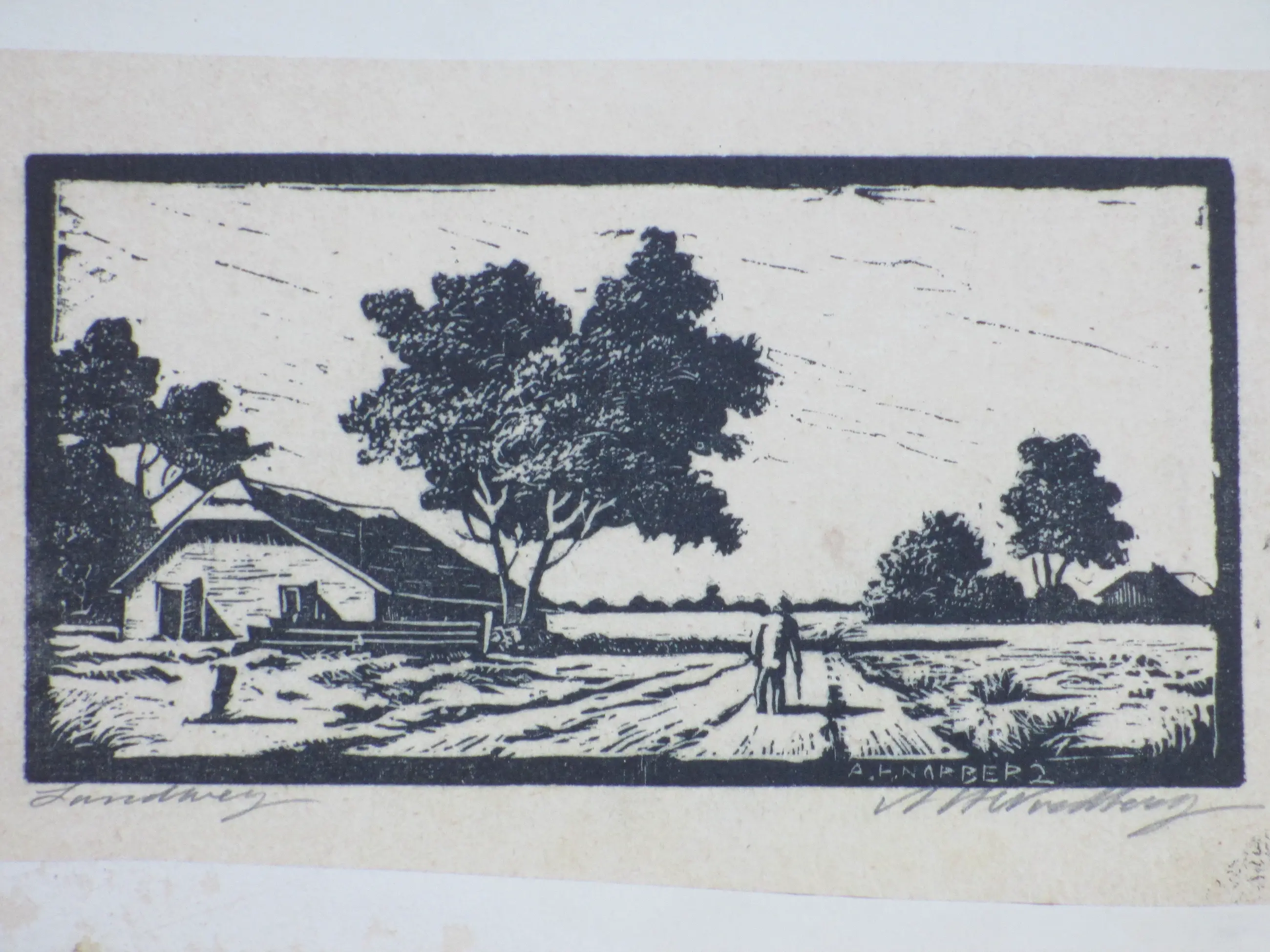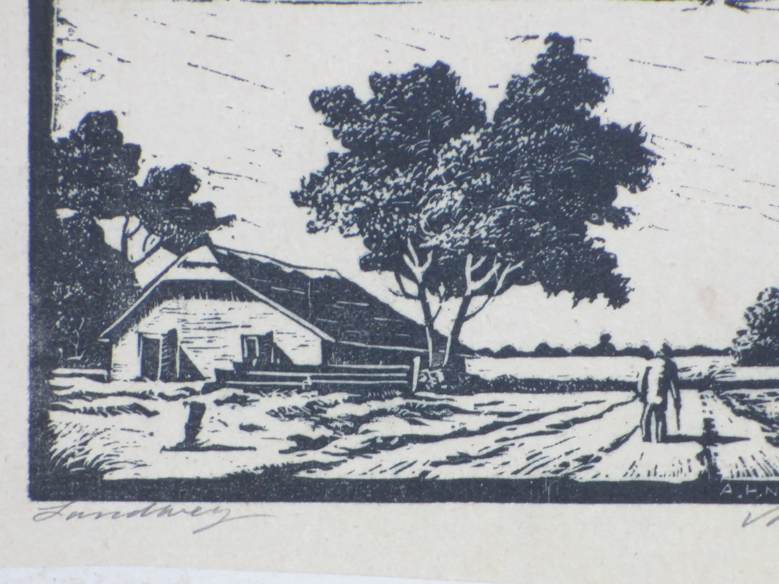 Houtsnede door Antonius Hubertus Nordberg Voorstelling van een boer op een landweg bij boerderij Losbladig, getipt op onderblad, beeldmaat 12x22, bladmaat 17x26 Gesigneerd in potlood r.o.: 'A H Nordberg' Getiteld in potlood l.o.: 'Landweg' Authenticiteit volledig gegarandeerd