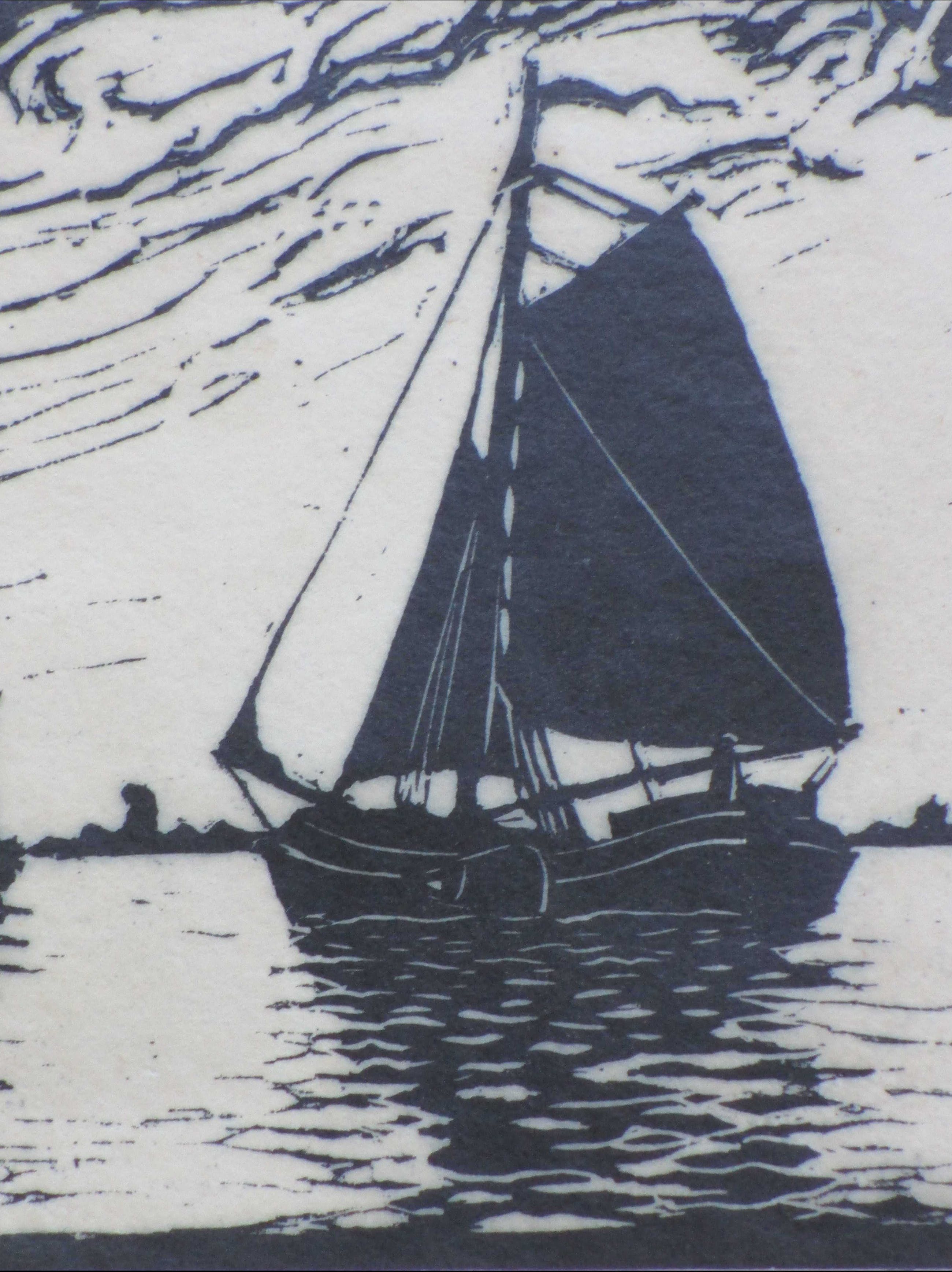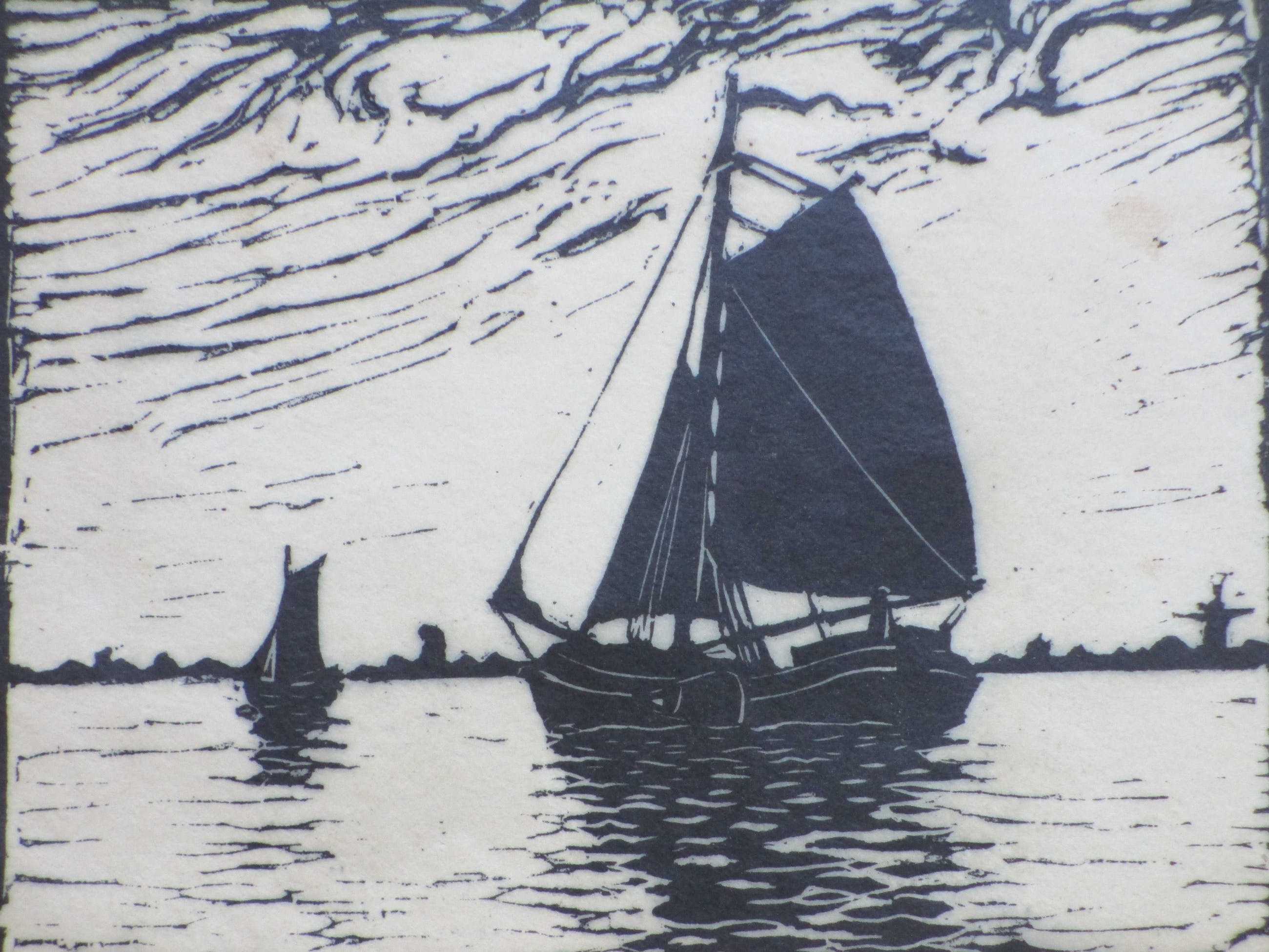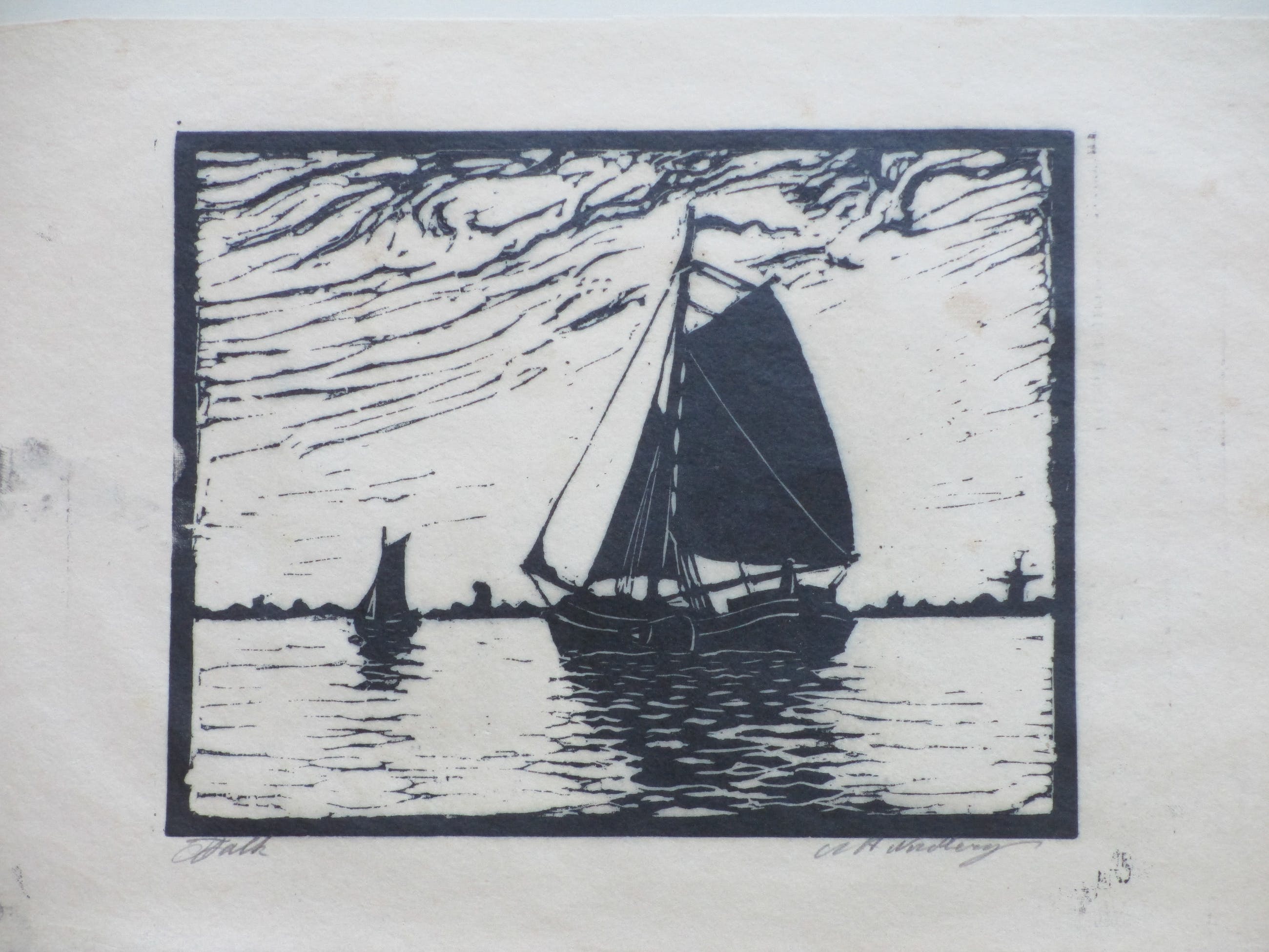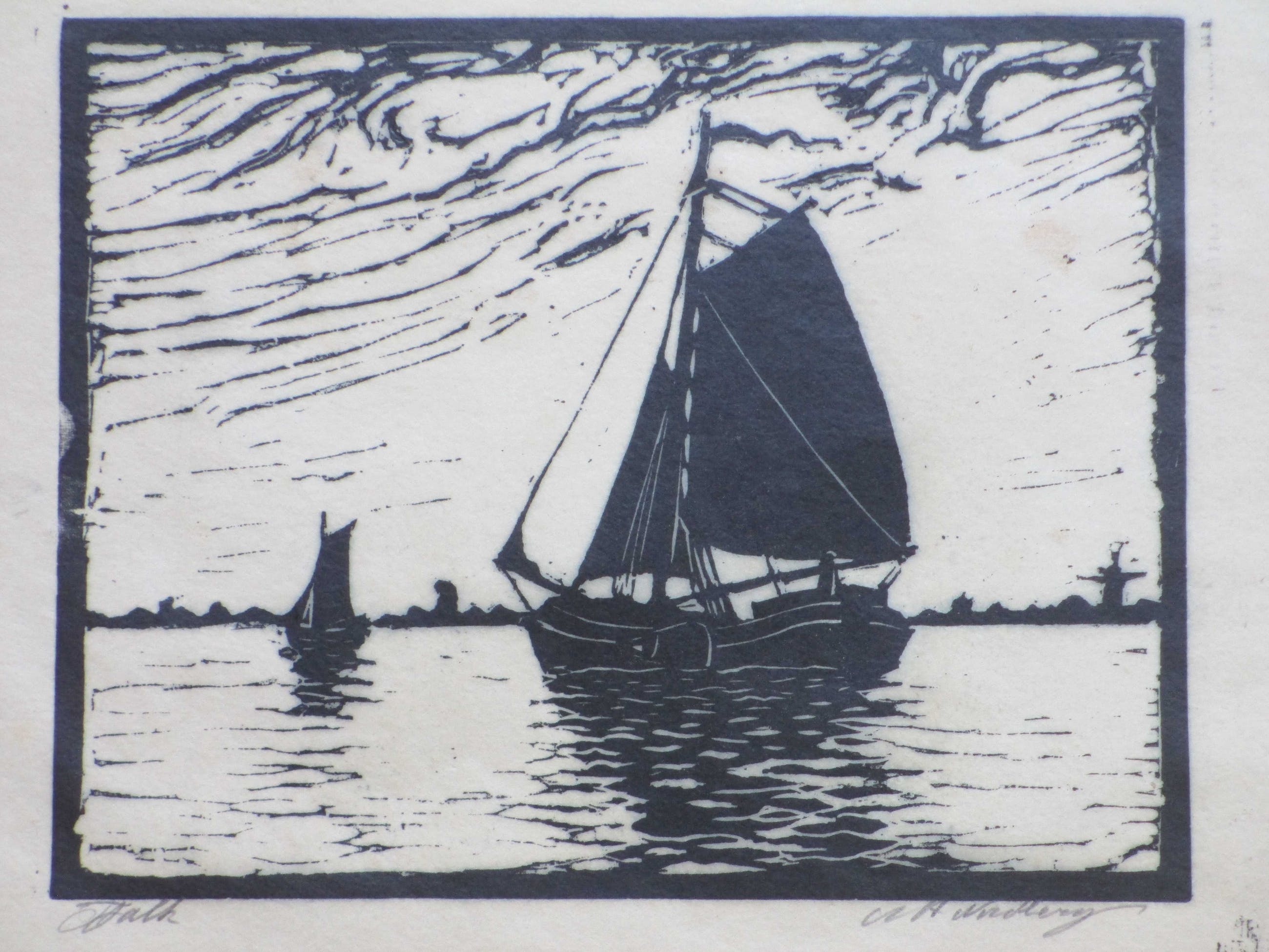 Houtsnede door A.H. Nordberg. Voorstelling van een tjalk op een Hollands water. Losbladig, beeldmaat 17x22, bladmaat 23x34 Gesigneerd in potlood rechtsonder: 'A.H. Nordberg' Getiteld in potlood linksonder: 'Tjalk' Authenticiteit volledig gegarandeerd