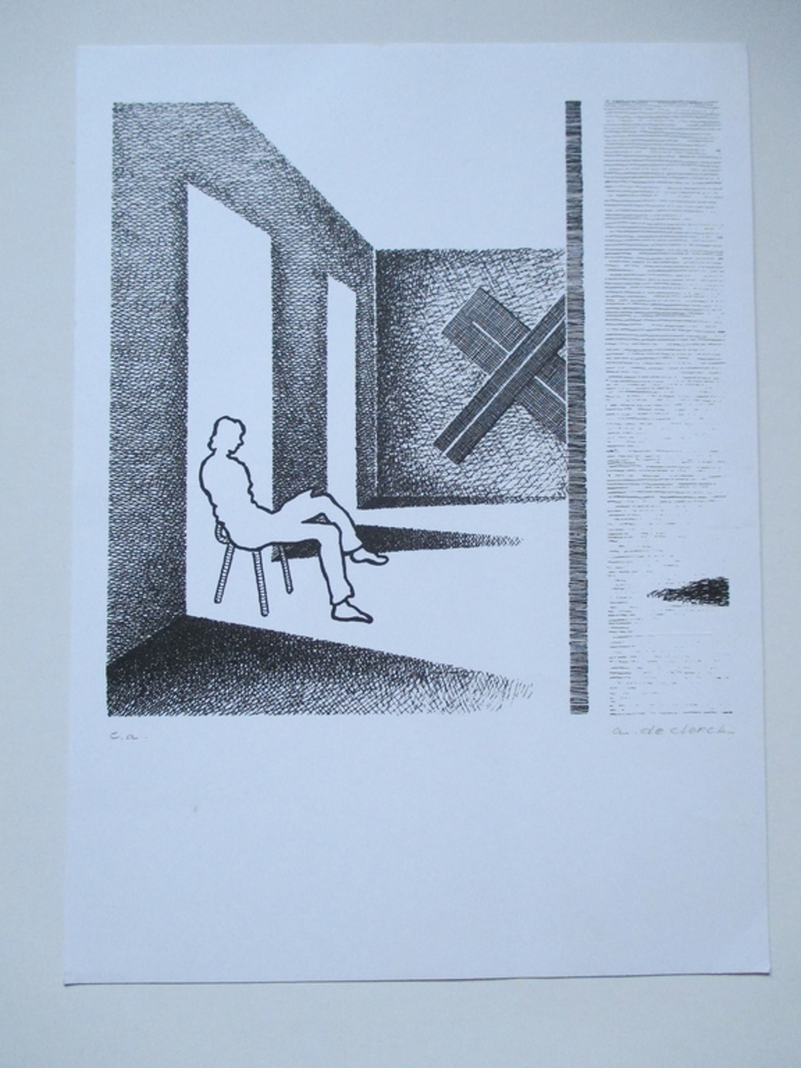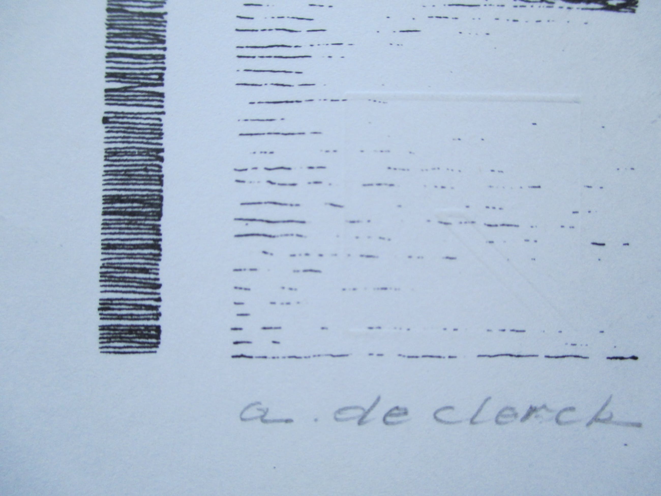 Grafiek van A. de Clerck, e.a, r.o gesigneerd in potlood. Afm. Blad 21x28,5 cm. Van boven naar beneden loopt een vouw over het blad iets rechts van het midden. De foto's zijn wat blauw uitgevallen, het papier is wit.